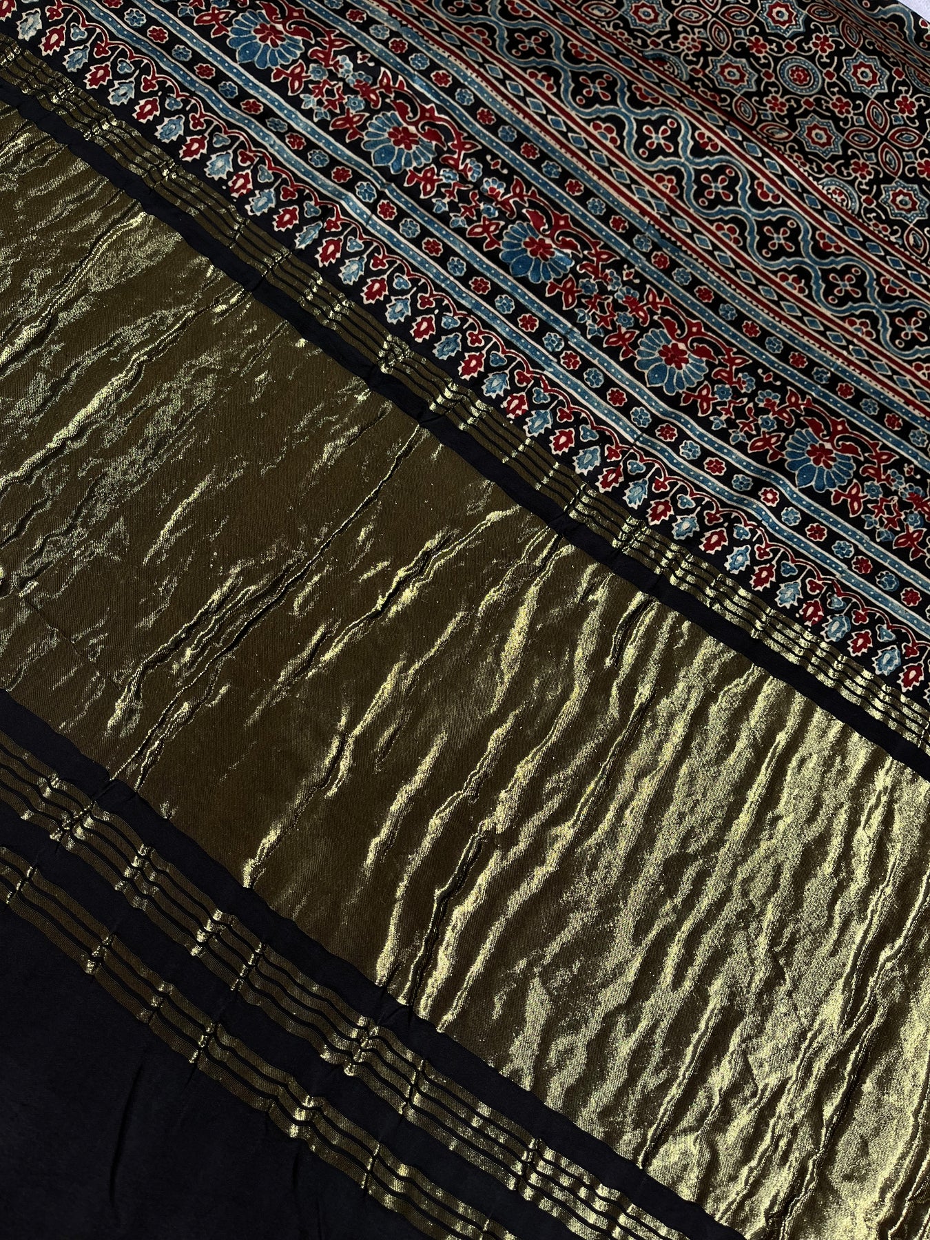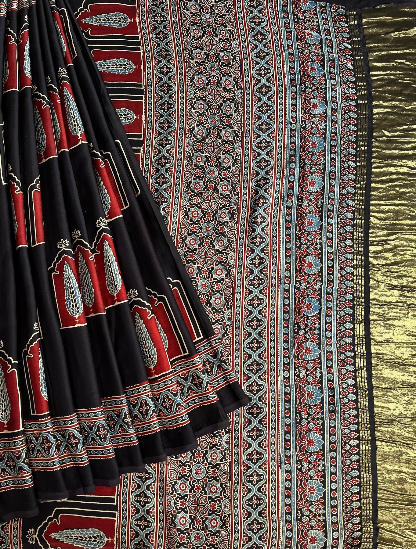 JAISVI: Handblock Modal Silk Tissue Ajrakh Saree