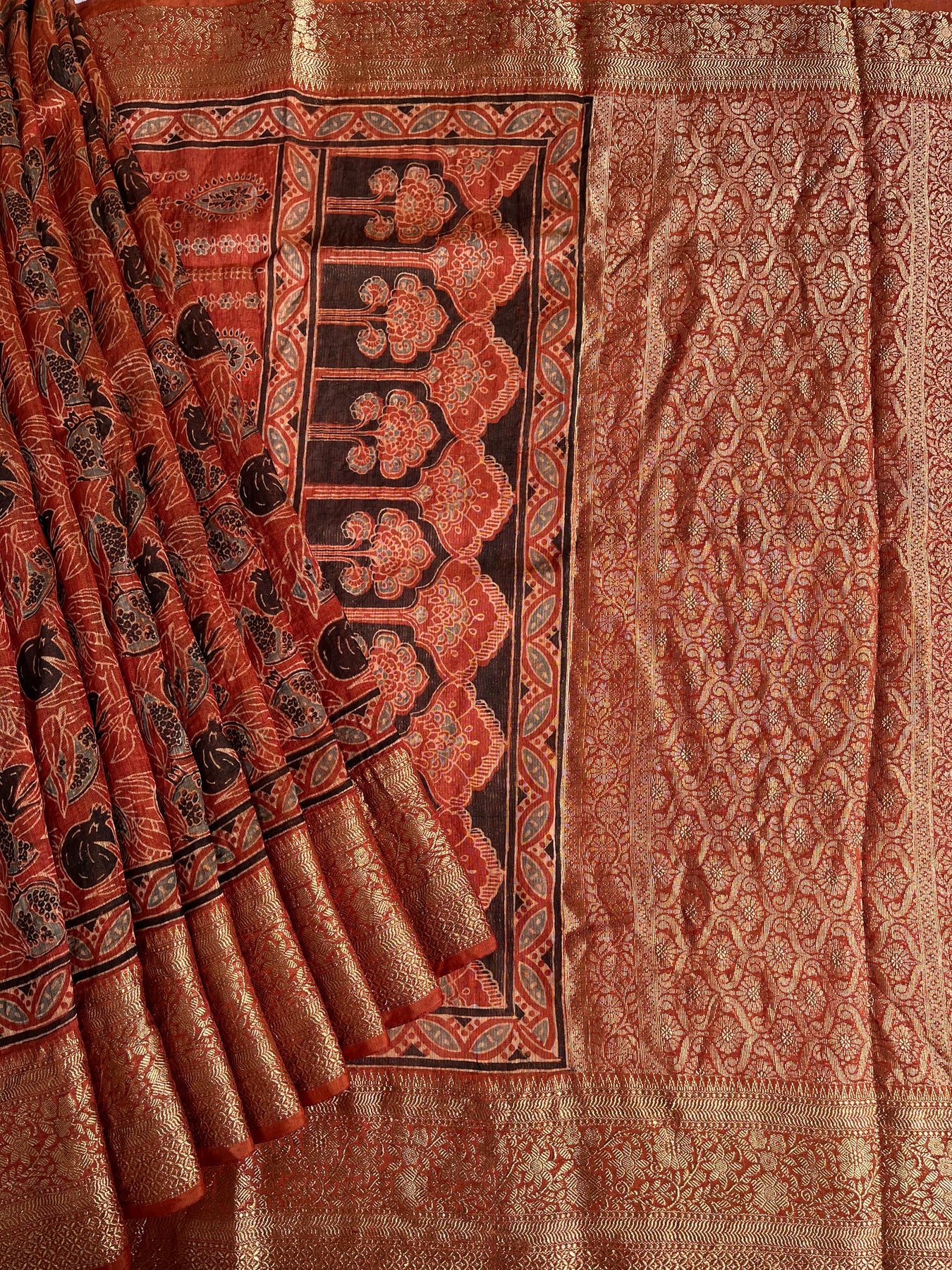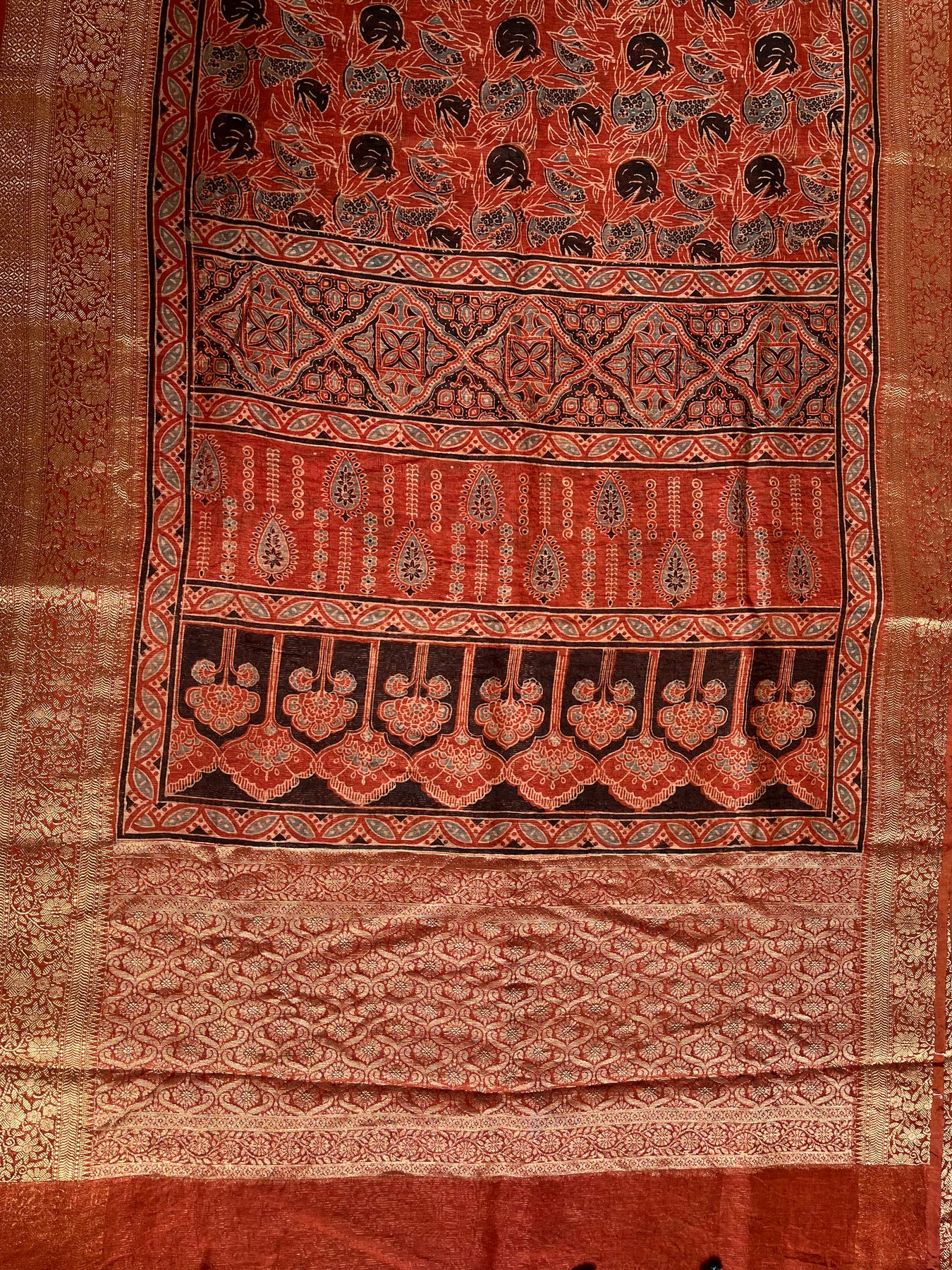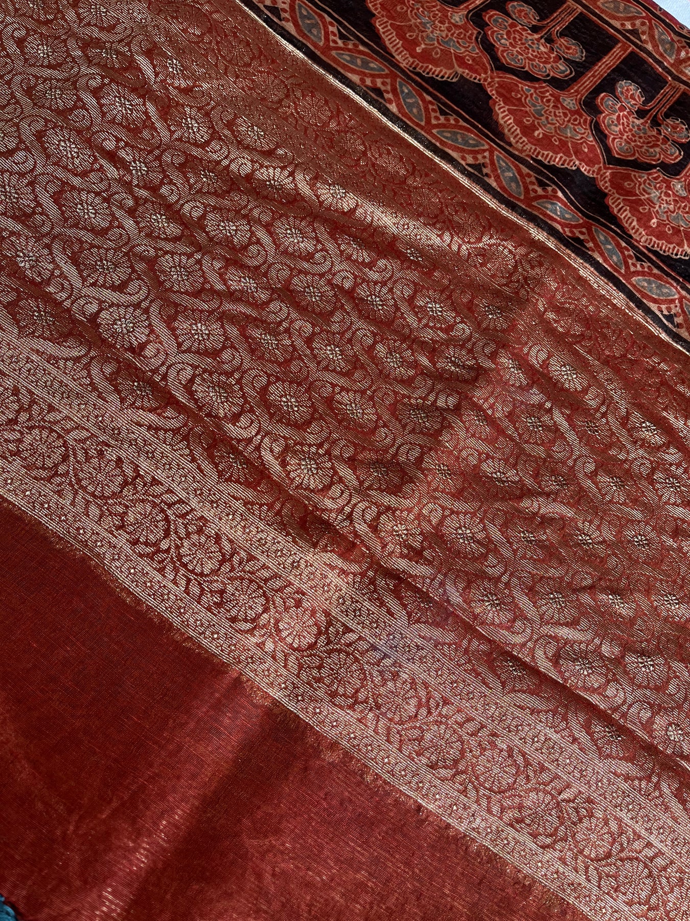 KAVYANJALI: HANDBLOCK AJRAKH PURE SILK-LINEN SAREE with MEENAKARI BORDER