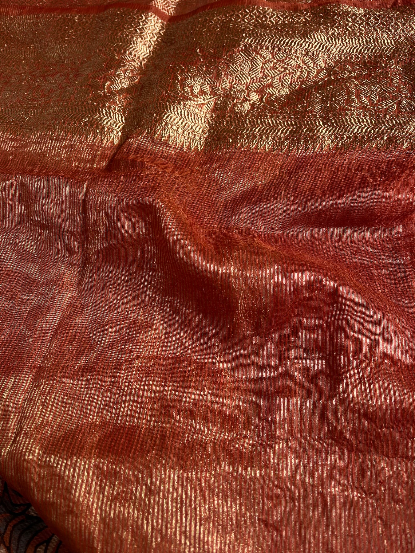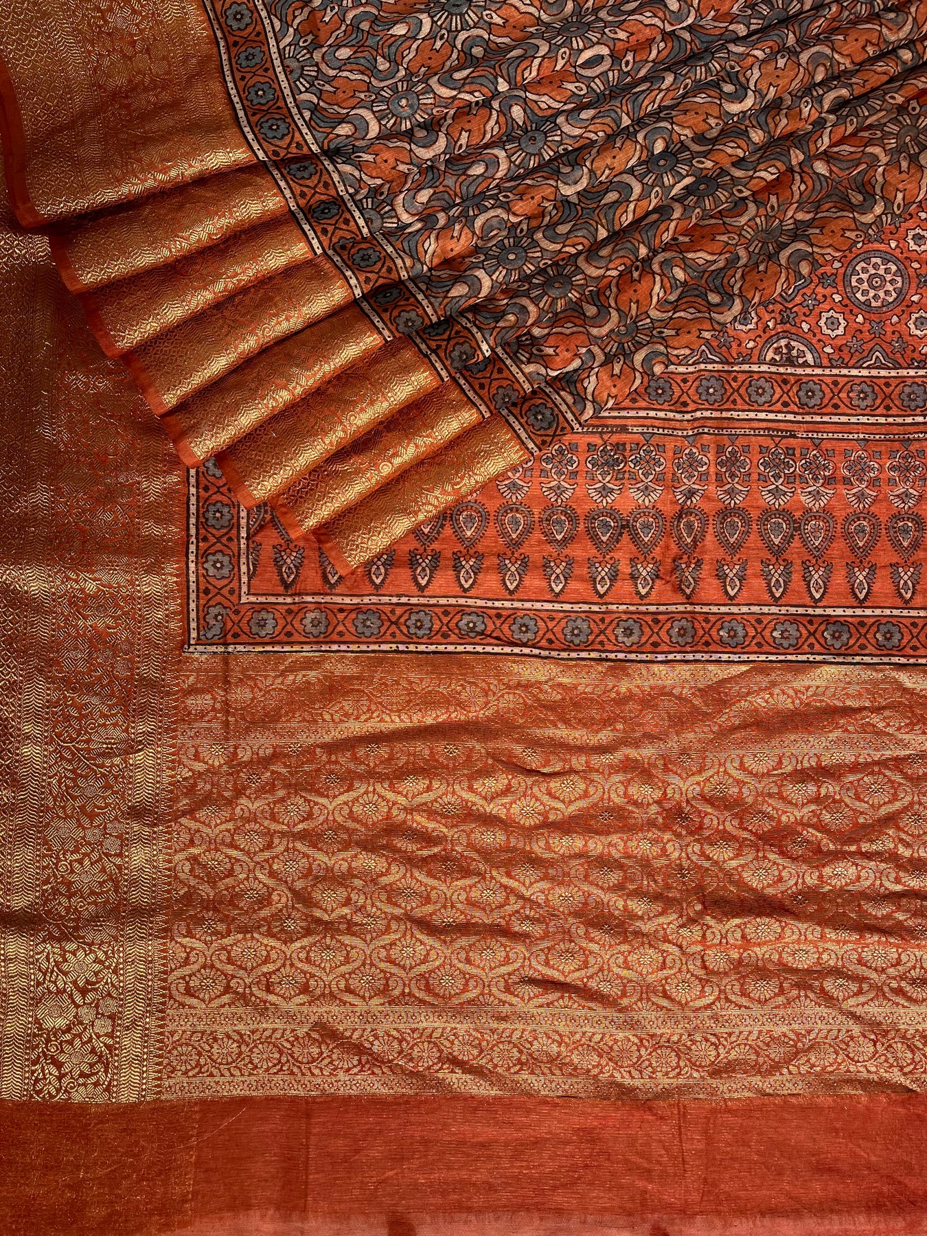 MEENAKSHI: HANDBLOCK AJRAKH PURE SILK-LINEN SAREE with MEENAKARI BORDER