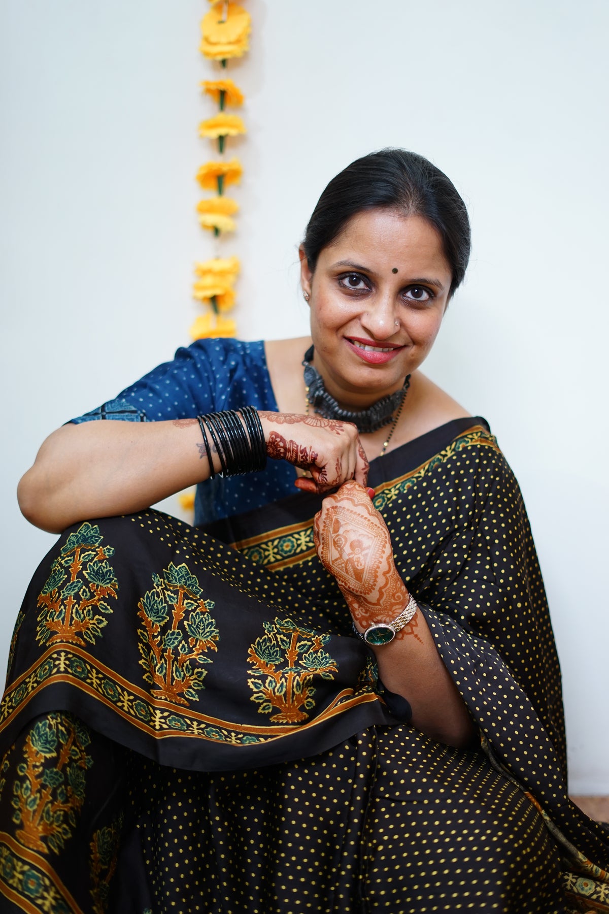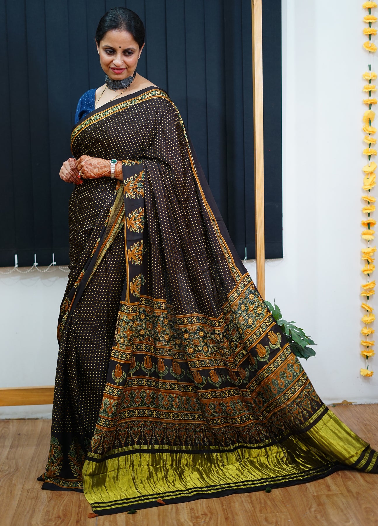 TARA: Handblock Modal Silk Tissue Ajrakh Saree