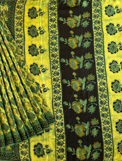 Ajrakh bandhani modal silk saree: This type of saree is made from modal silk, which is a type of fabric that is made from beech wood pulp. It is known for its soft and smooth texture. The Ajrakh Bandhani Modal Silk saree is a stunning example of traditional Indian textile artistry. It combines two separate techniques: Ajrakh printing, which is noted for its elaborate geometric designs and rich natural dyes, and Bandhani, a tie-dye procedure that produces small, colourful dots called 'bandhas.' This saree displays elegance and sophistication, thanks to its beautiful Modal Silk fabric, which is known for its softness and gloss. Each piece is skillfully made by experienced artisans to reflect centuries of history and cultural heritage. The end product is a stunning blend of workmanship and beauty, reflecting the essence of Indian textile heritage in a timeless and magnificent garment.