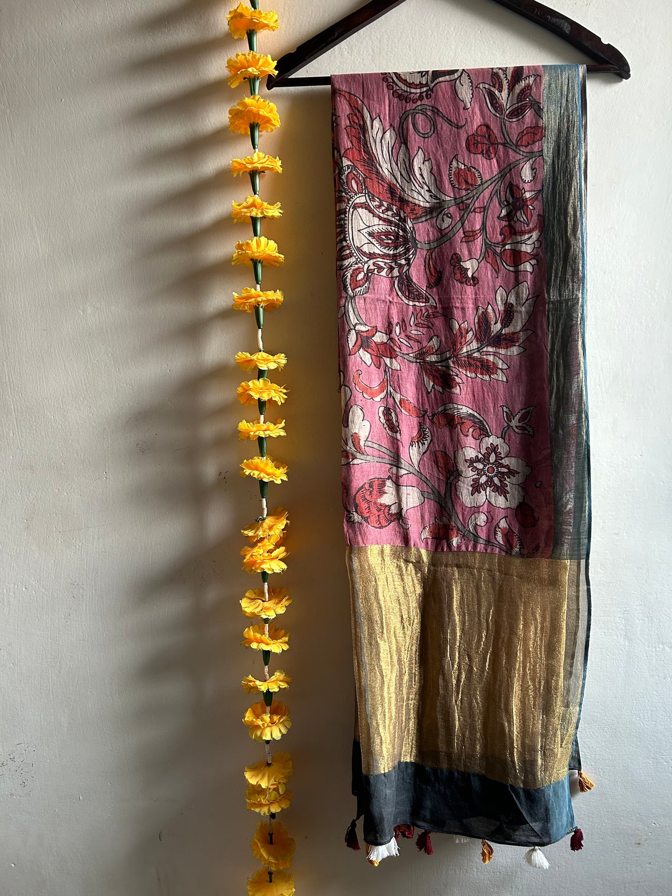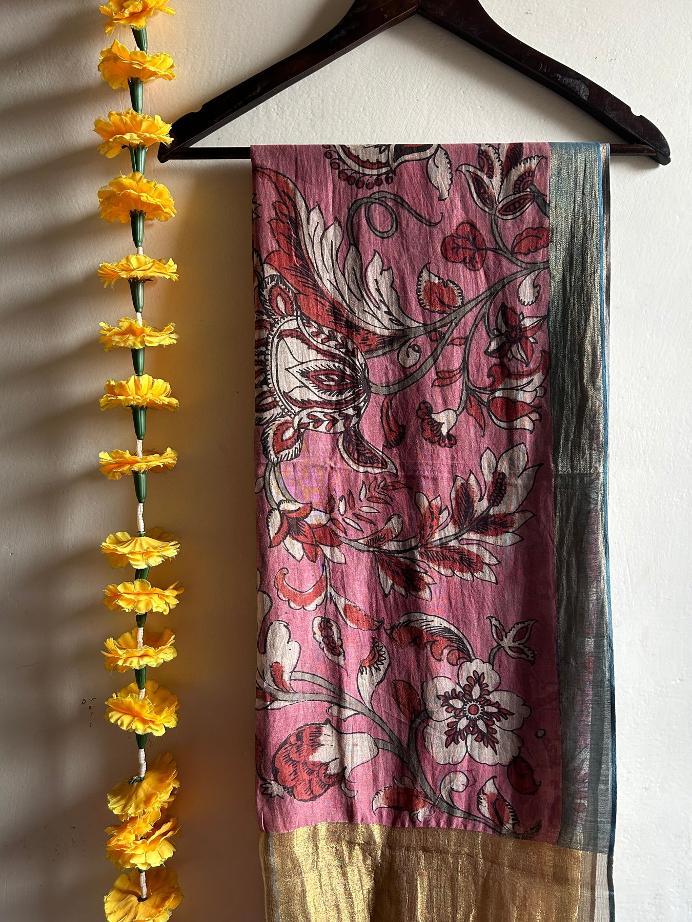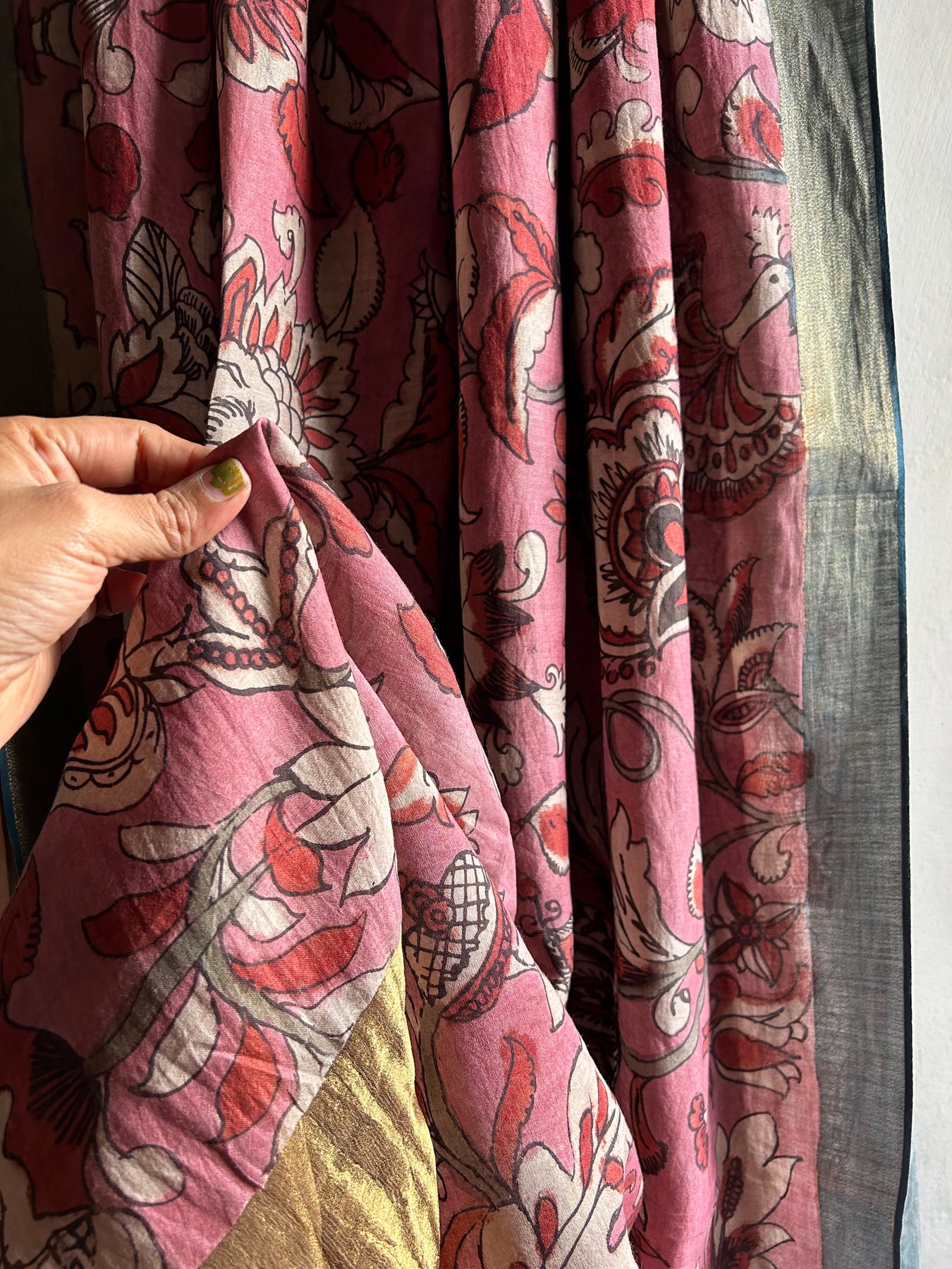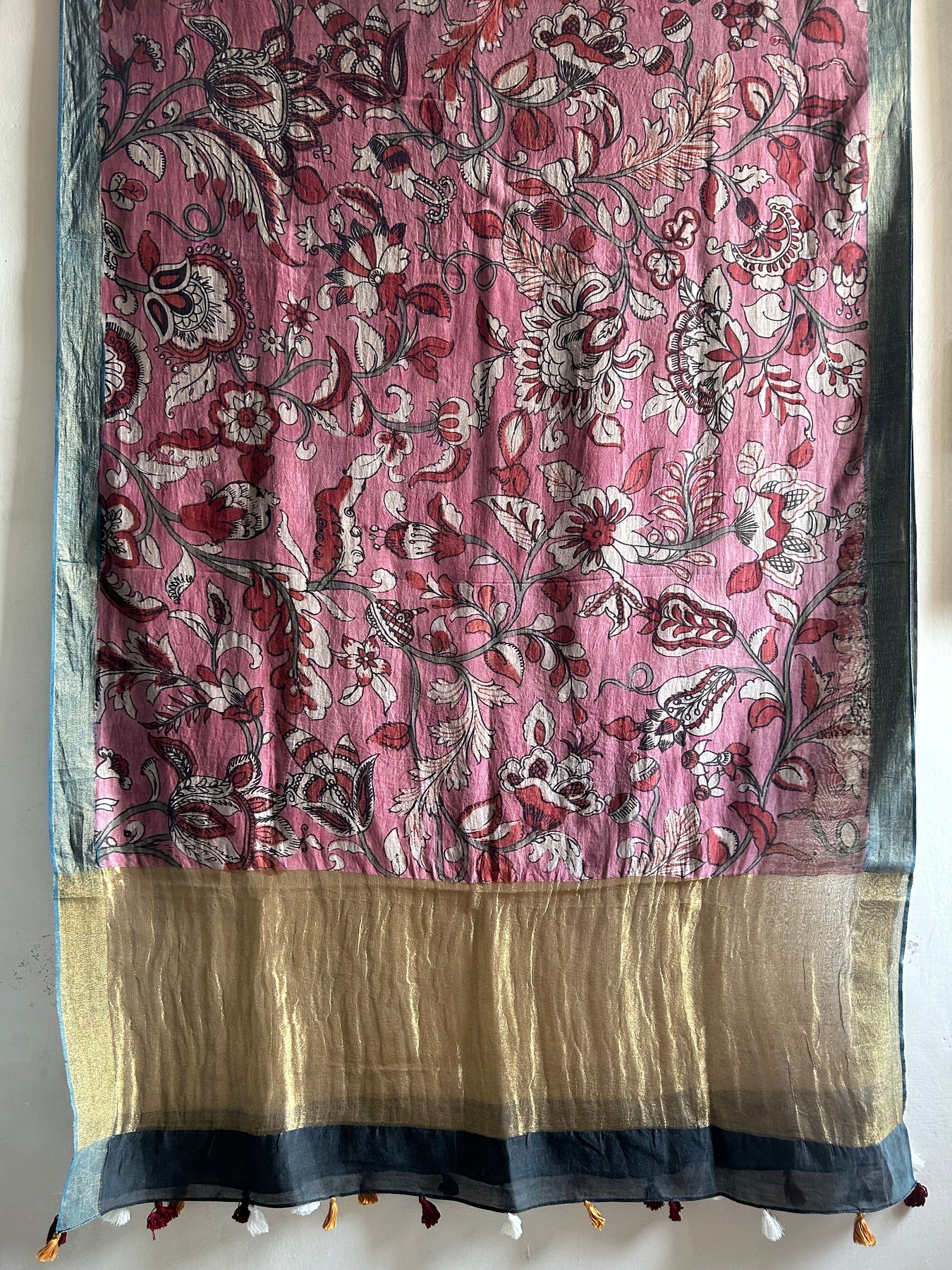 The authentic pen-kalamkari dupatta on chanderi .Pen-Kalamkari or Hand-painted kalamkari is an-ancient heritage craft of India, mainly in Sri-kalahasti located in Andhra Pradesh.