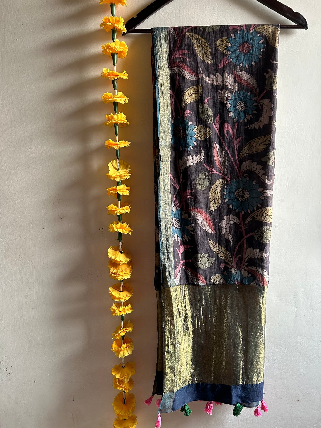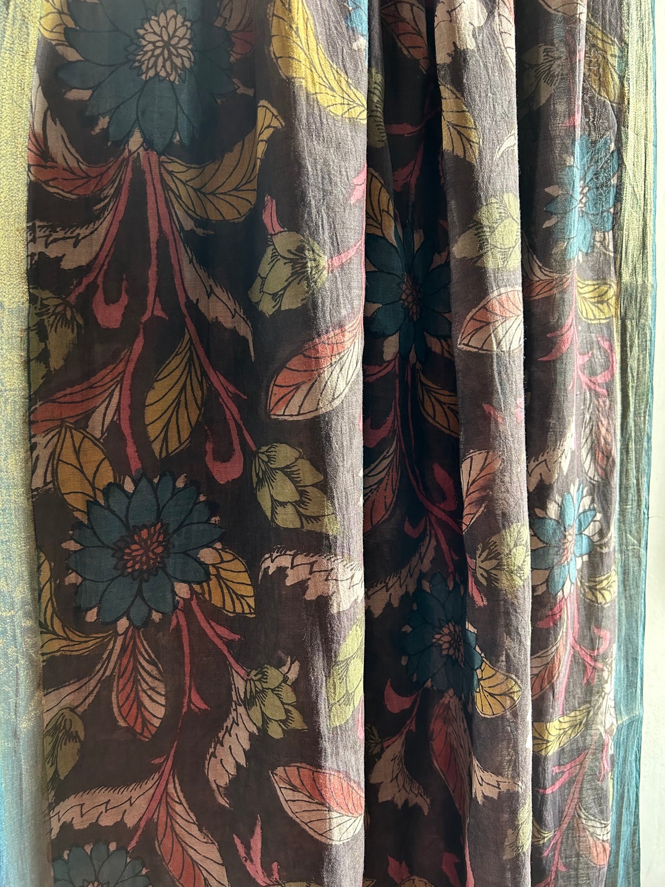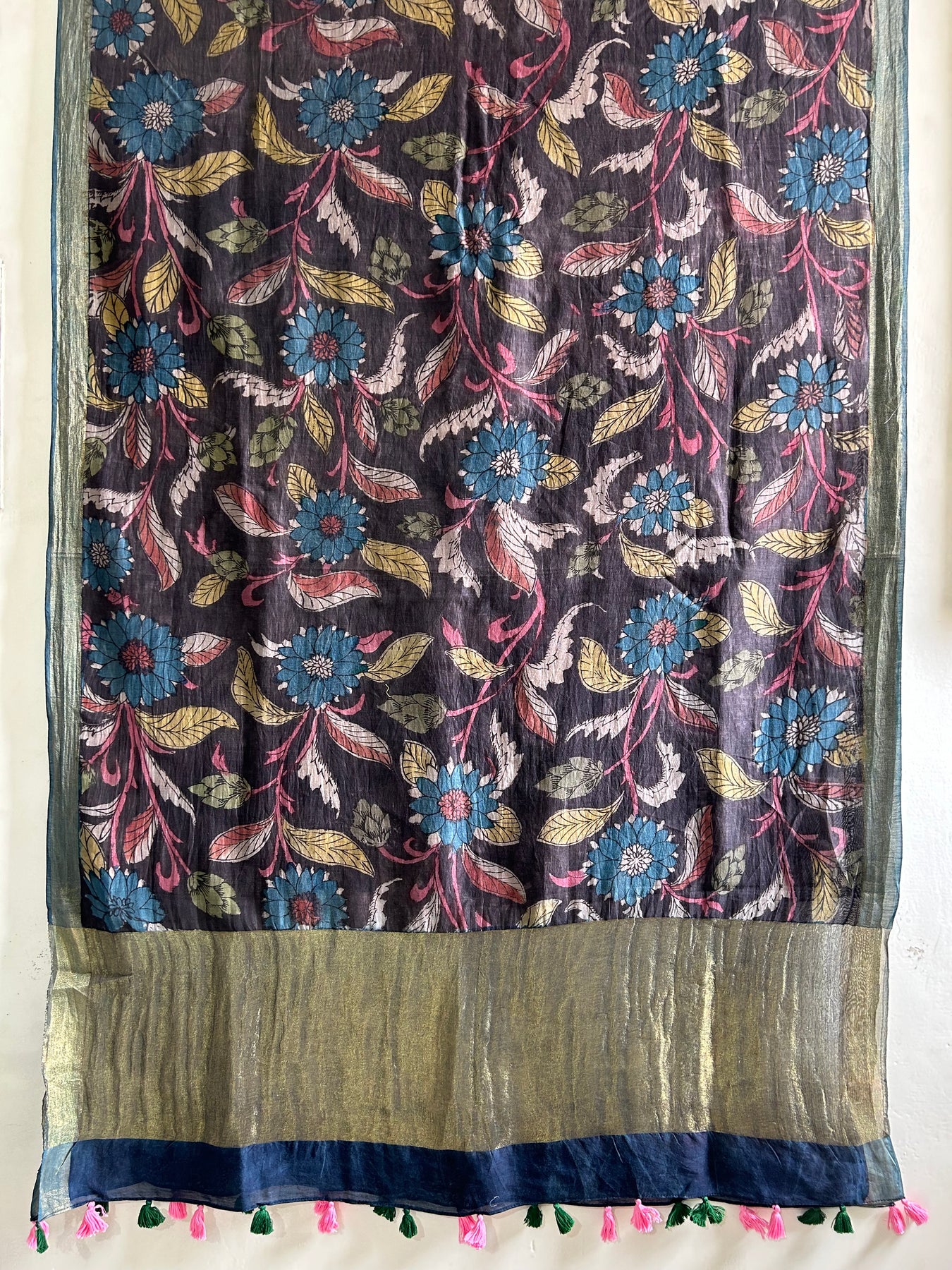 The authentic pen-kalamkari dupatta on chanderi .Pen-Kalamkari or Hand-painted kalamkari is an-ancient heritage craft of India, mainly in Sri-kalahasti located in Andhra Pradesh.