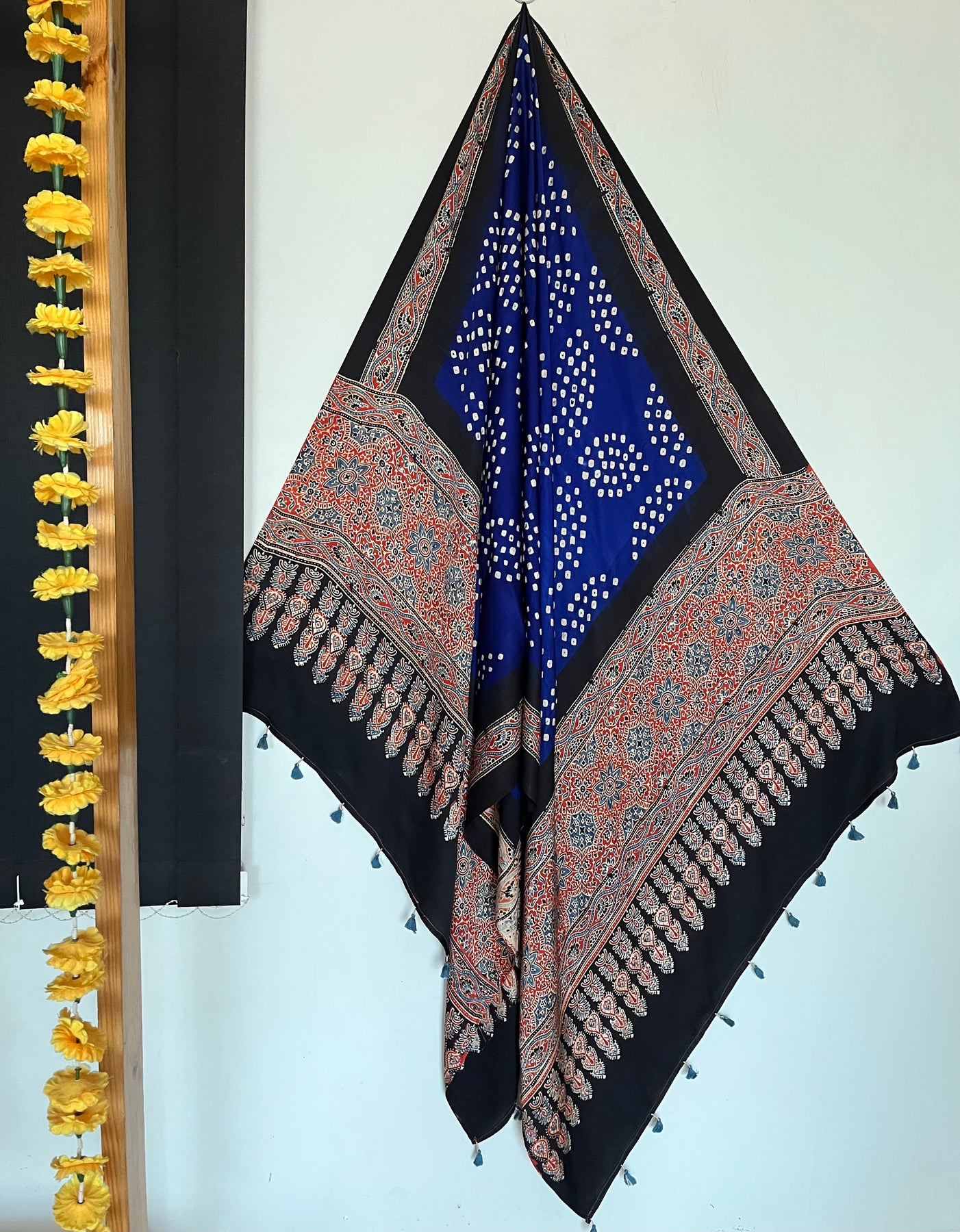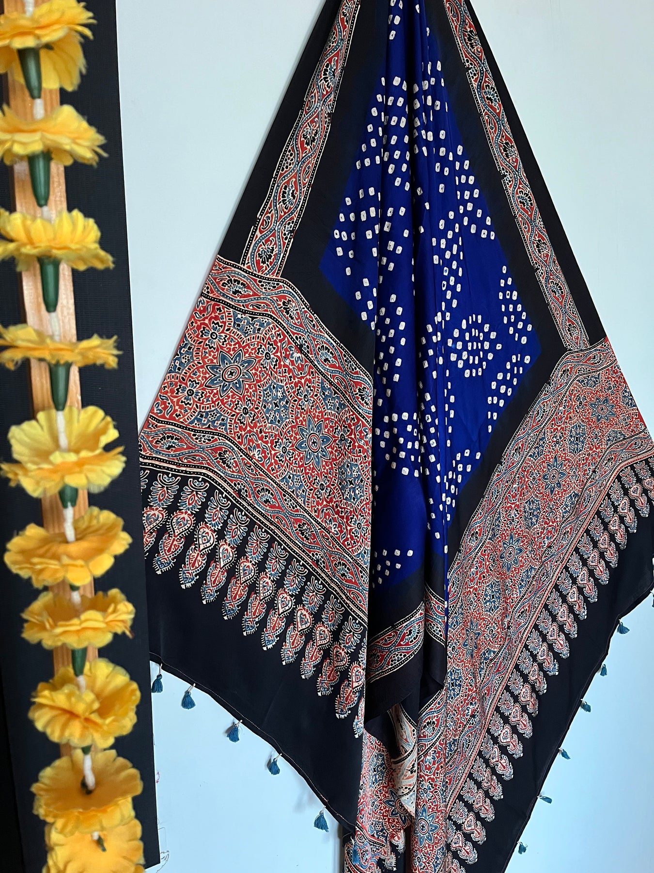 Material: Handblock printed modal silk ajrakh - Bandhej shawl accessorised with tassels.
