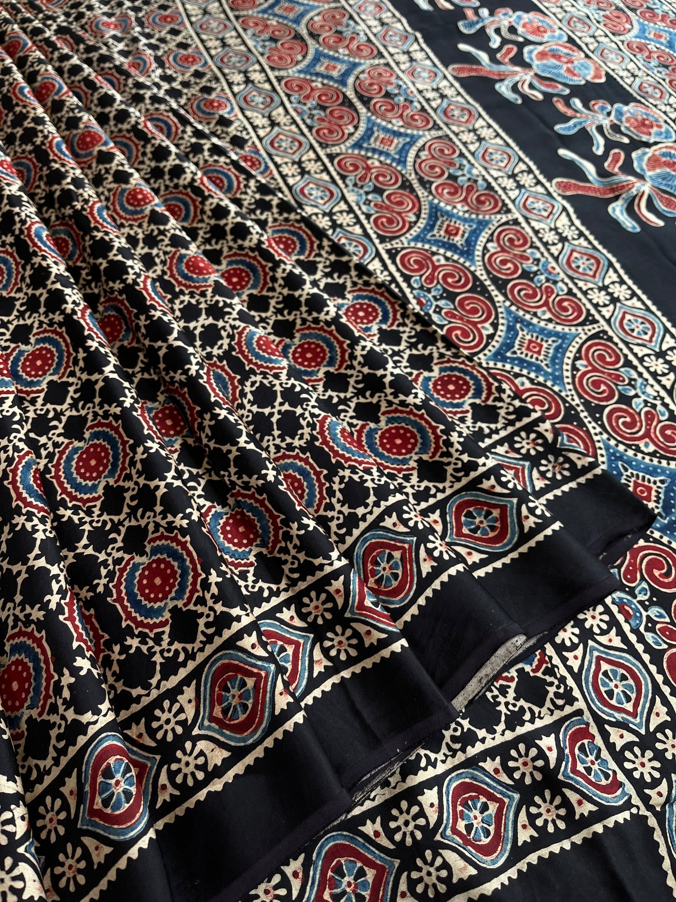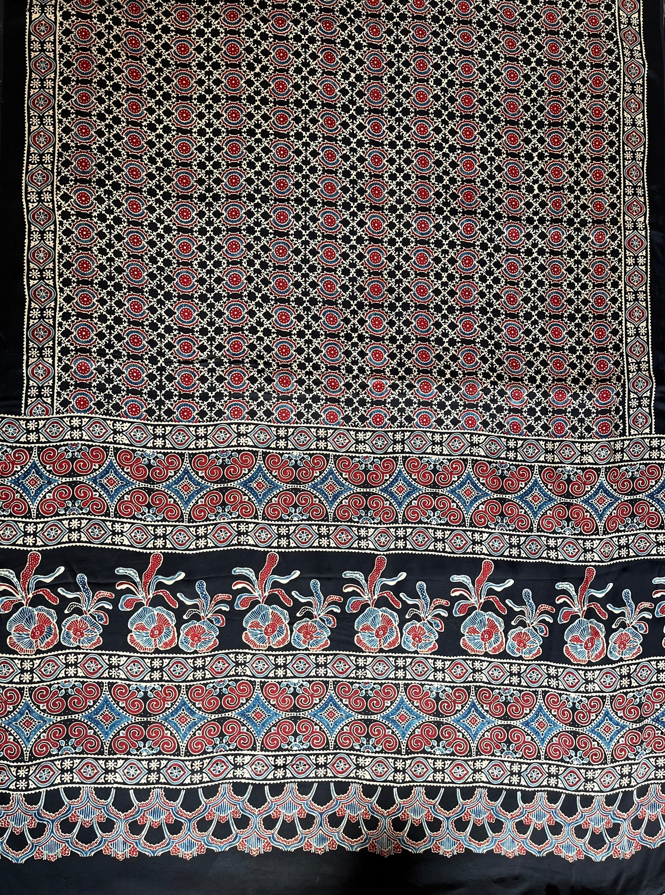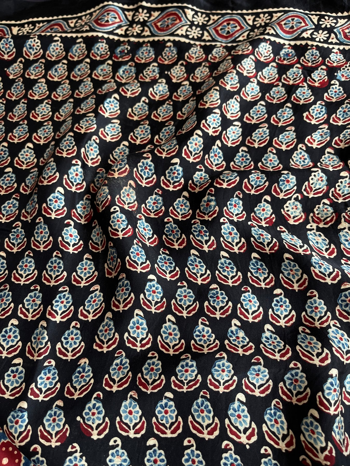 Ajrakh is a thousand year old art performed by ‘ khatri” community from kutch, Gujrat. It’s a multistage printing process completed in 14-21 steps and only natural colors are used in dyeing and printing process.