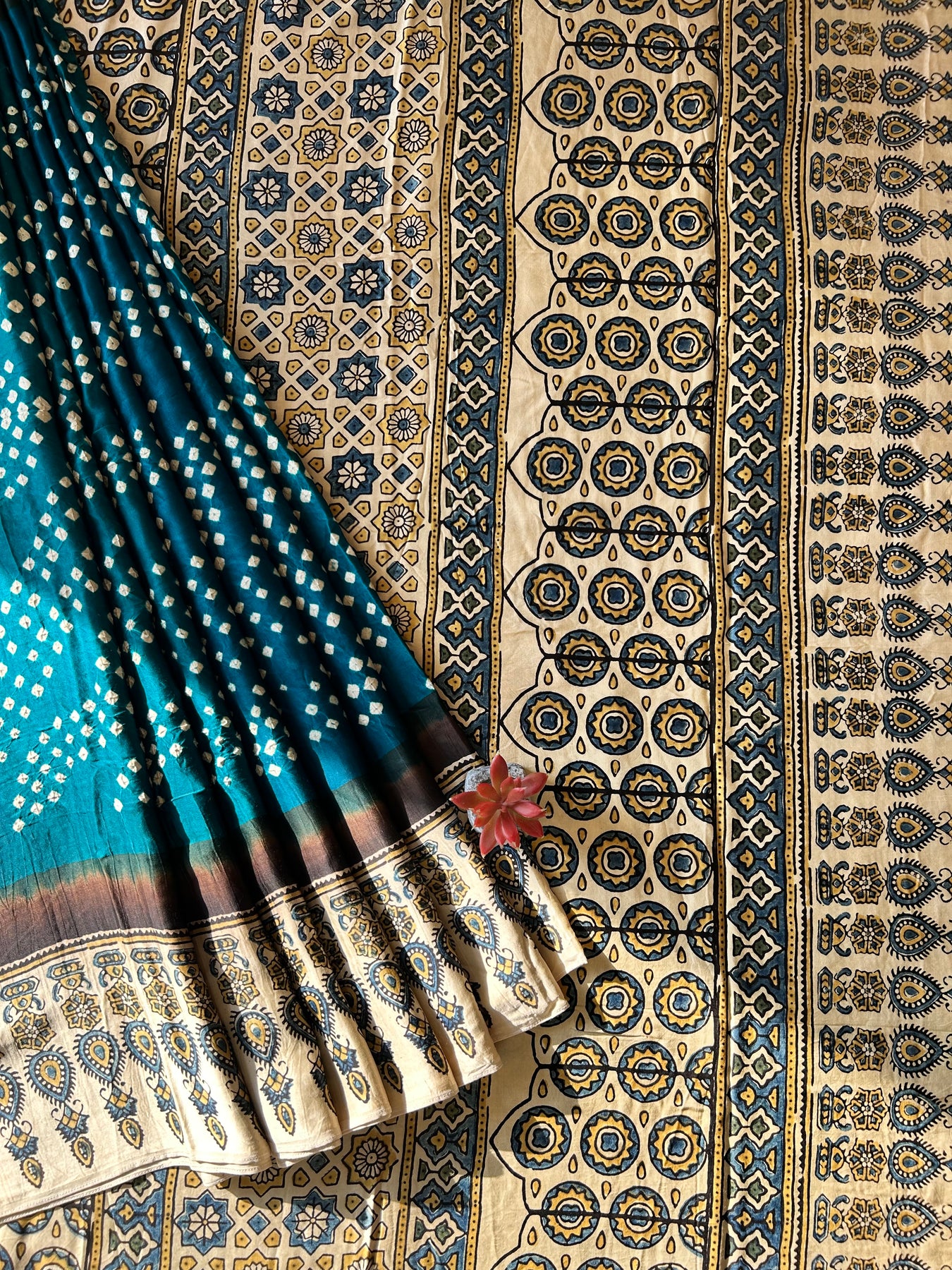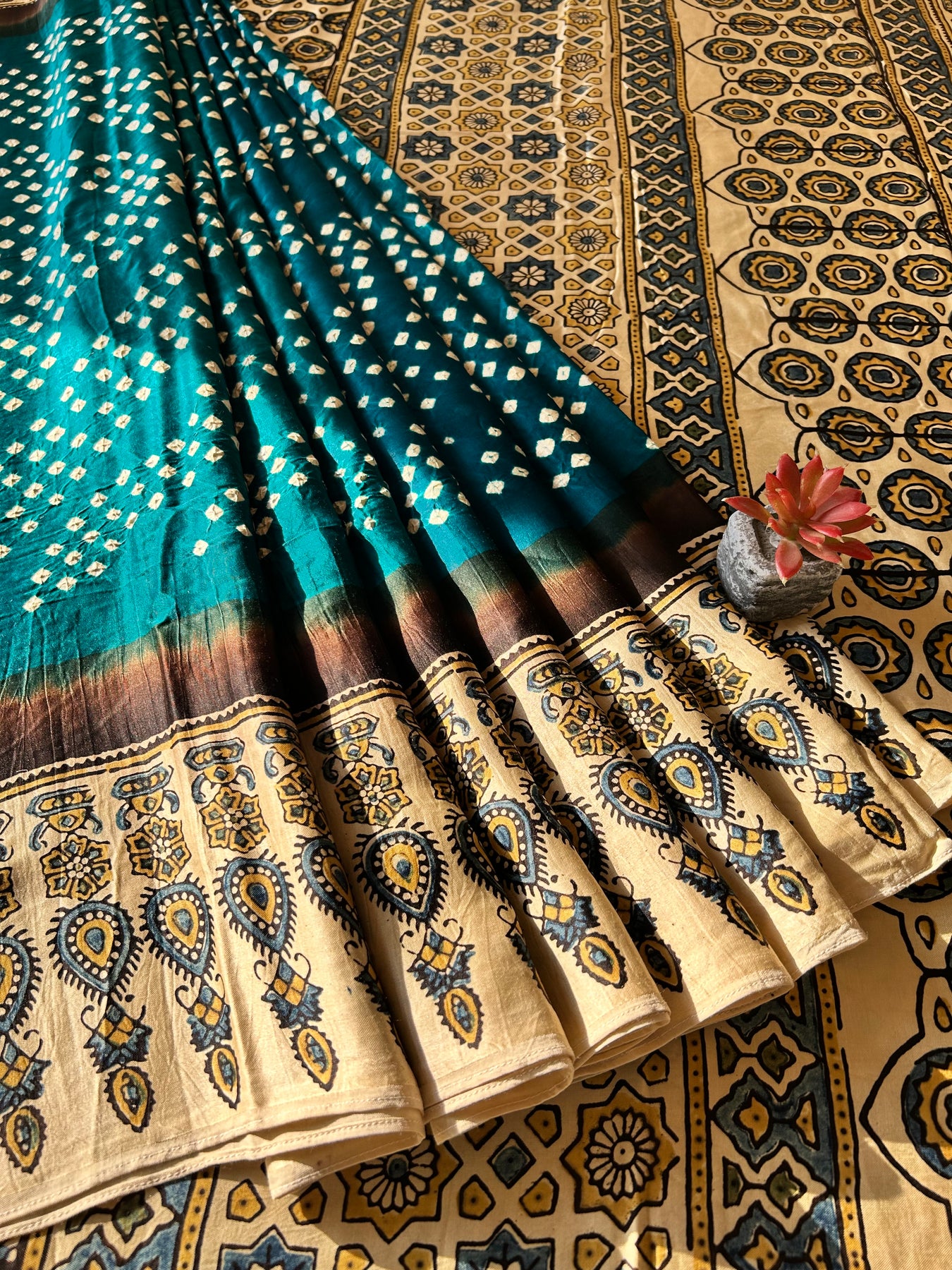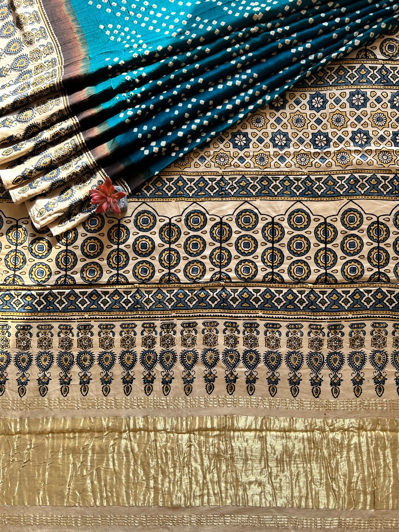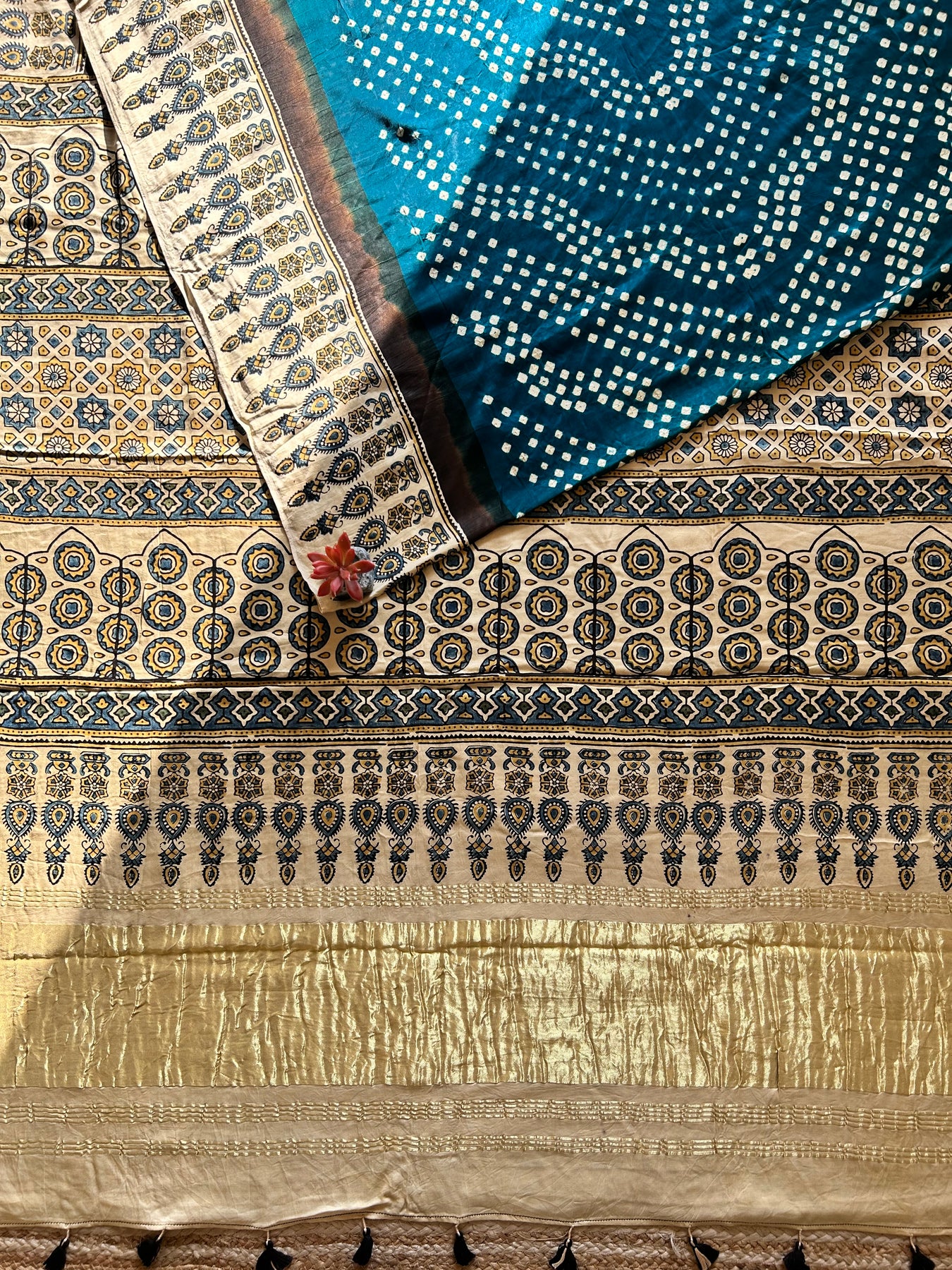 TRIVENI: RAMA BLUE,HANDMADE AJRAKH DESIGNER BANDHEJ MODAL SILK SAREE WITH TISSUE PALLU