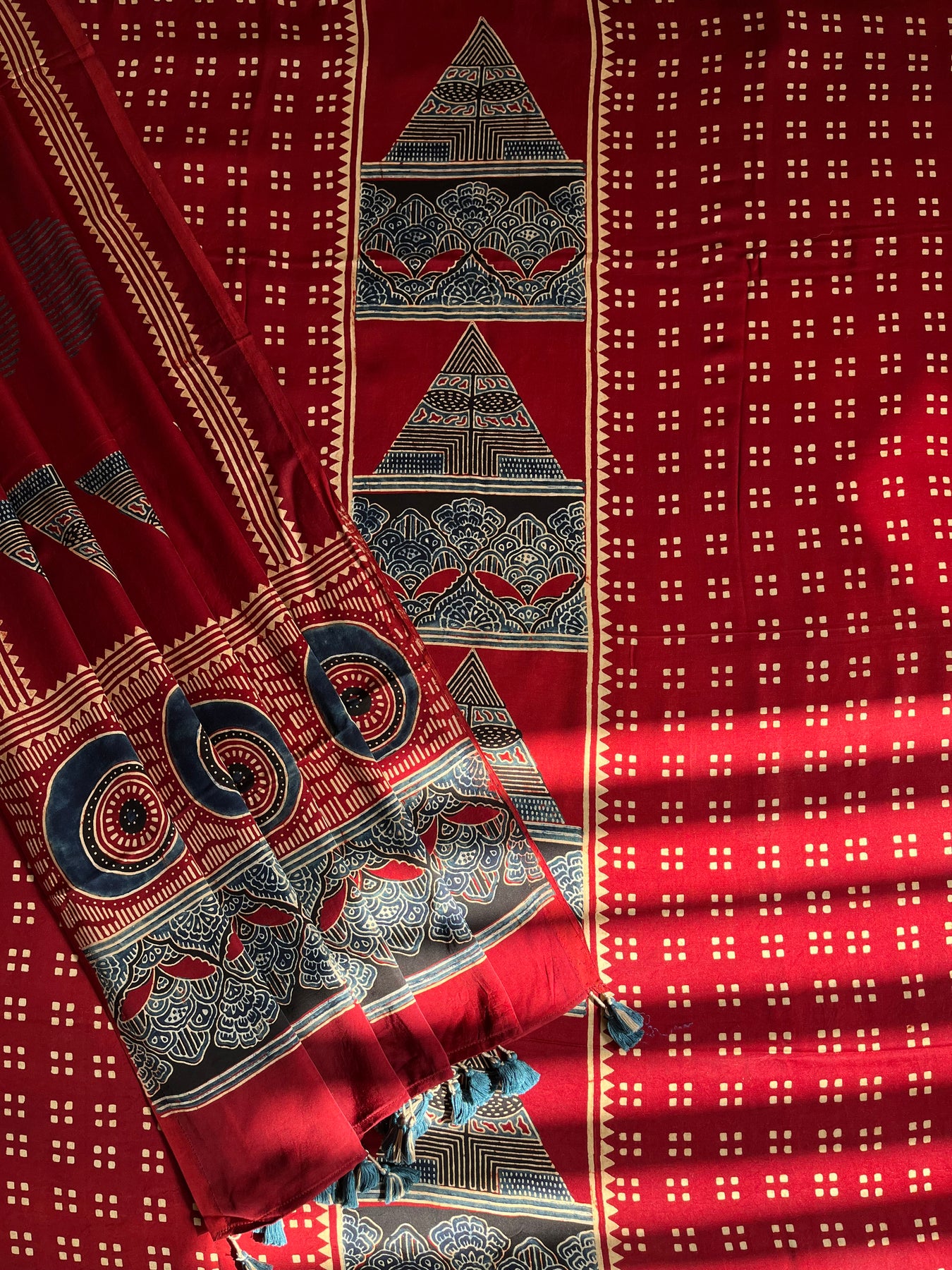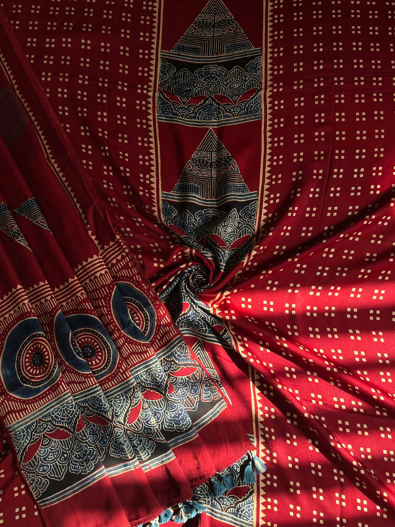 Handblock modal silk ajrakh dupatta accessorized with tassels |