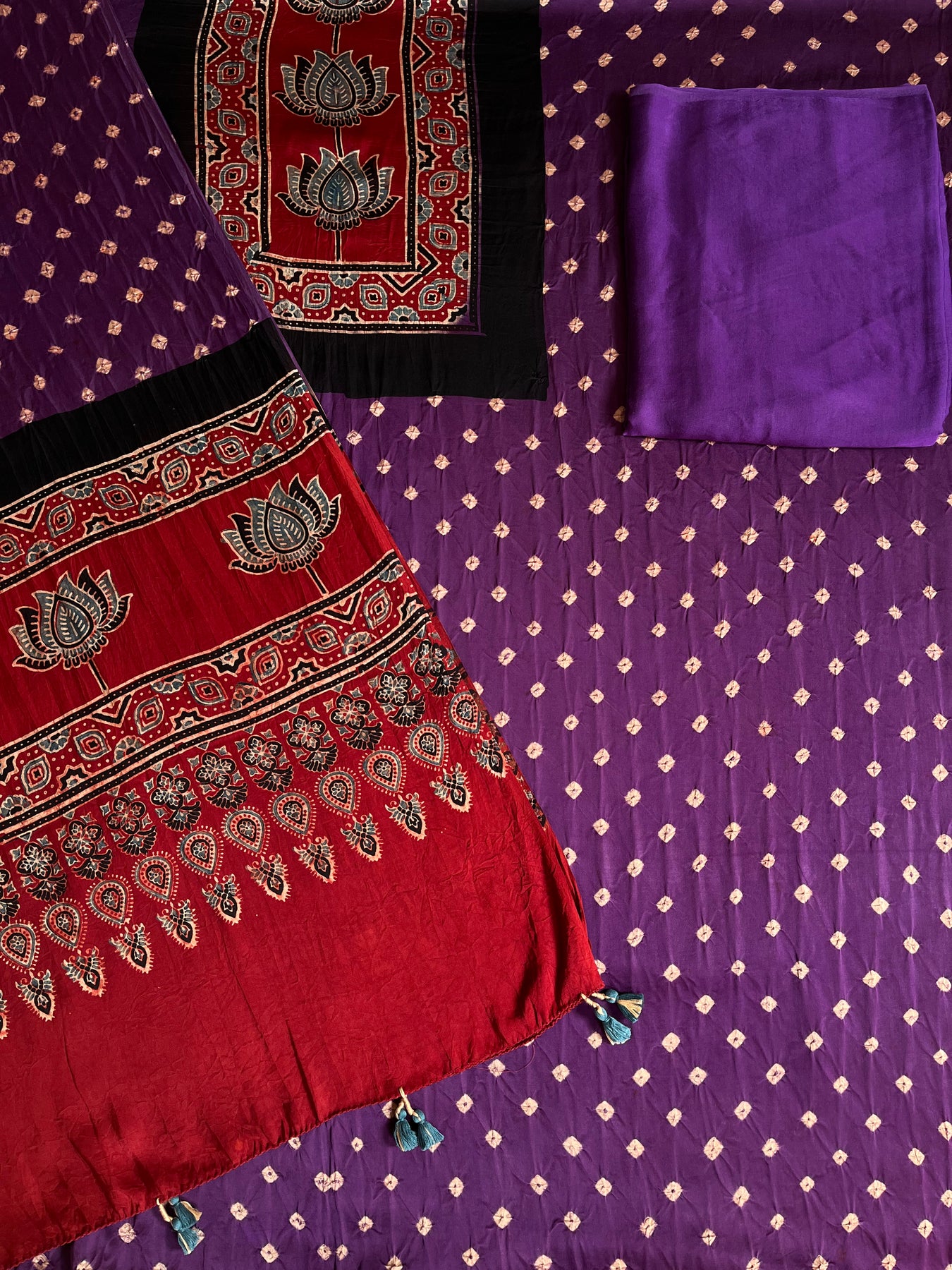 Handmade bandhani-ajrakh modal silk dupatta accessorized with tassels |
