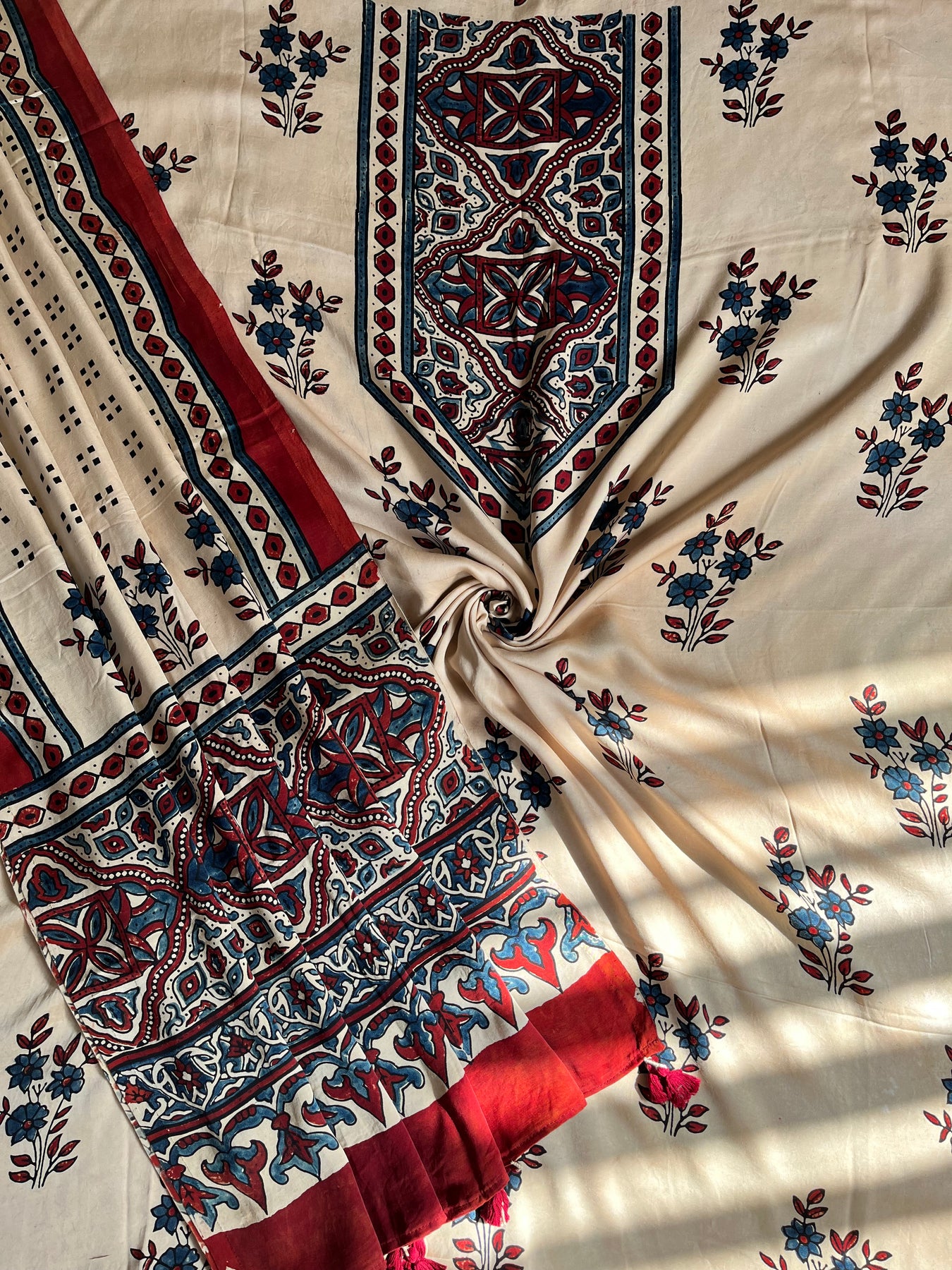 Handblock modal silk ajrakh dupatta accessorized with tassels |