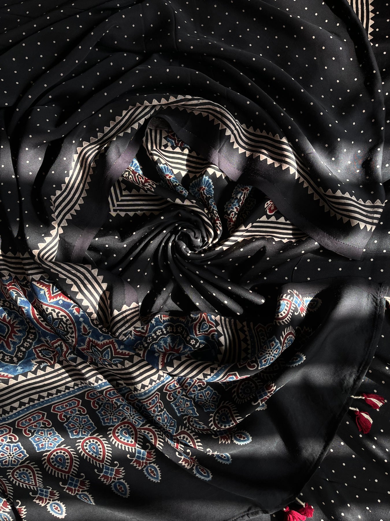 Handblock modal silk ajrakh dupatta accessorized with tassels |