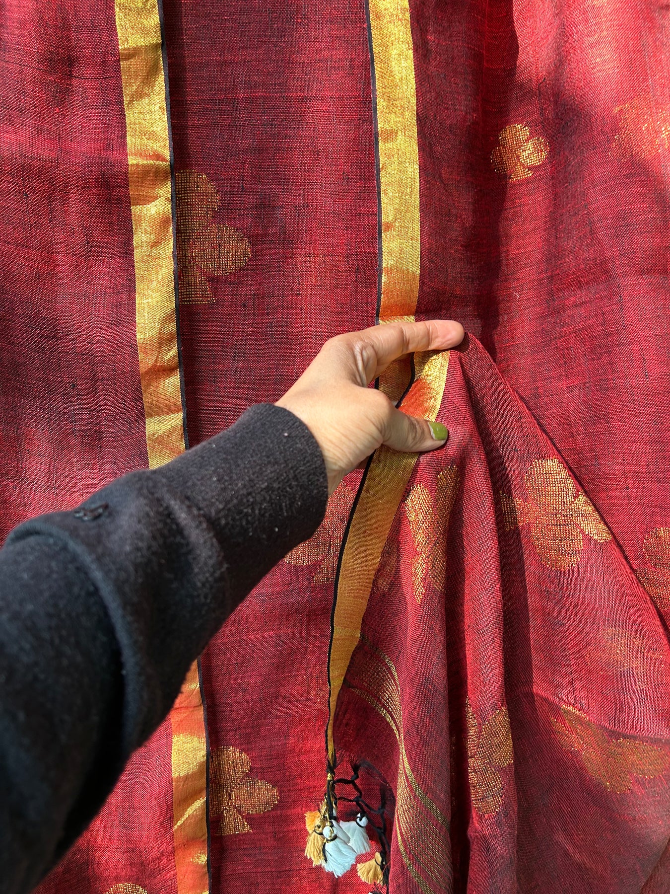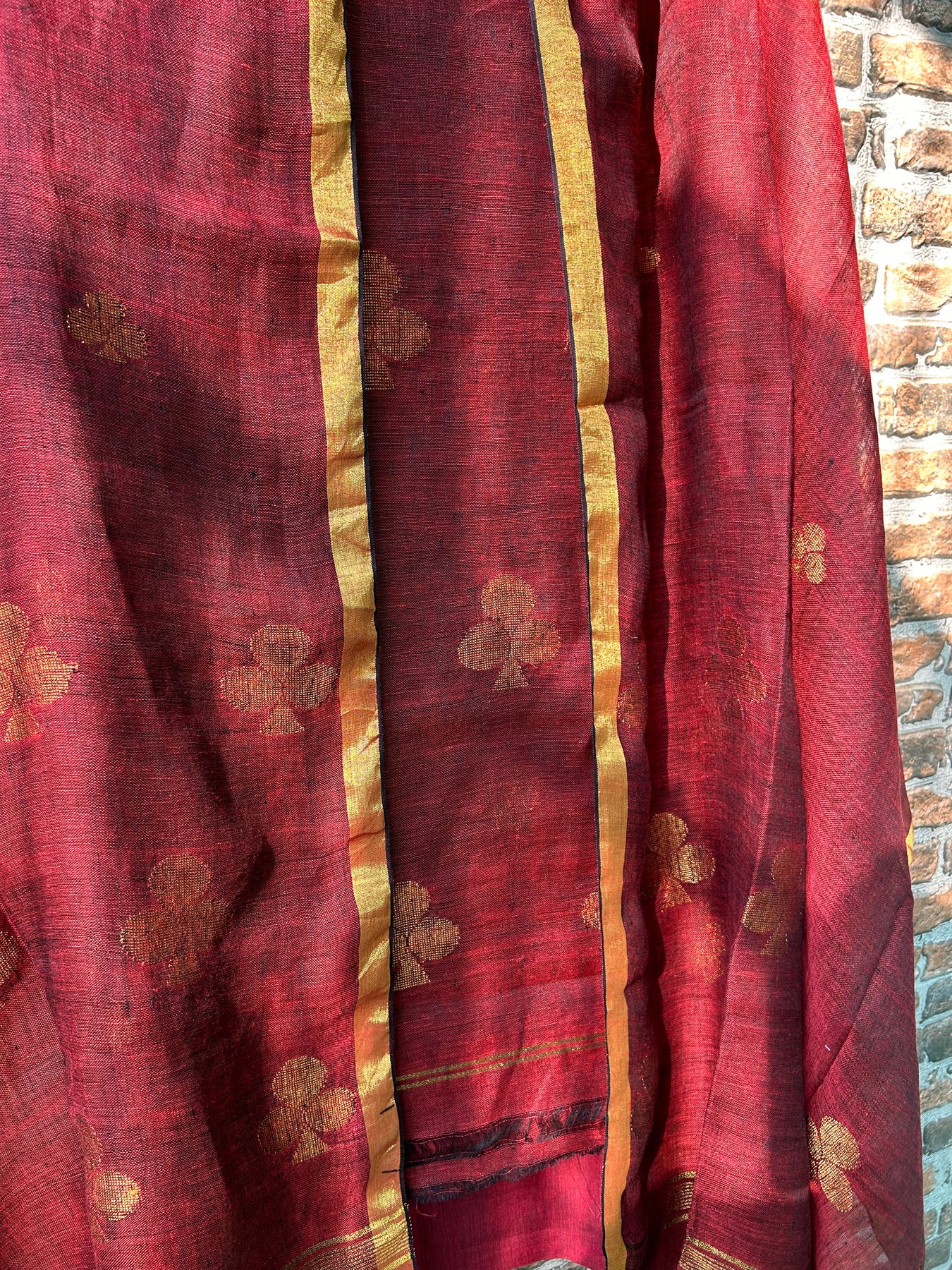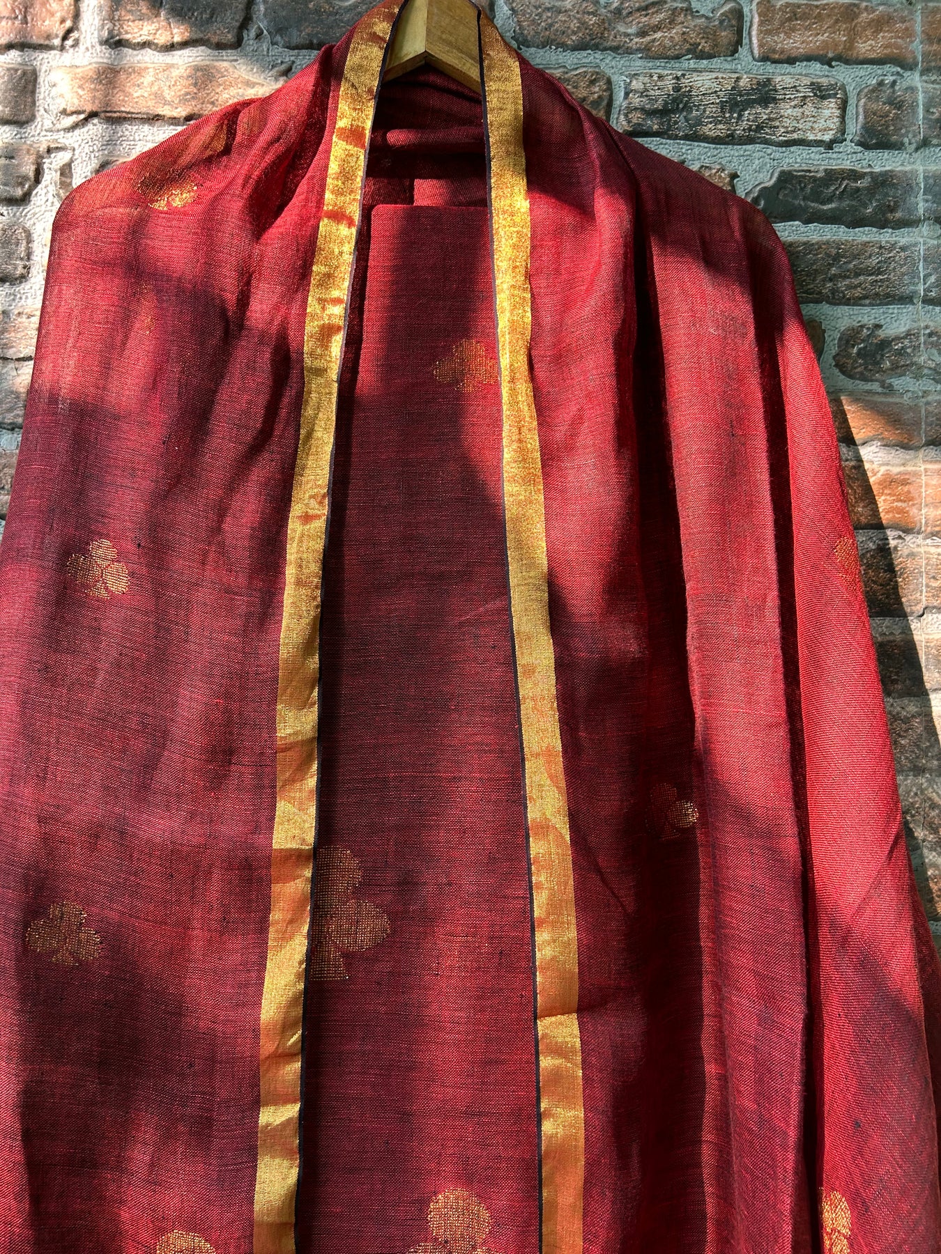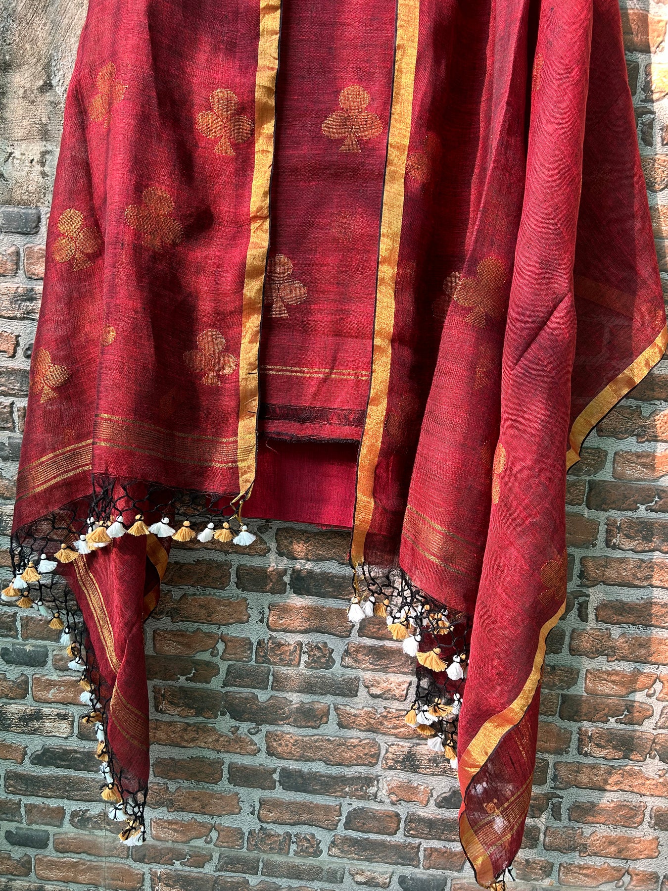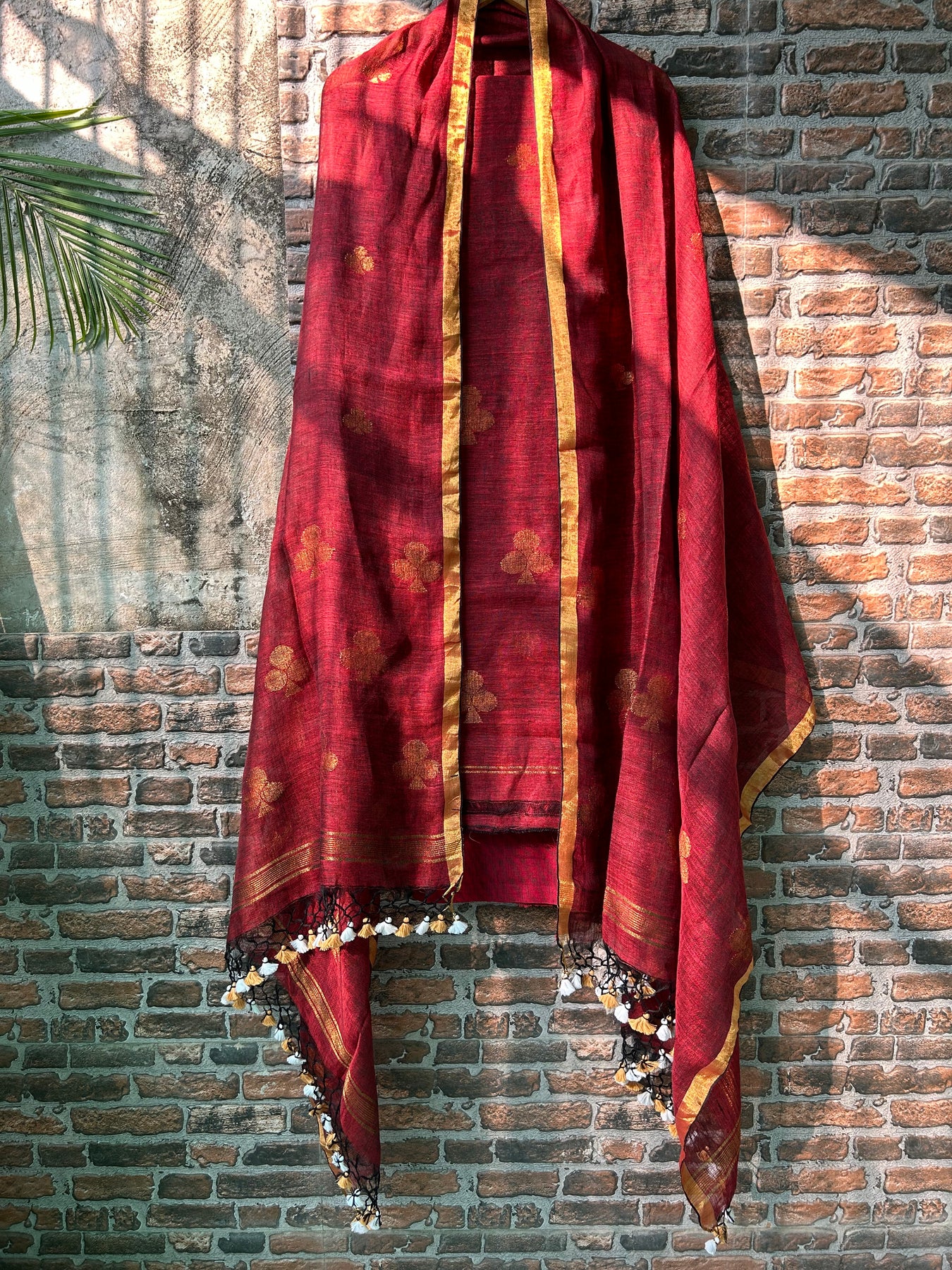 SHREELATA : HANDLOOM JAMDANI PURE LINEN COTTON 3 PIECE SUIT SET.