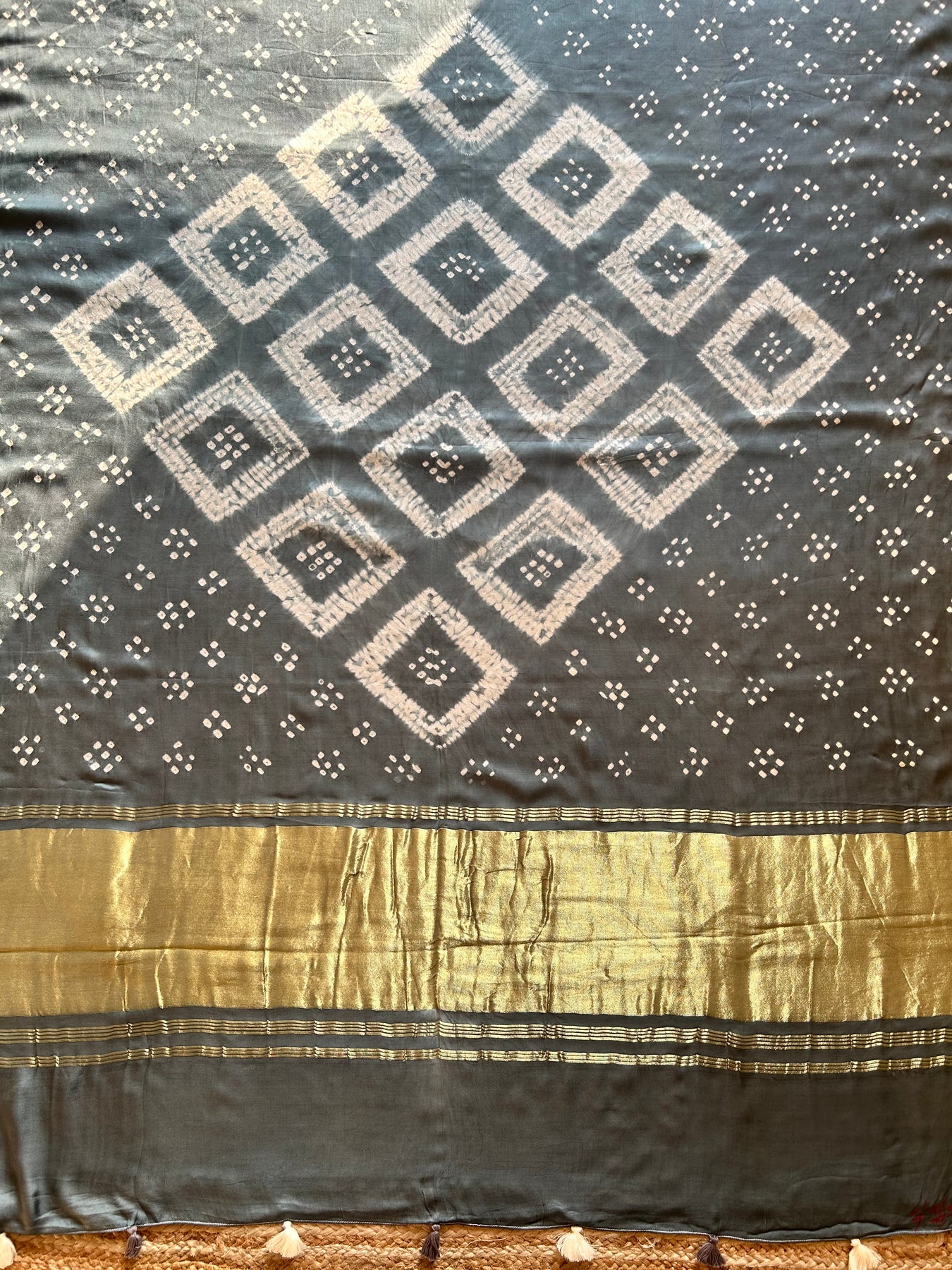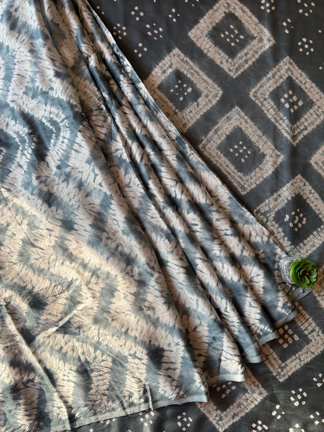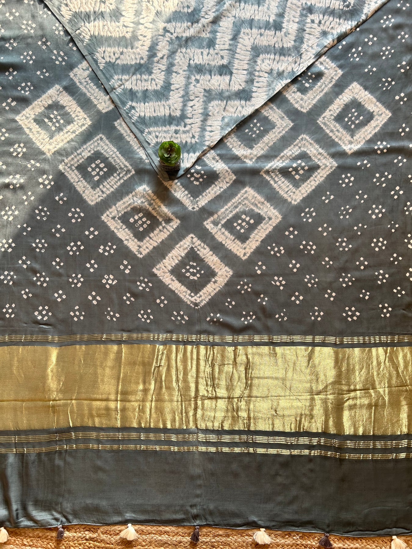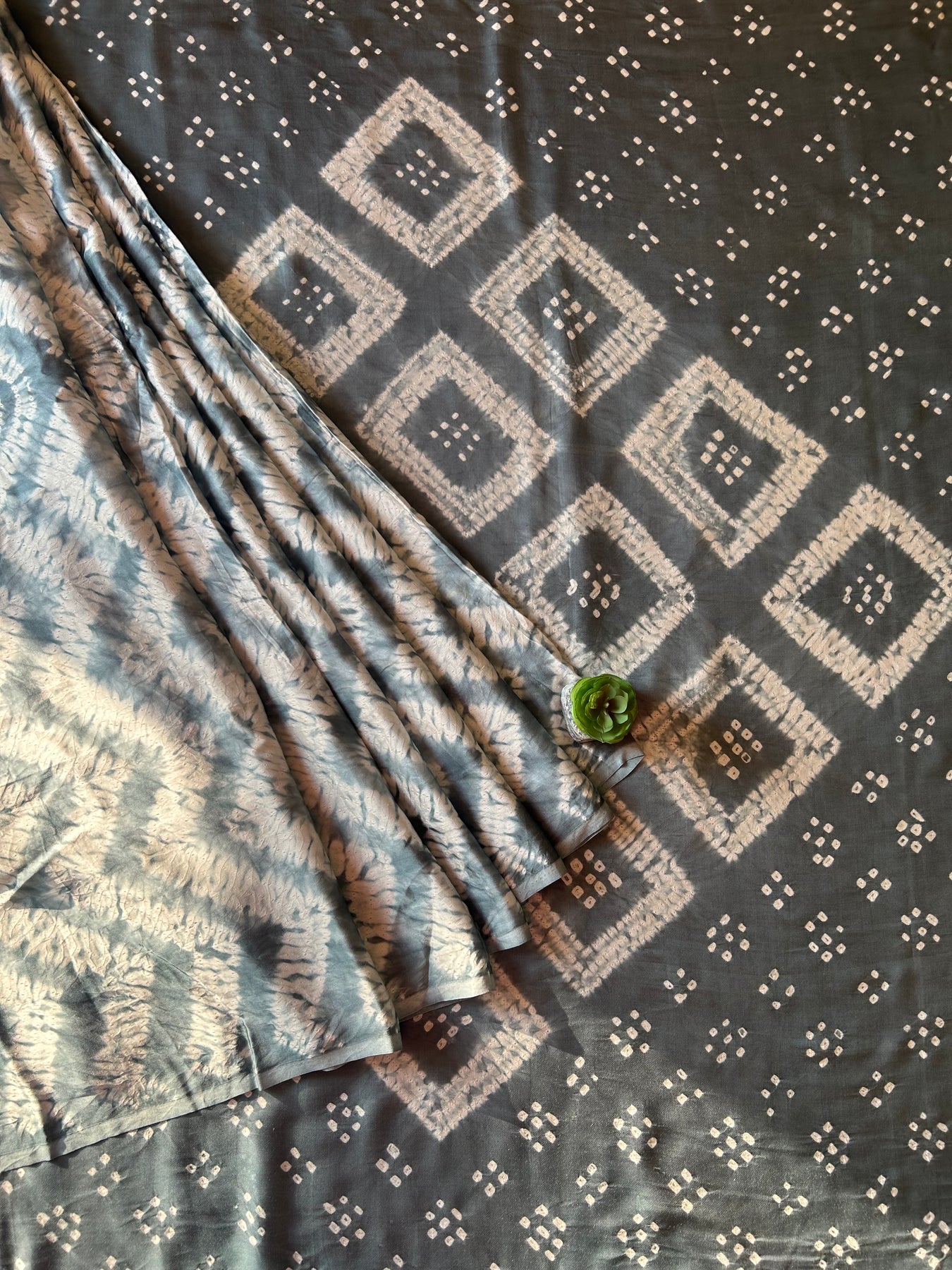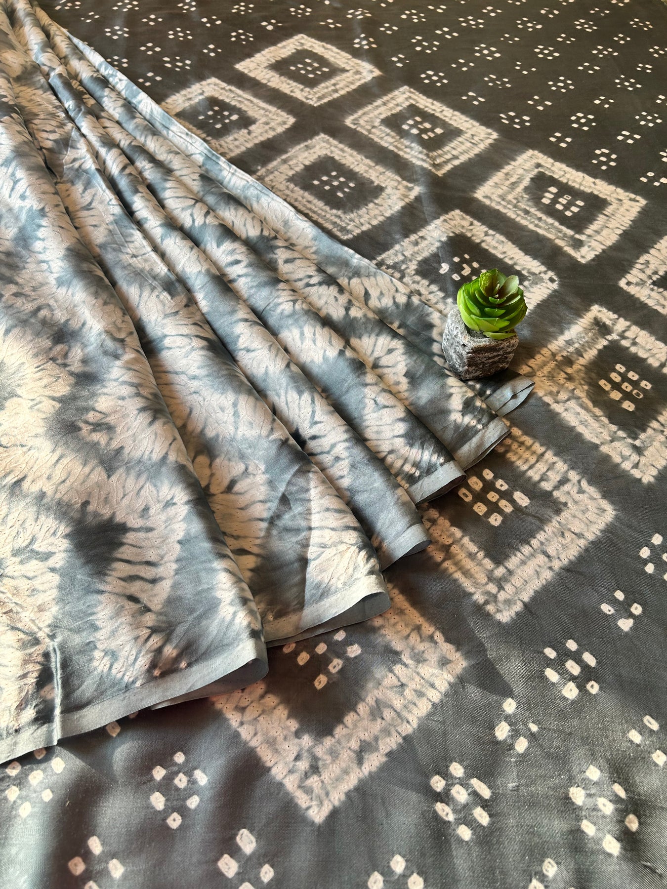 SUNAINA:ICE GREY,HANDMADE SHIBORI-BANDHANI MODAL SILK SAREE WITH TISSUE PALLU