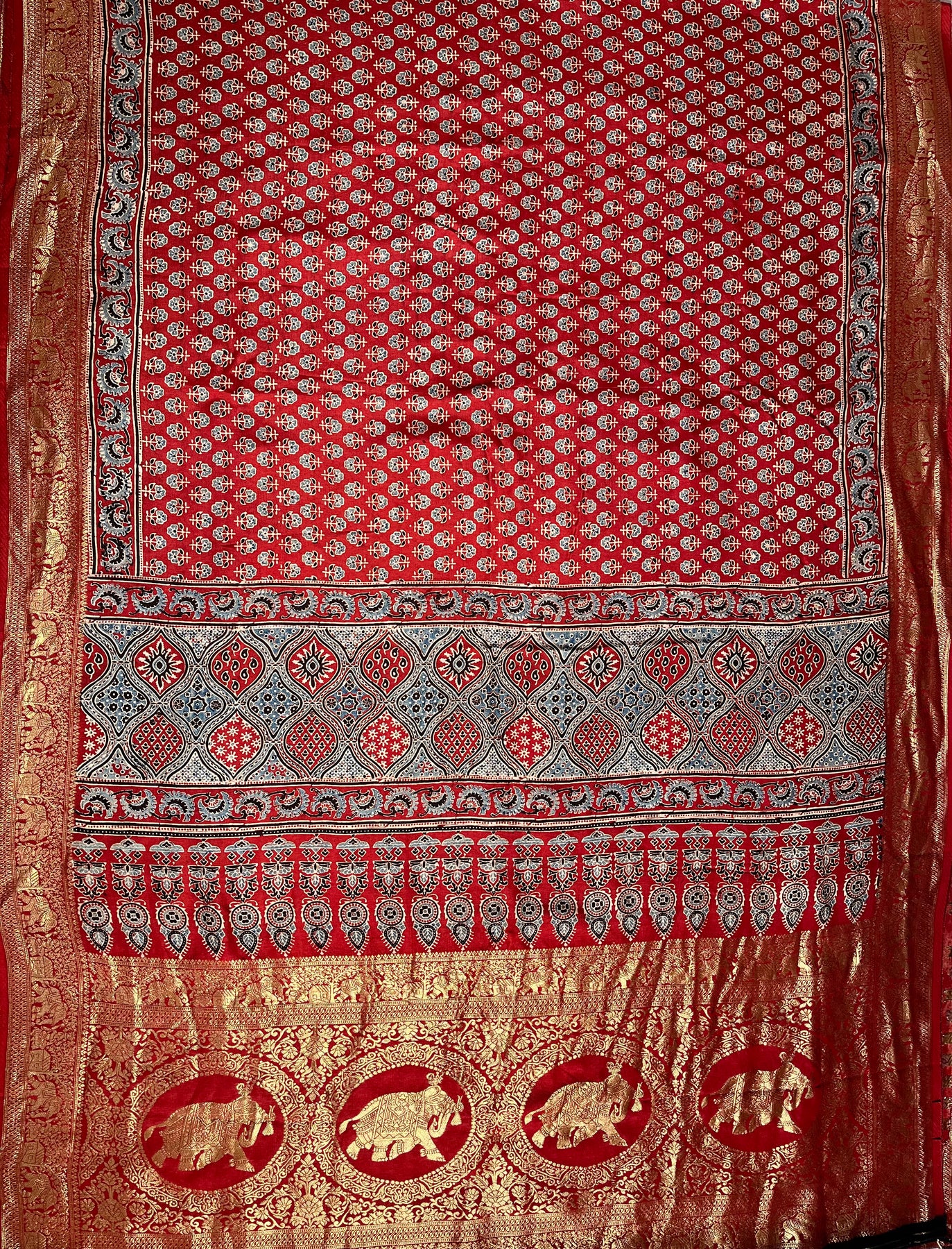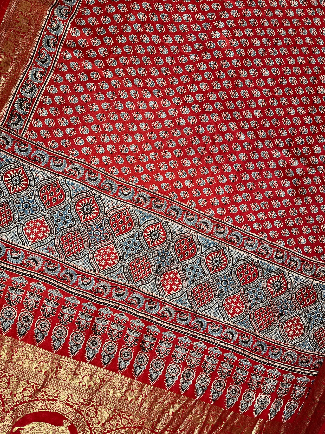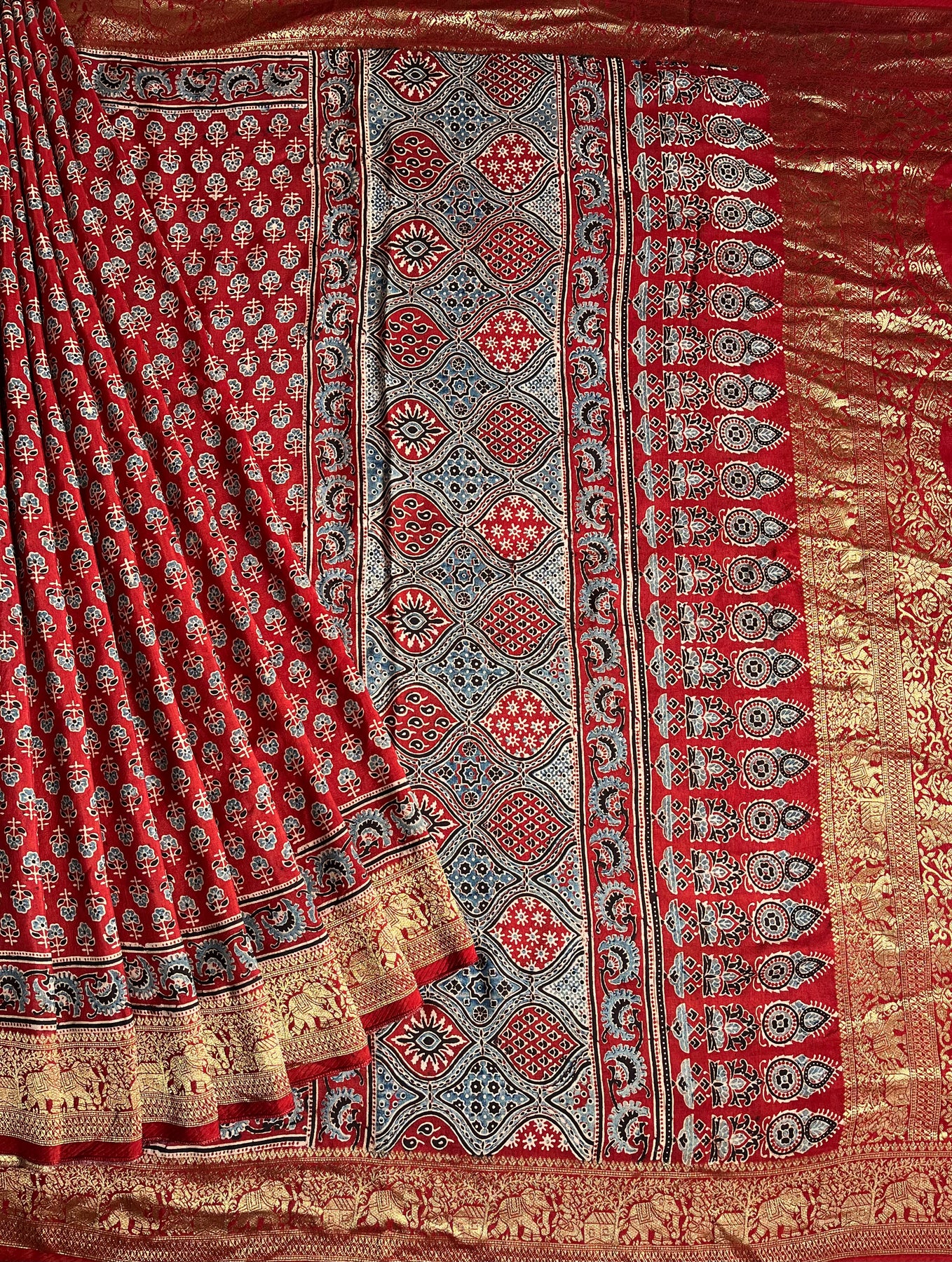 Laxmi: HANDBLOCK AJRAKH DOLA SILK SAREE WITH MEENAKARI PALLU.