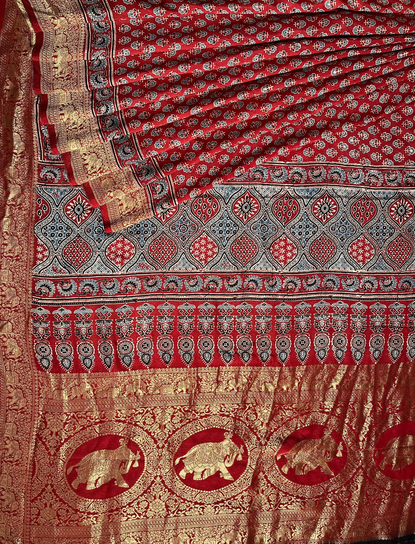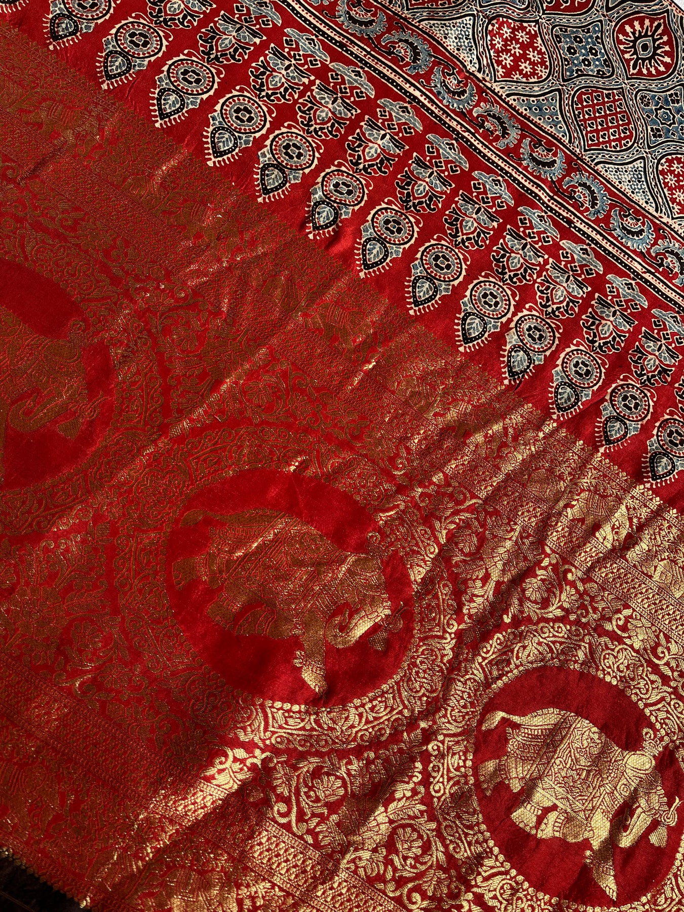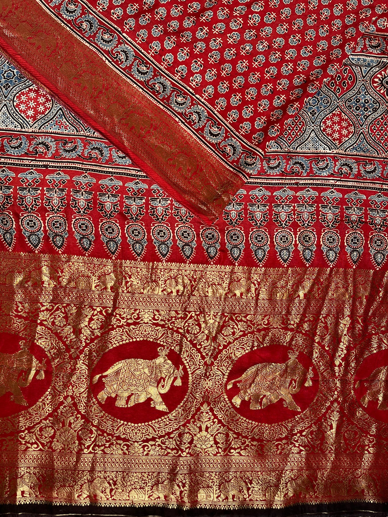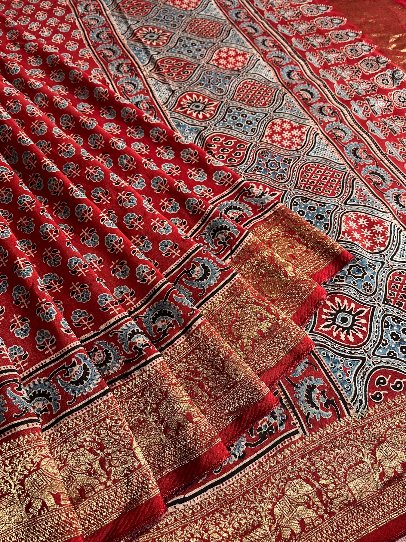 Laxmi: HANDBLOCK AJRAKH DOLA SILK SAREE WITH MEENAKARI PALLU.