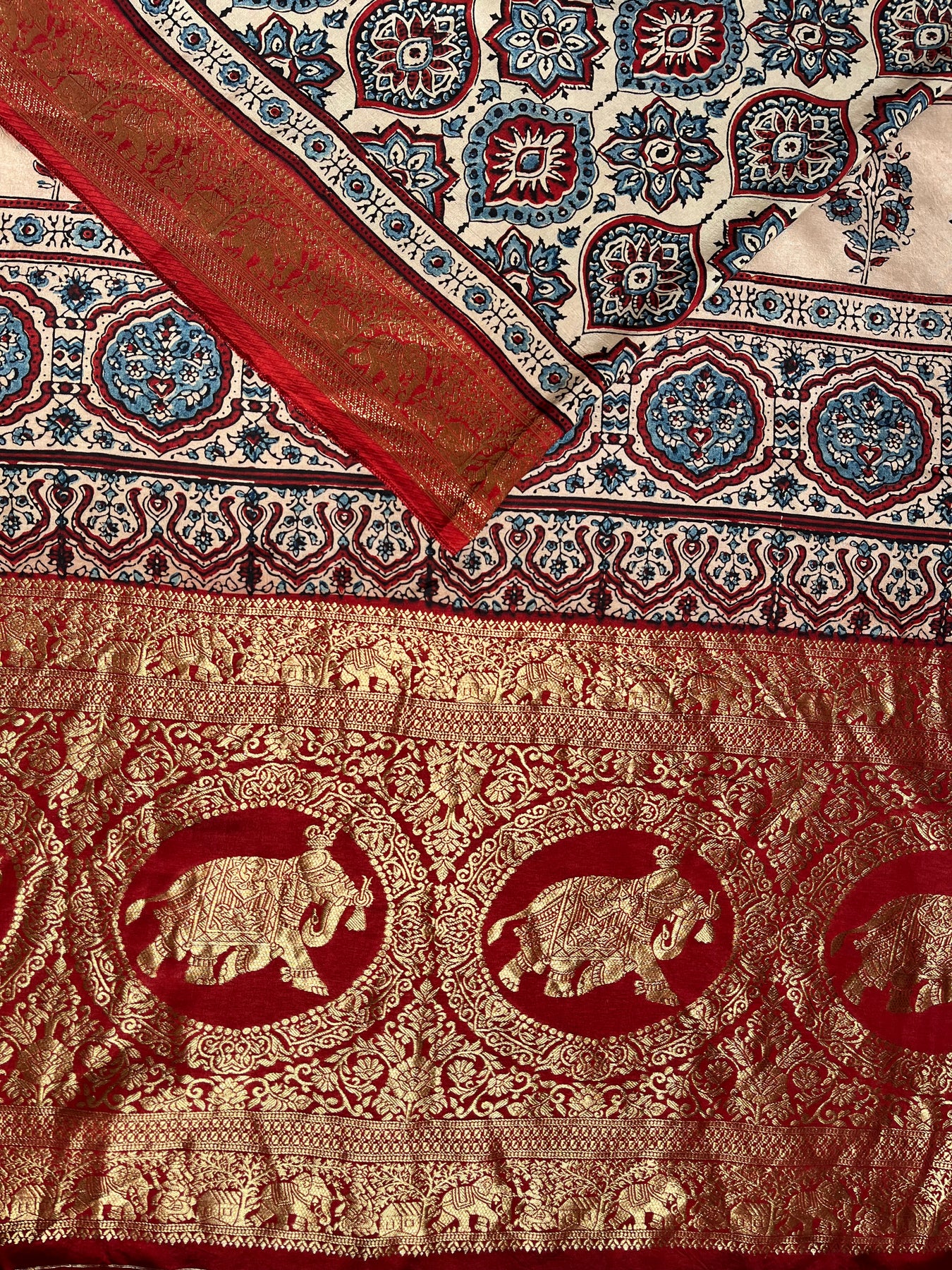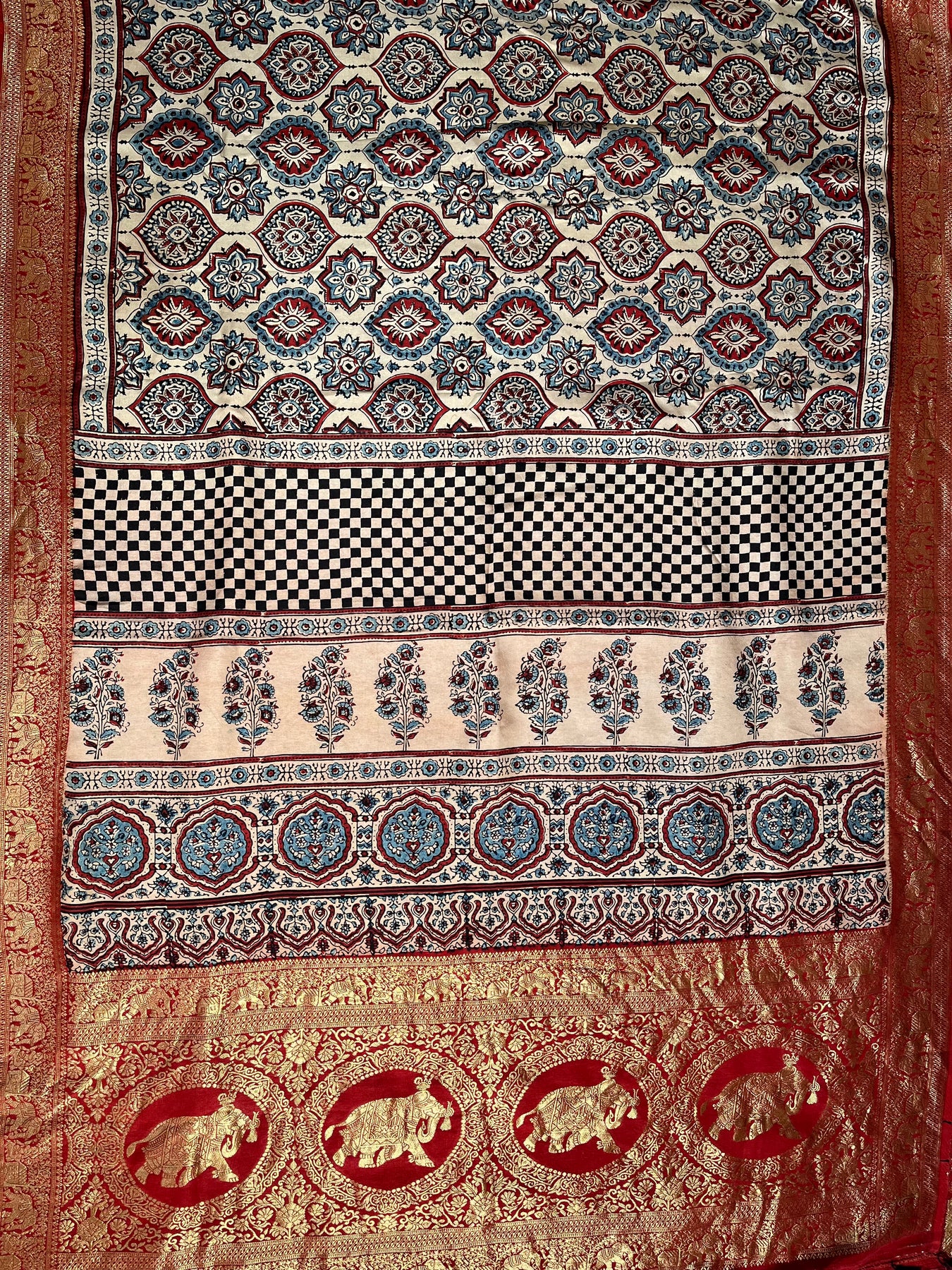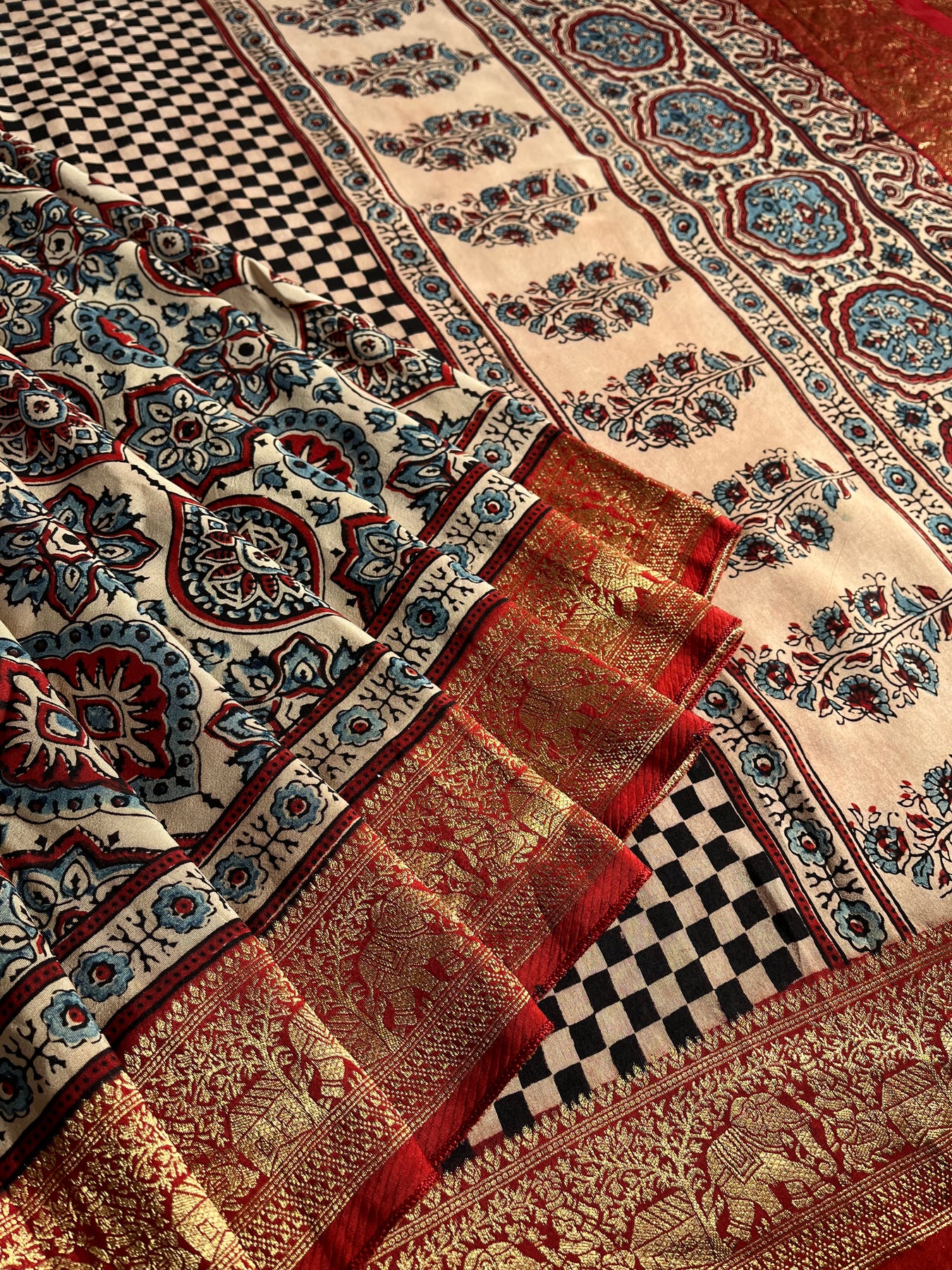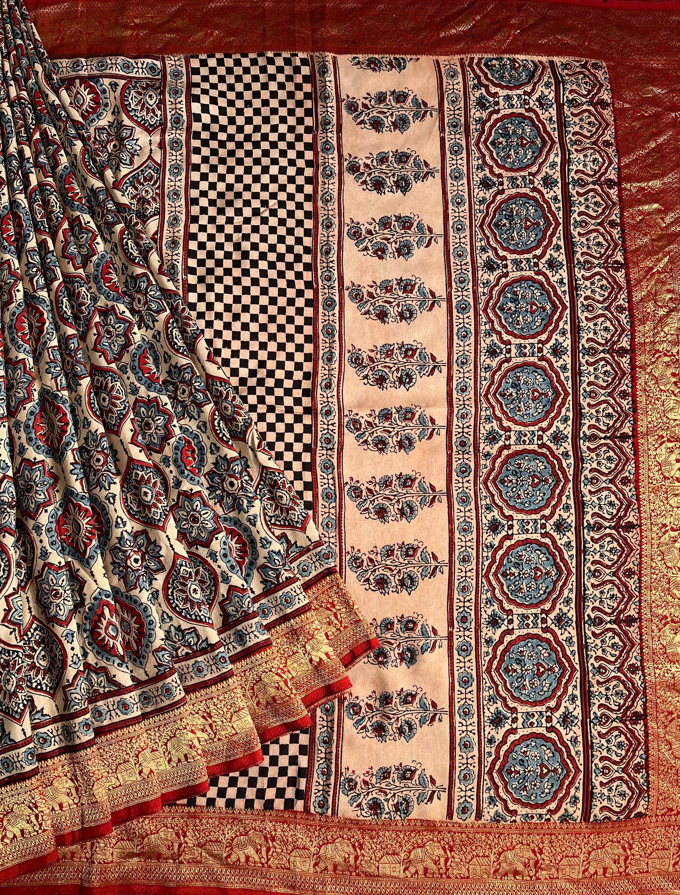 RASHMIKA: Handblock Ajrakh Dola Silk Saree with Meenakari Pallu