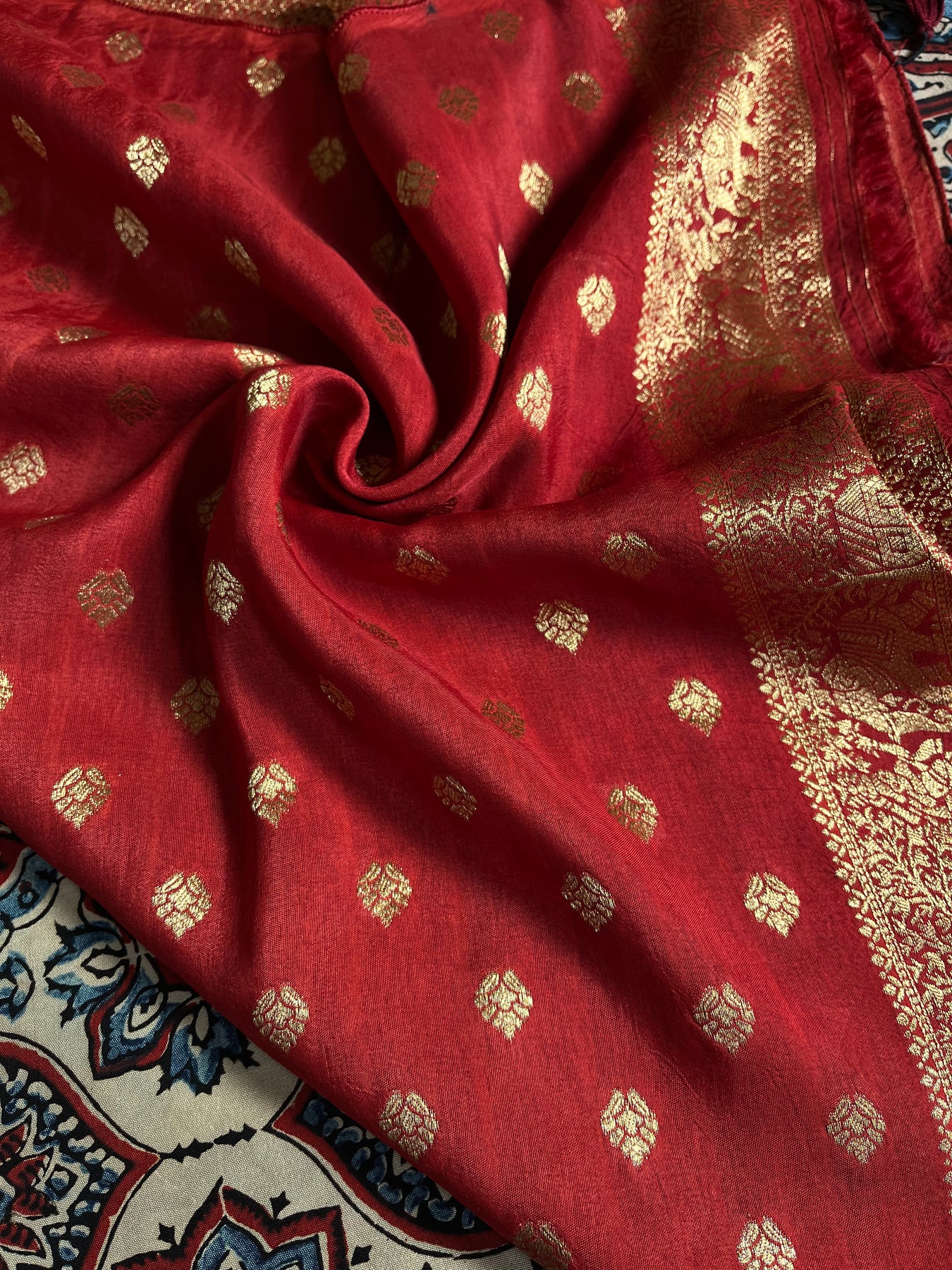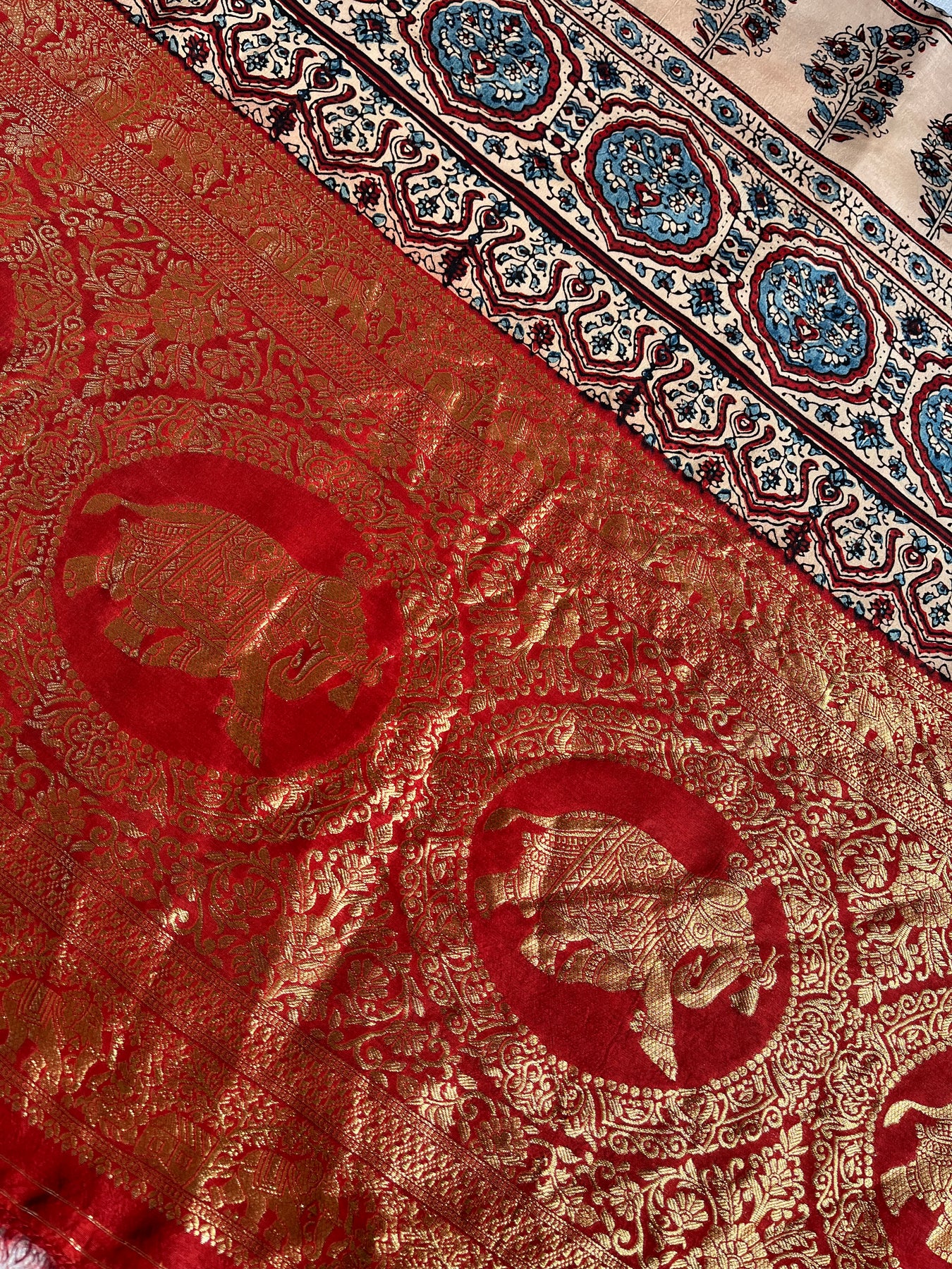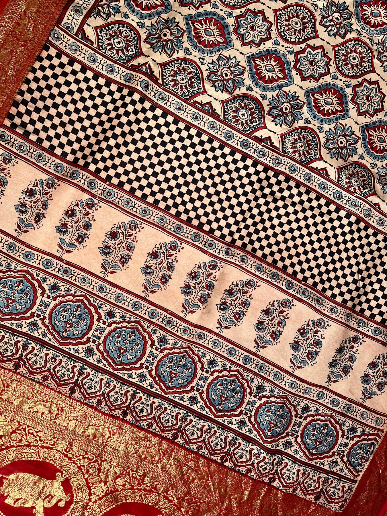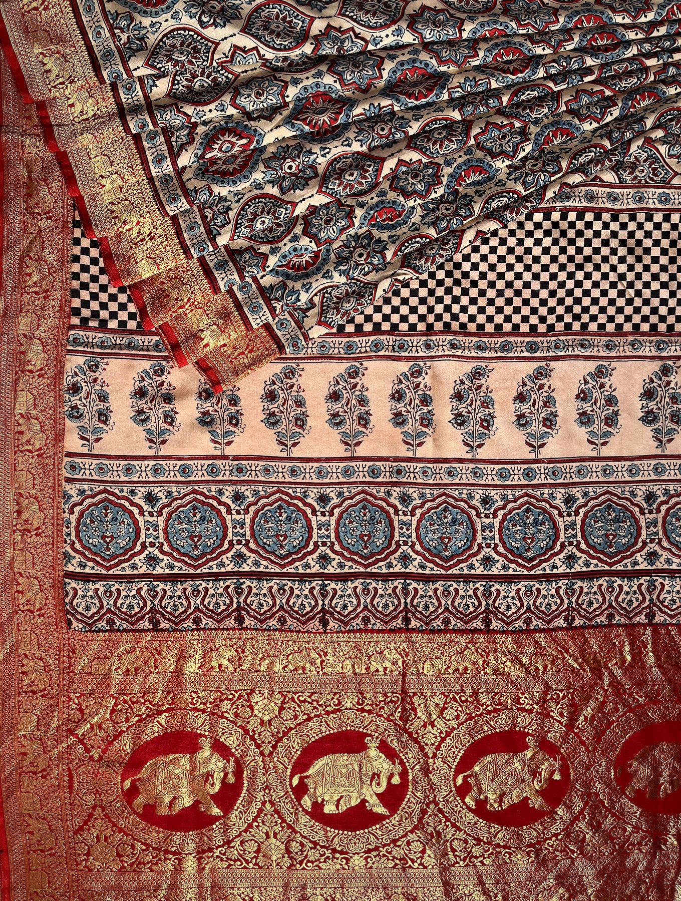 RASHMIKA: Handblock Ajrakh Dola Silk Saree with Meenakari Pallu