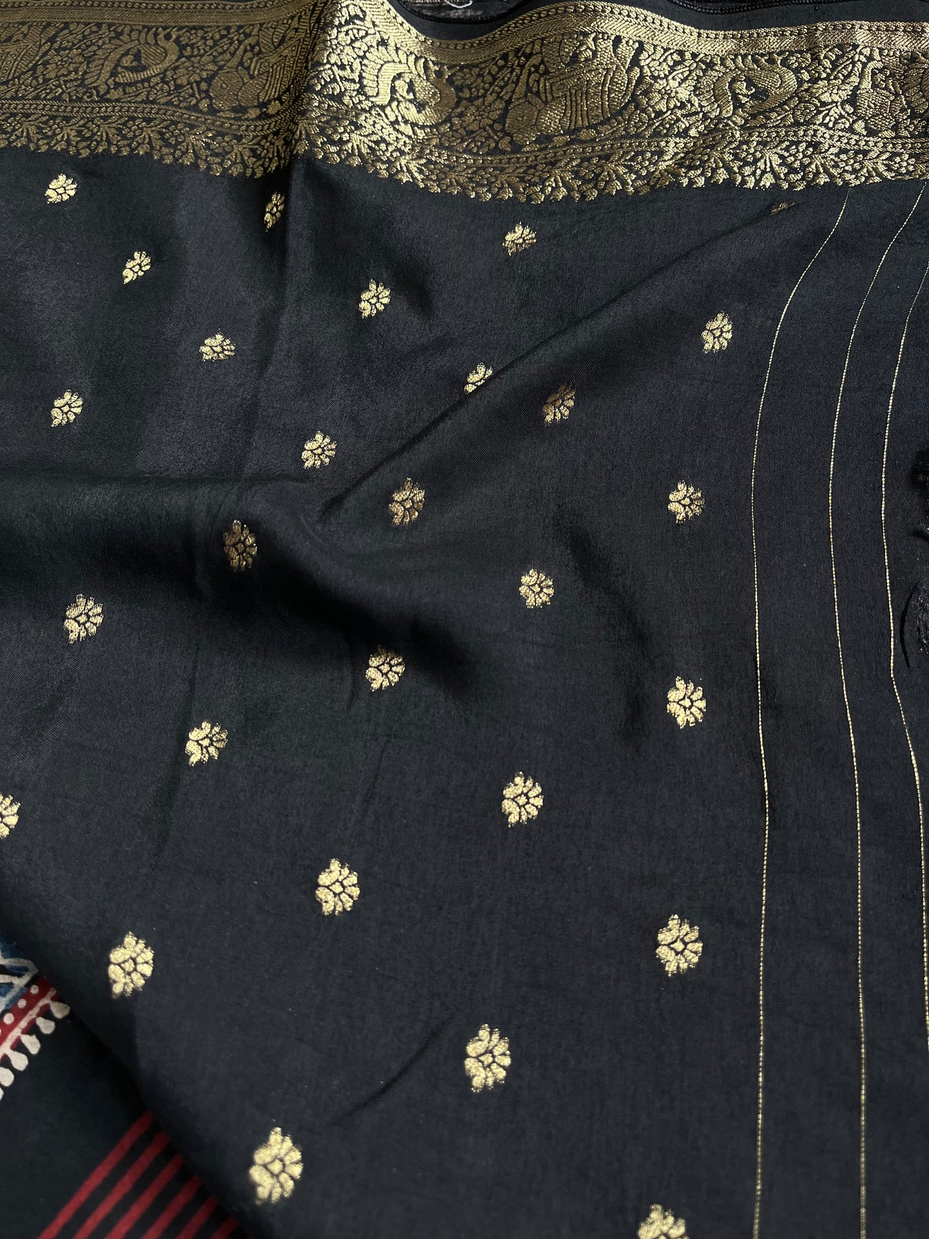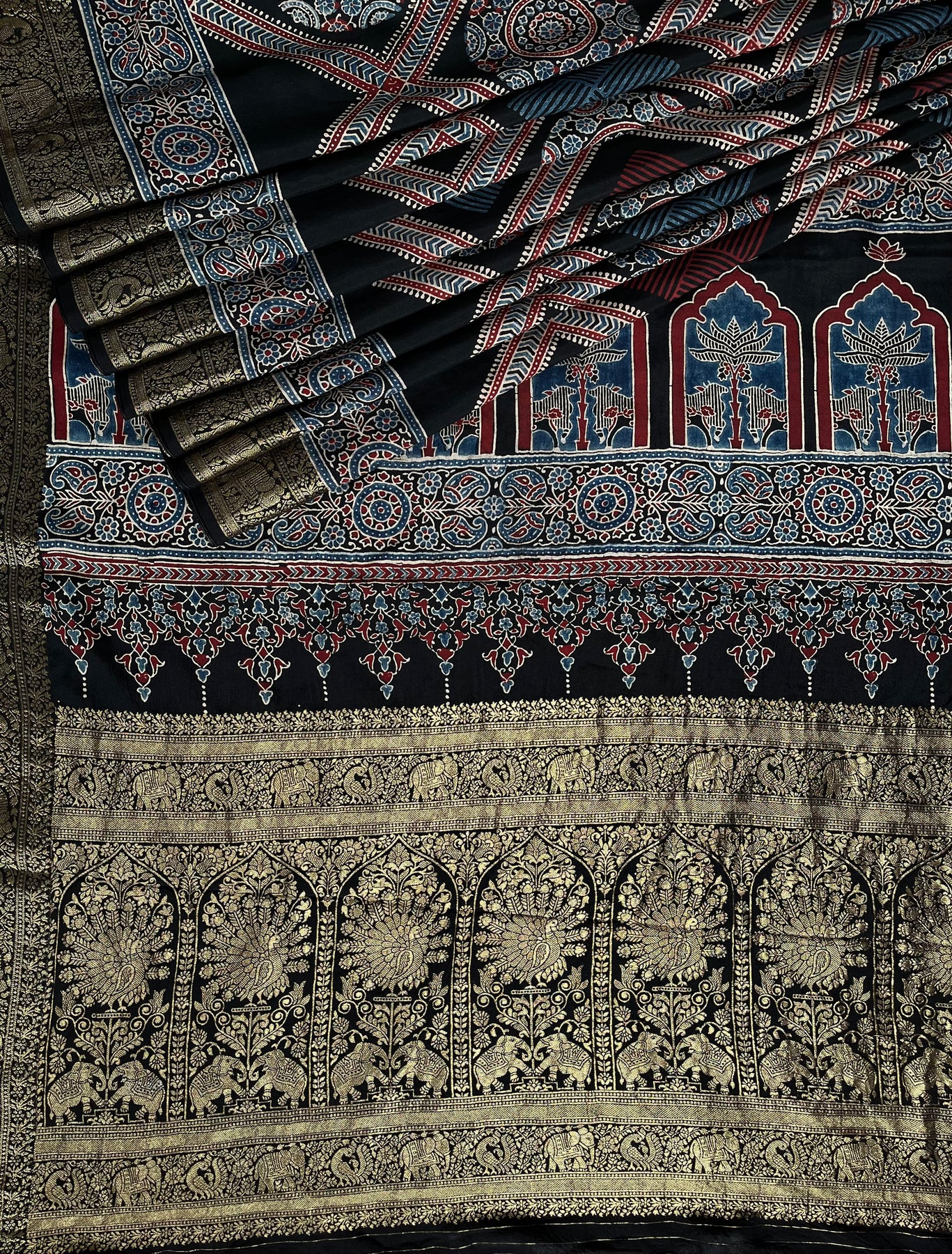 REKHA: Handblock Ajrakh Dola Silk Saree with Meenakari Pallu