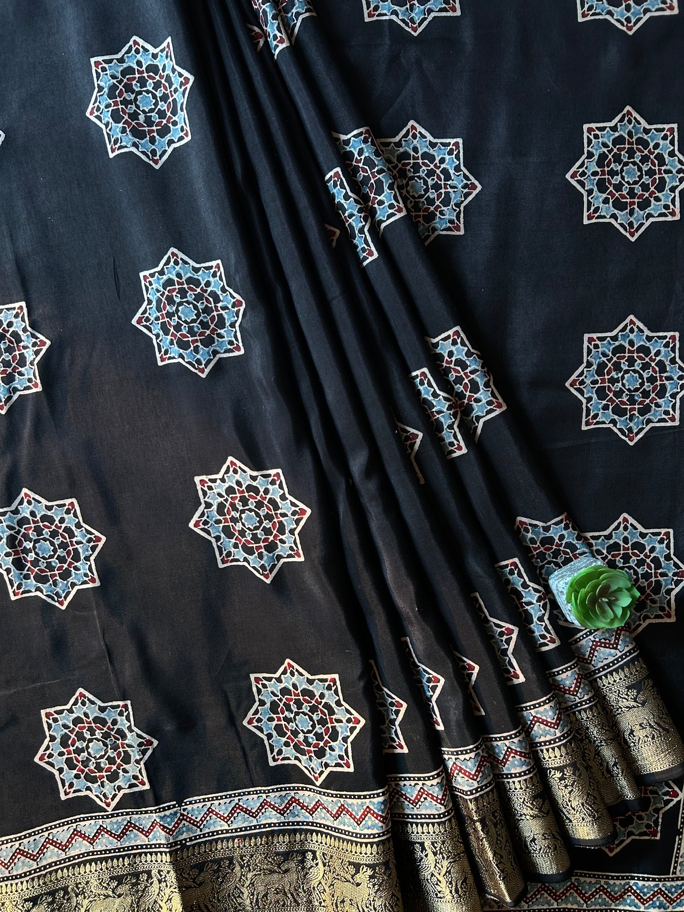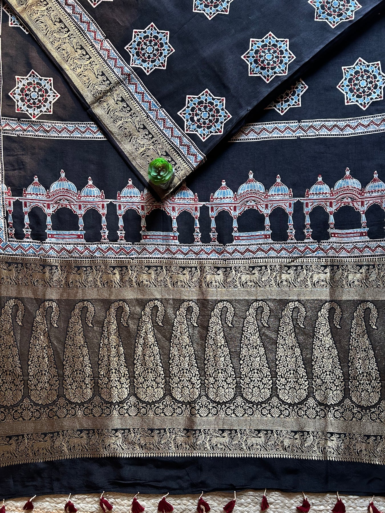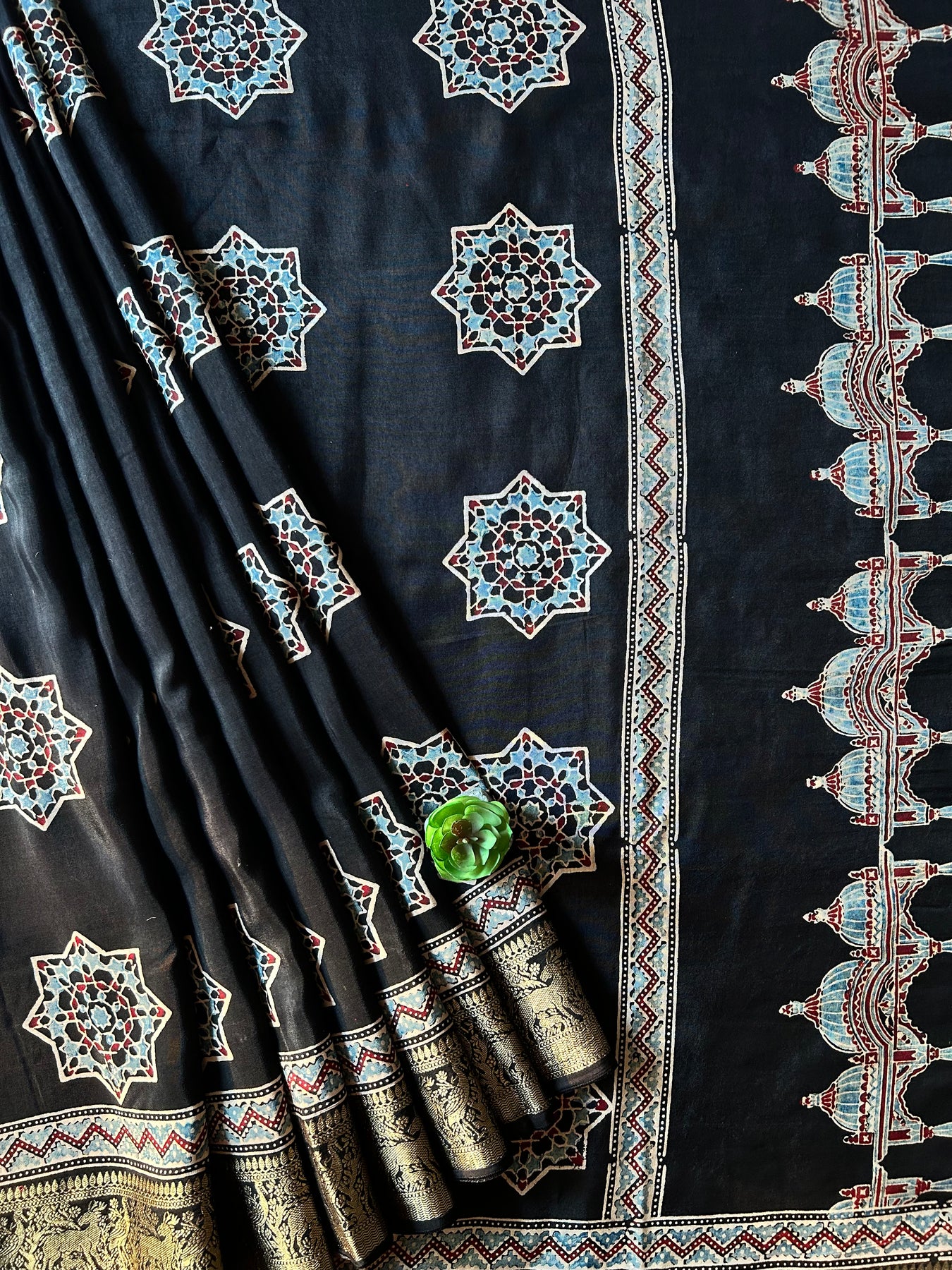 ASTAM: BLACK,HANDBLOCK AJRAKH DOLA SILK SAREE WITH MEENAKARI PALLU