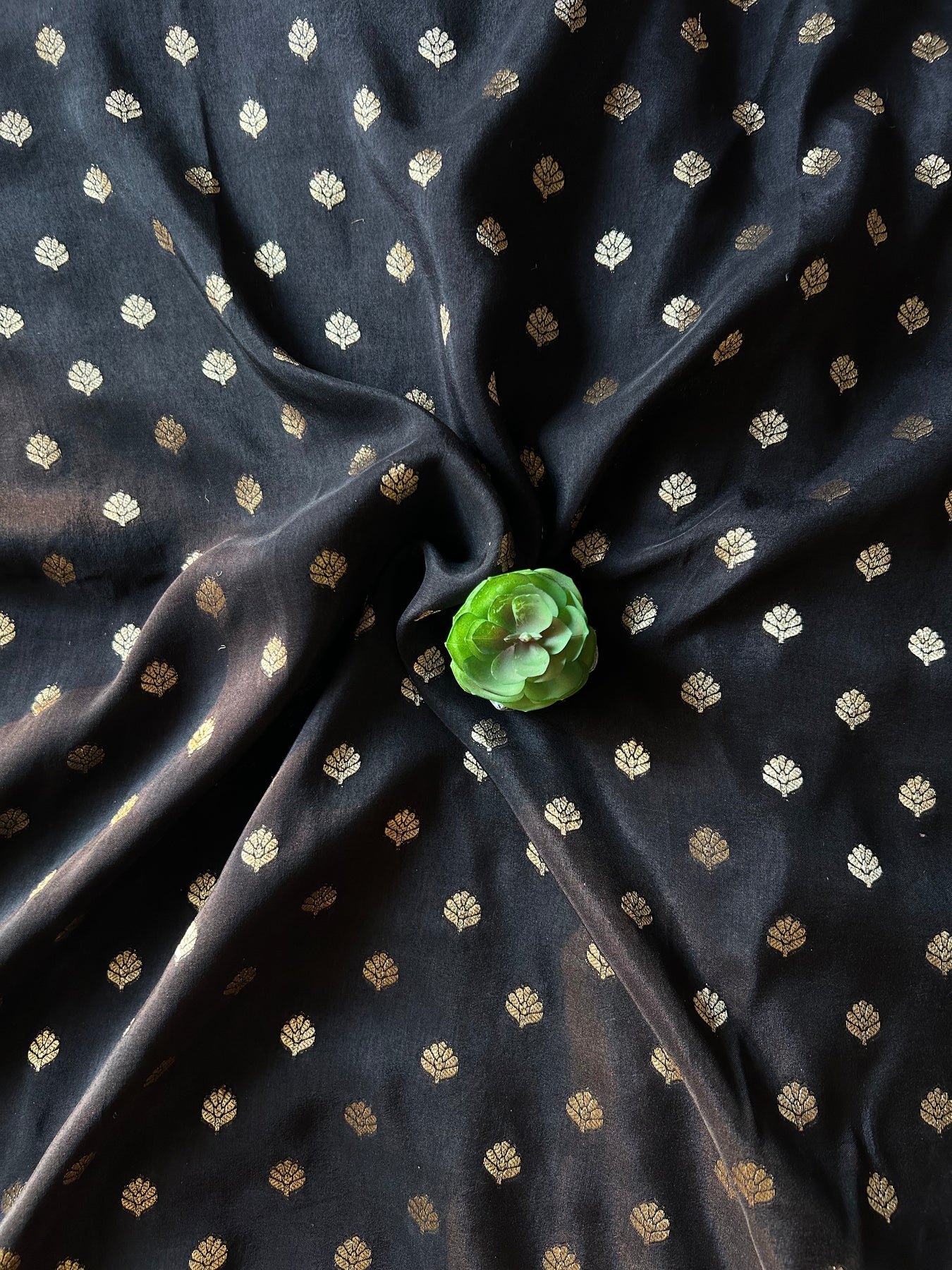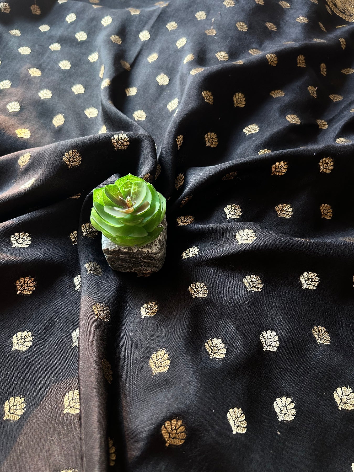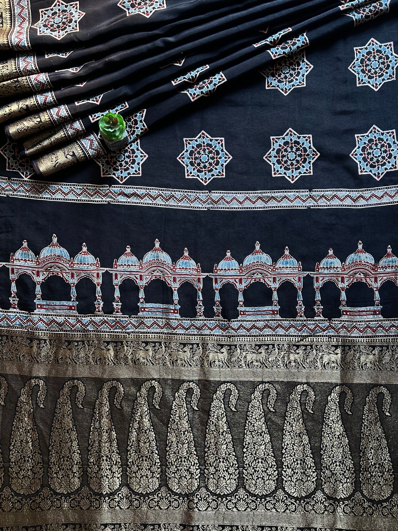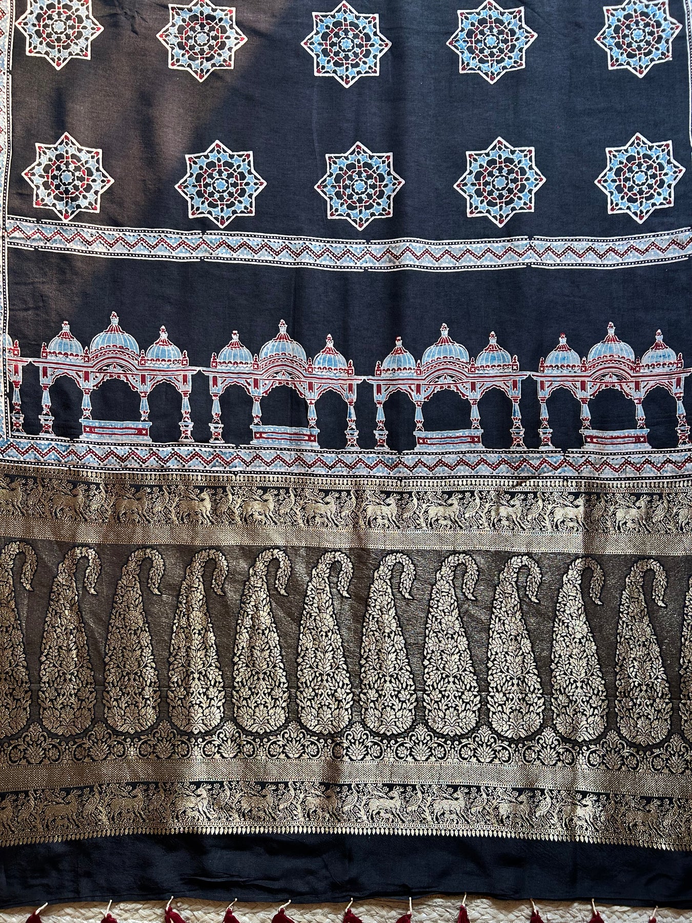 ASTAM: BLACK,HANDBLOCK AJRAKH DOLA SILK SAREE WITH MEENAKARI PALLU