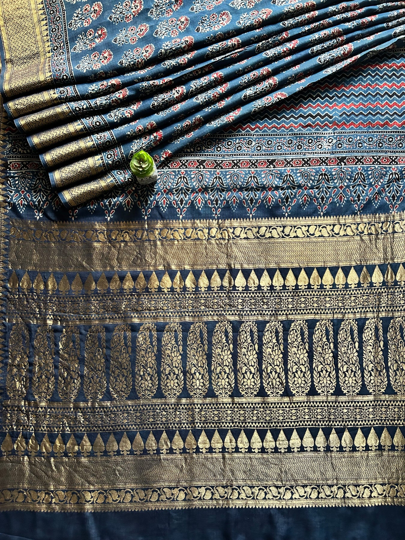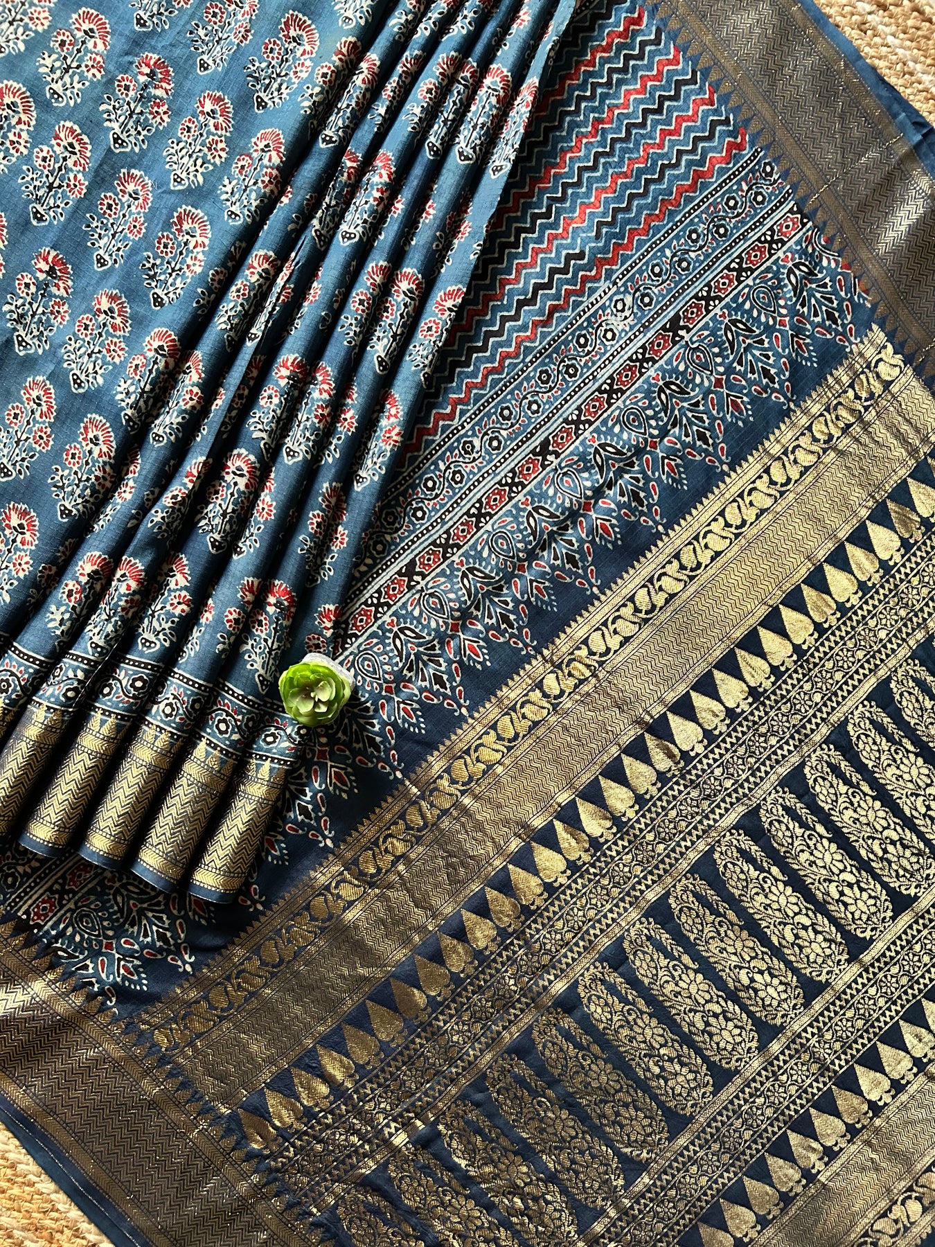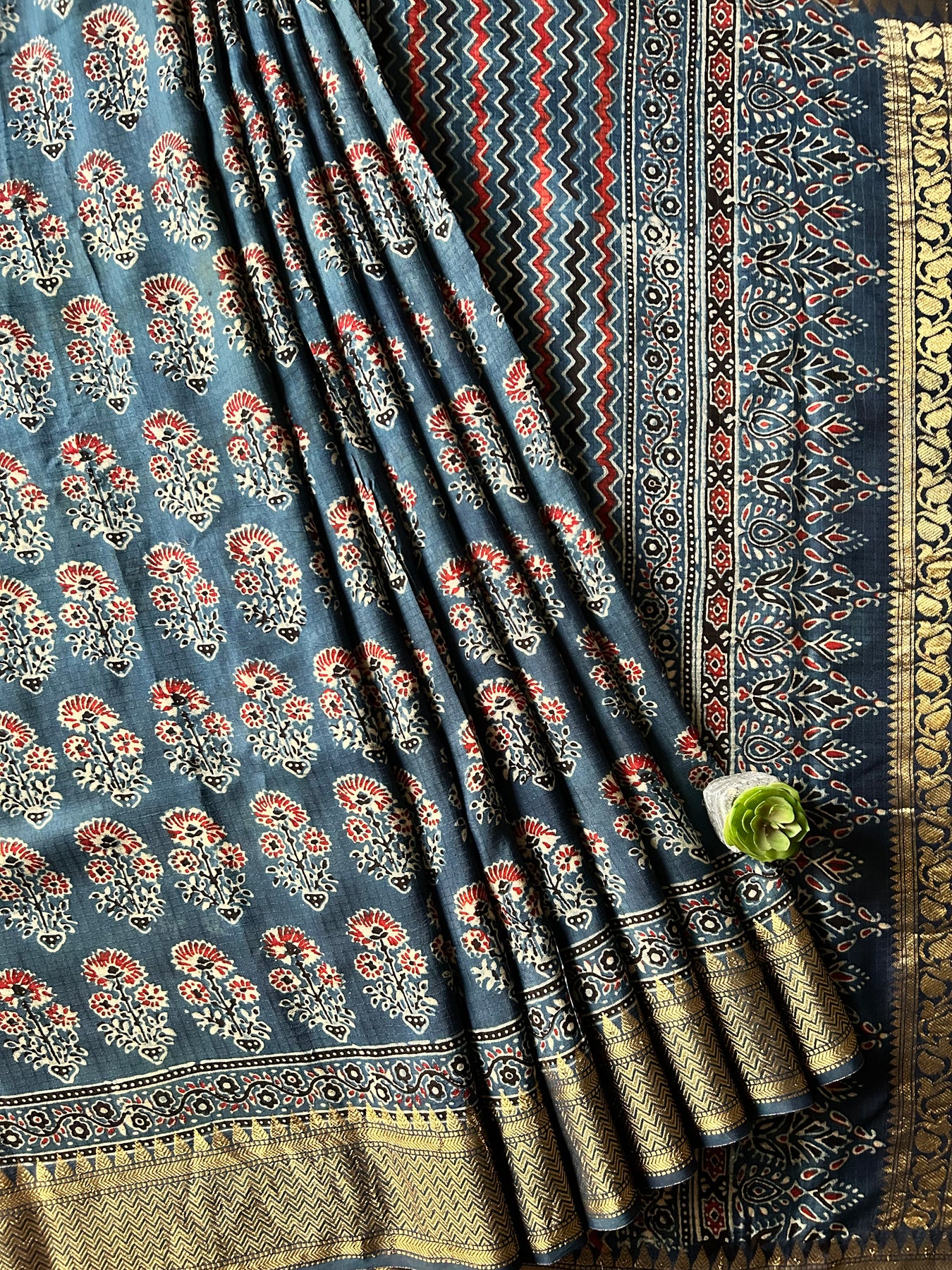 It’s a handmade product so there may be some irregularities are possible due to human hand involvement , this may enhance the beauty of handmade products. This saree is made by a young ajrakh artist from kutch Gujrat.