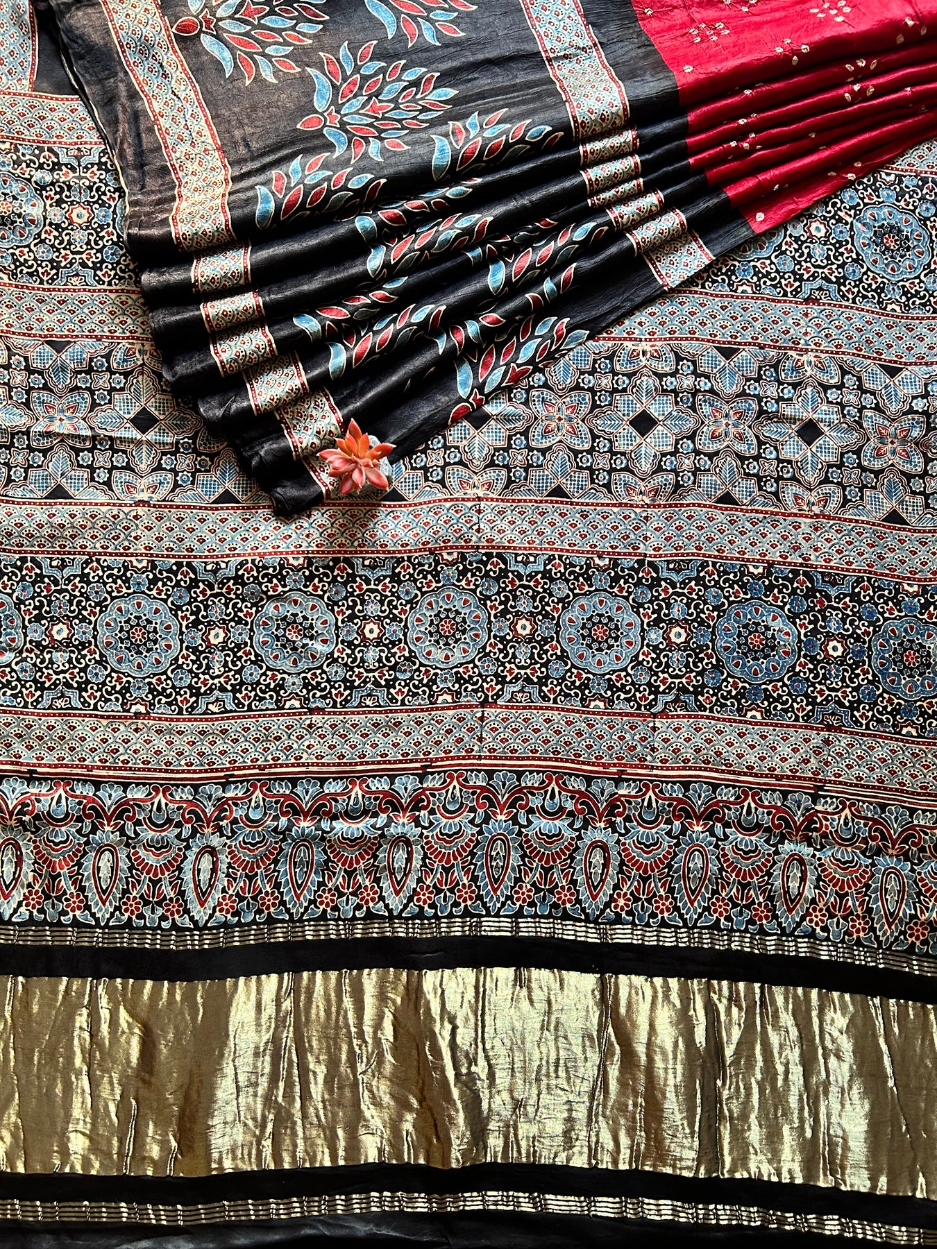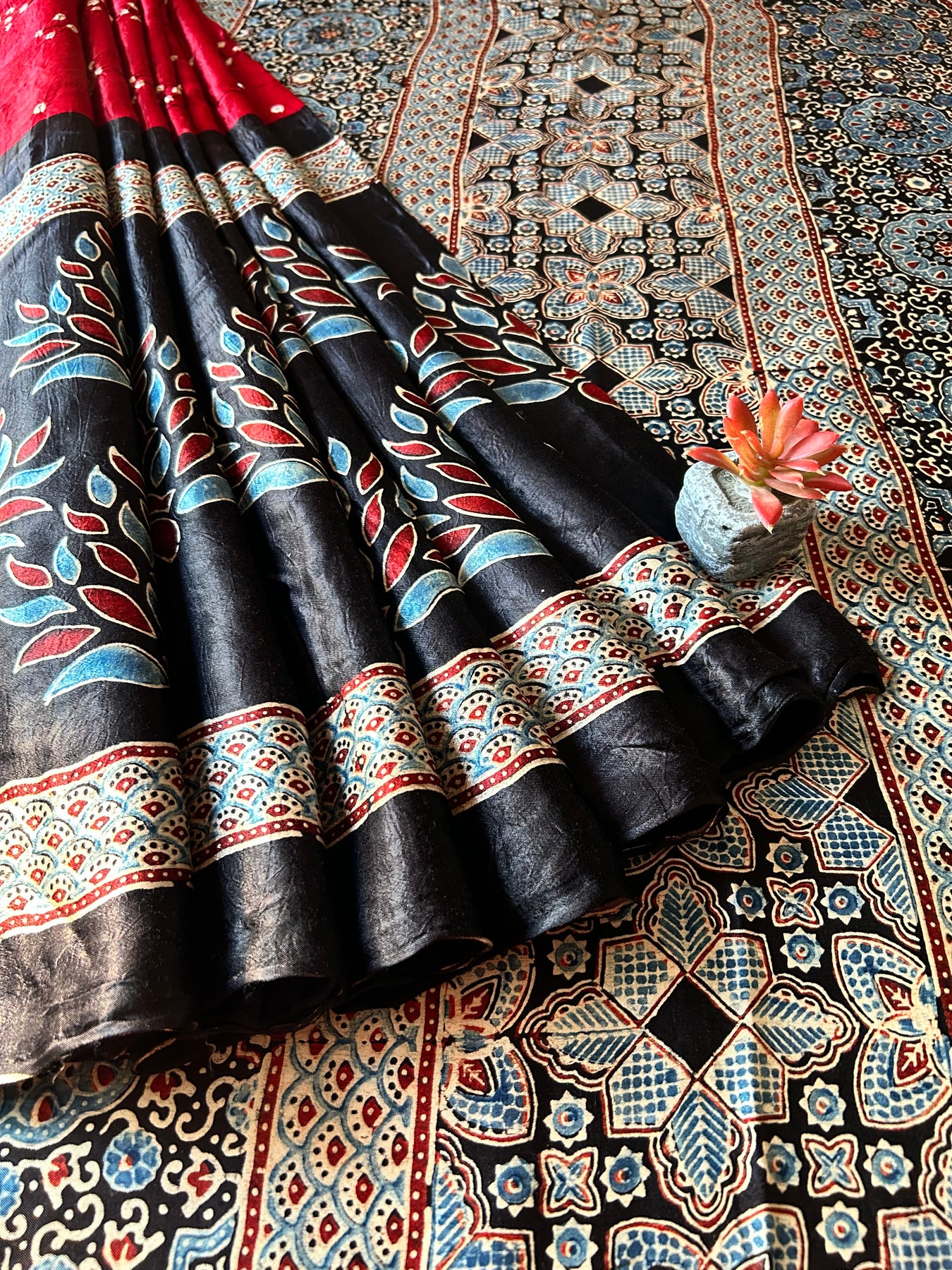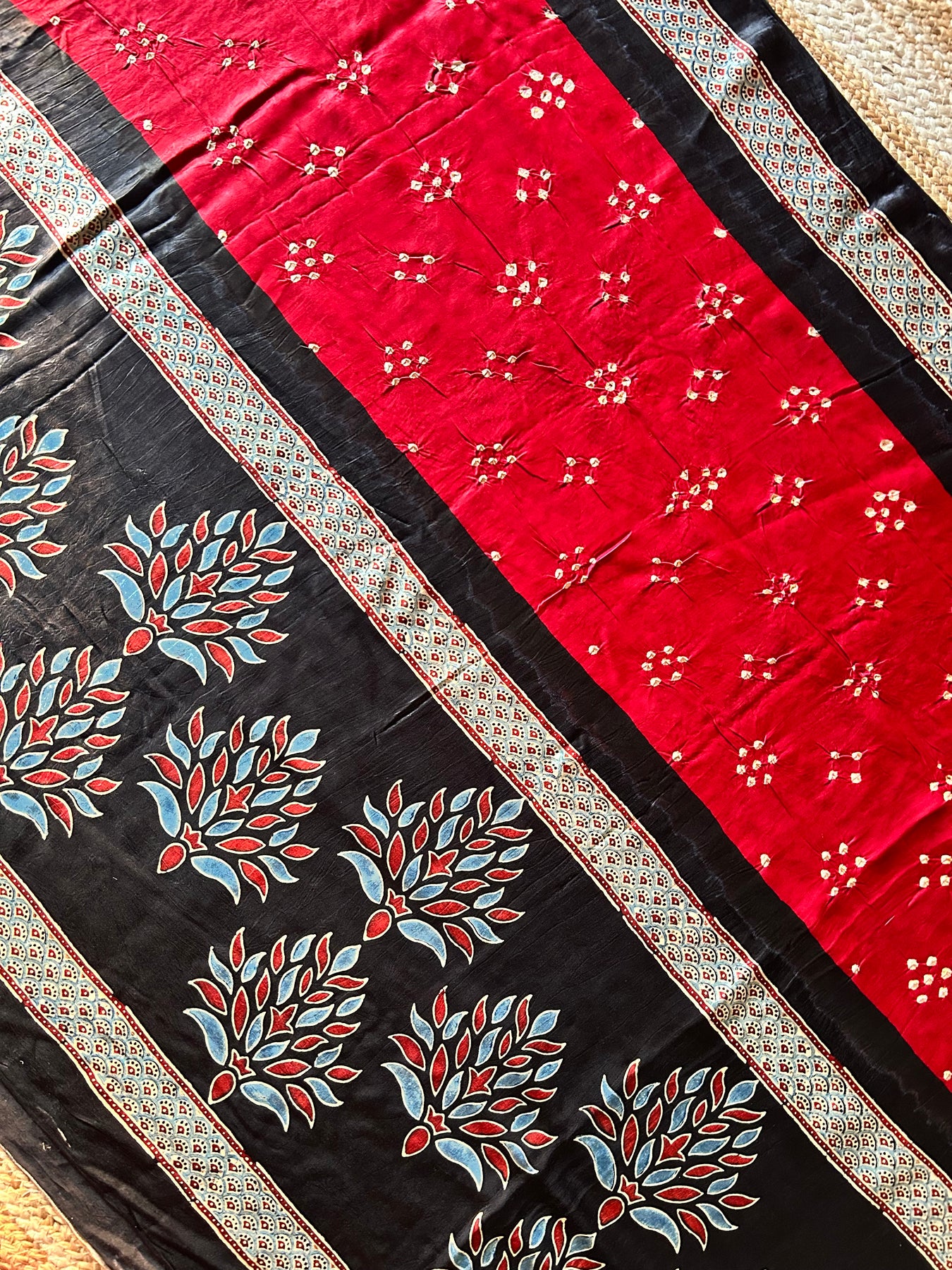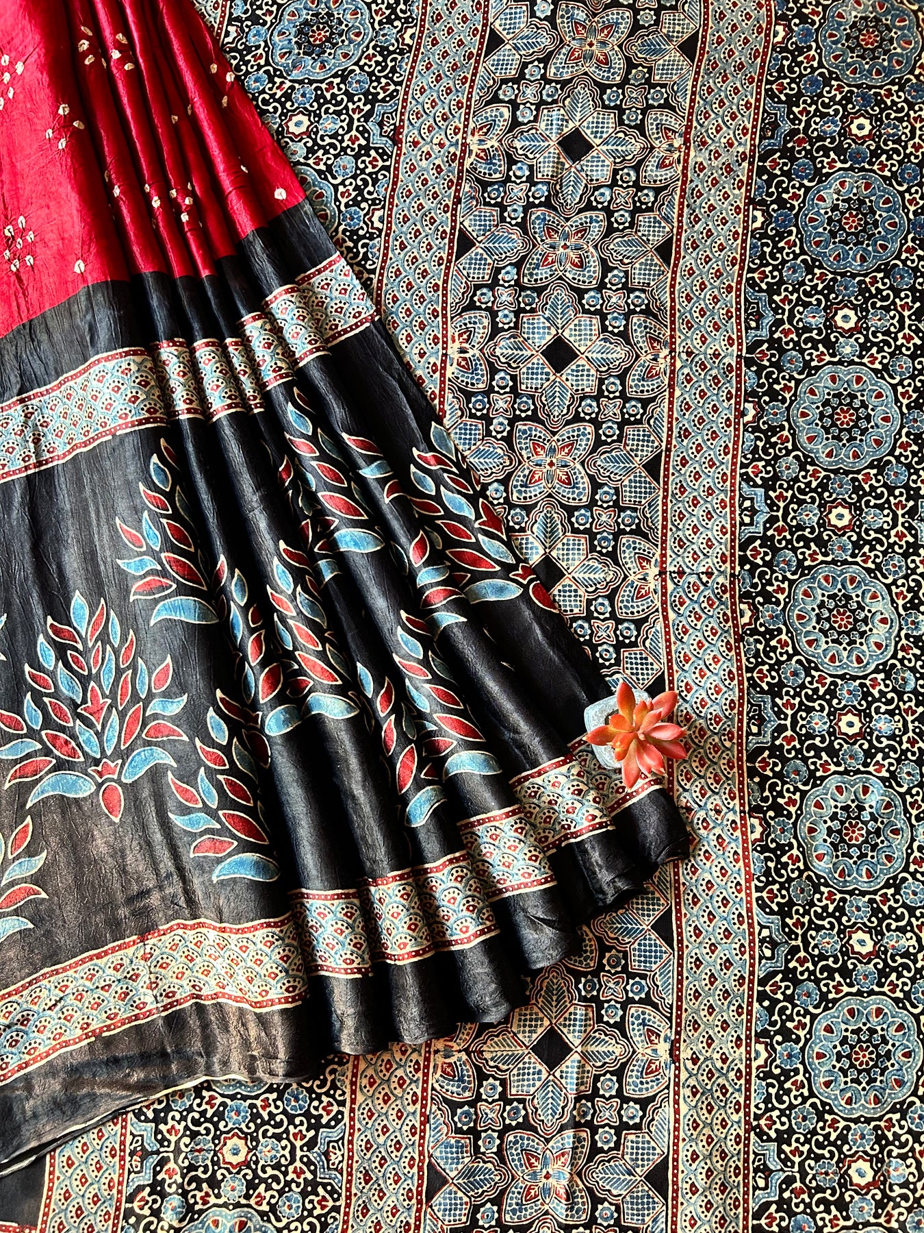 Handblock ajrakh print and designer bandhni craft with natural colors. |
