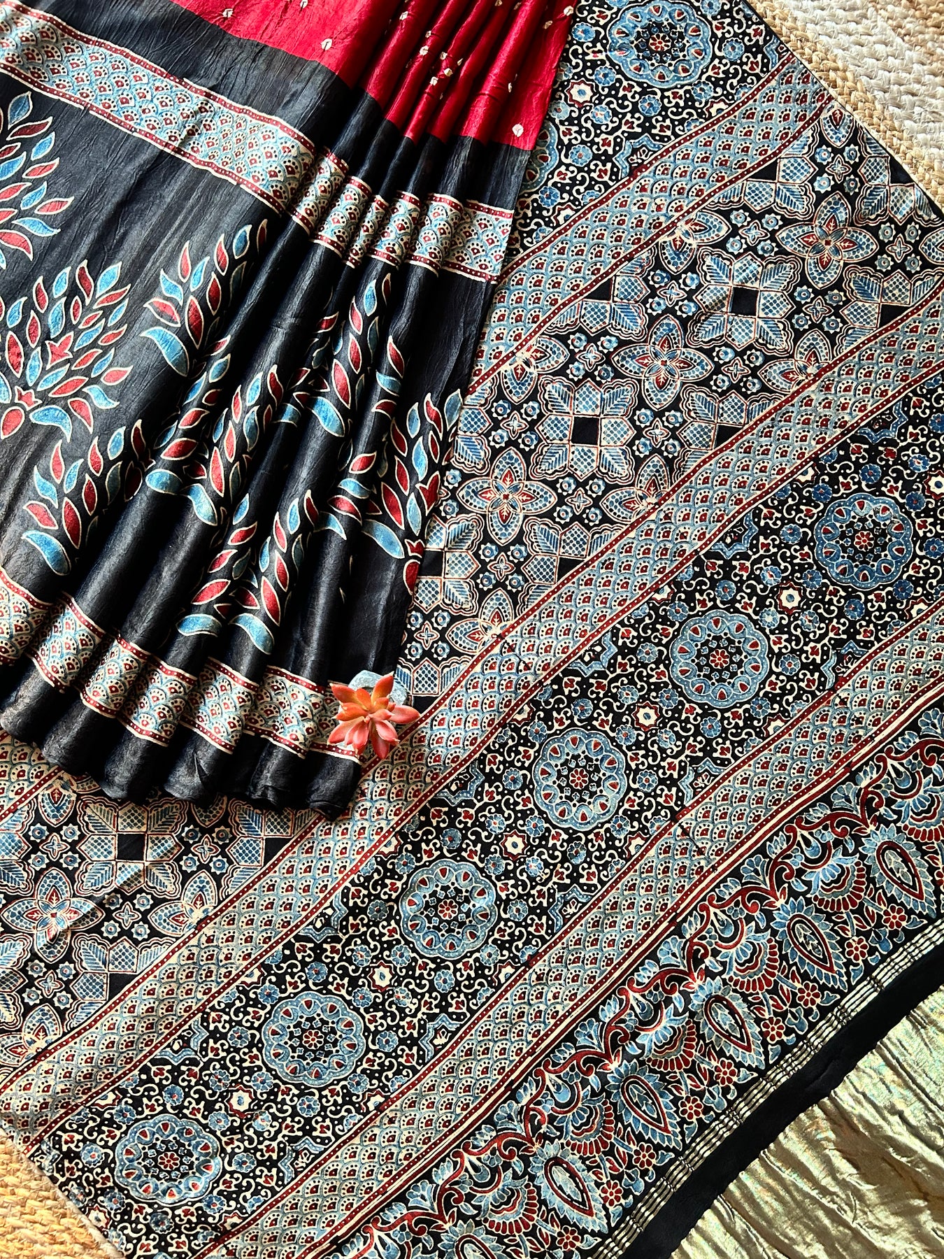 SUNDARI: RED,HANDMADE AJRAKH BANDHEJ MODAL SILK SAREE WITH TISSUE PALLU