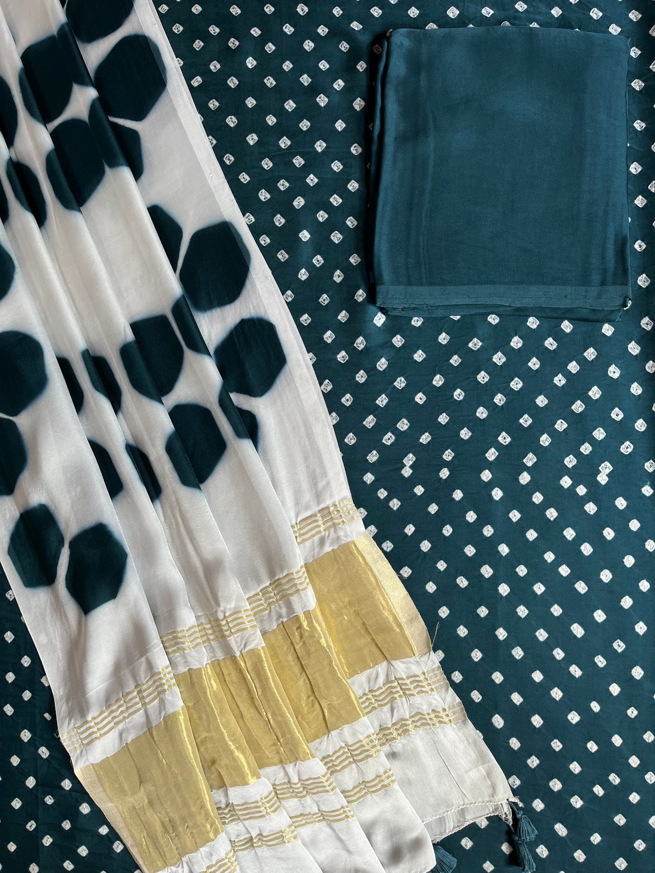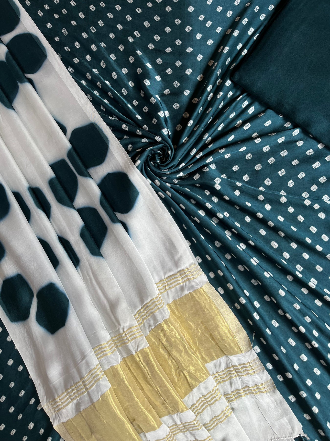 ARPITA :Handmade Designer Bandhnai- Clamp Modal Silk 3 Piece Suit Set.