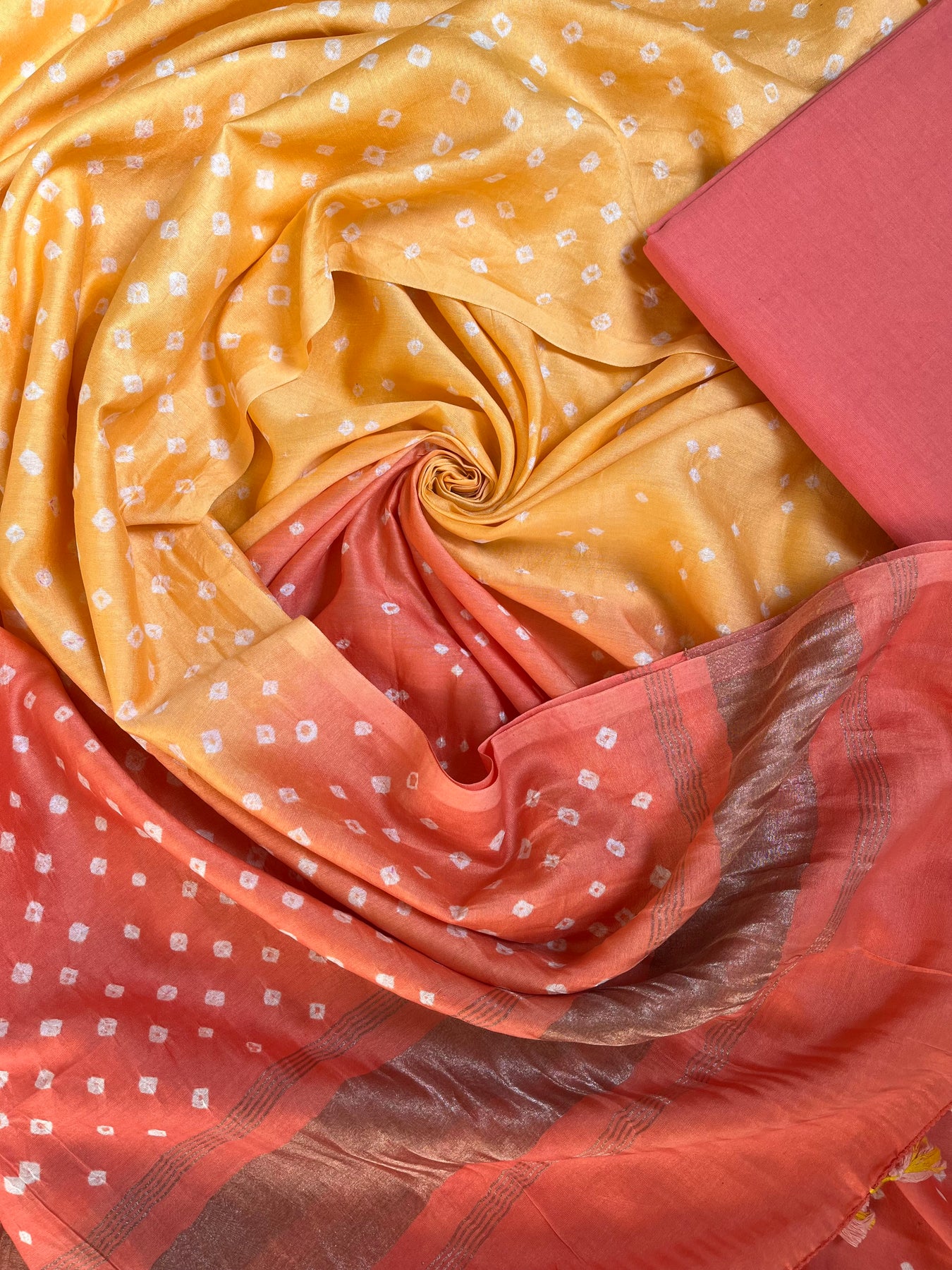 FAZAR :Handmade Designer Bandhnai Chanderi Silk- Cott 3 Piece Suit Set.