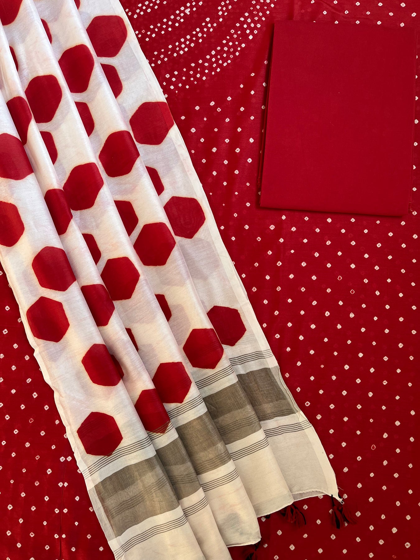 PALLAVI :Handmade Designer Bandhnai- Clamp Chanderi Silk- Cott 3 Piece Suit Set.