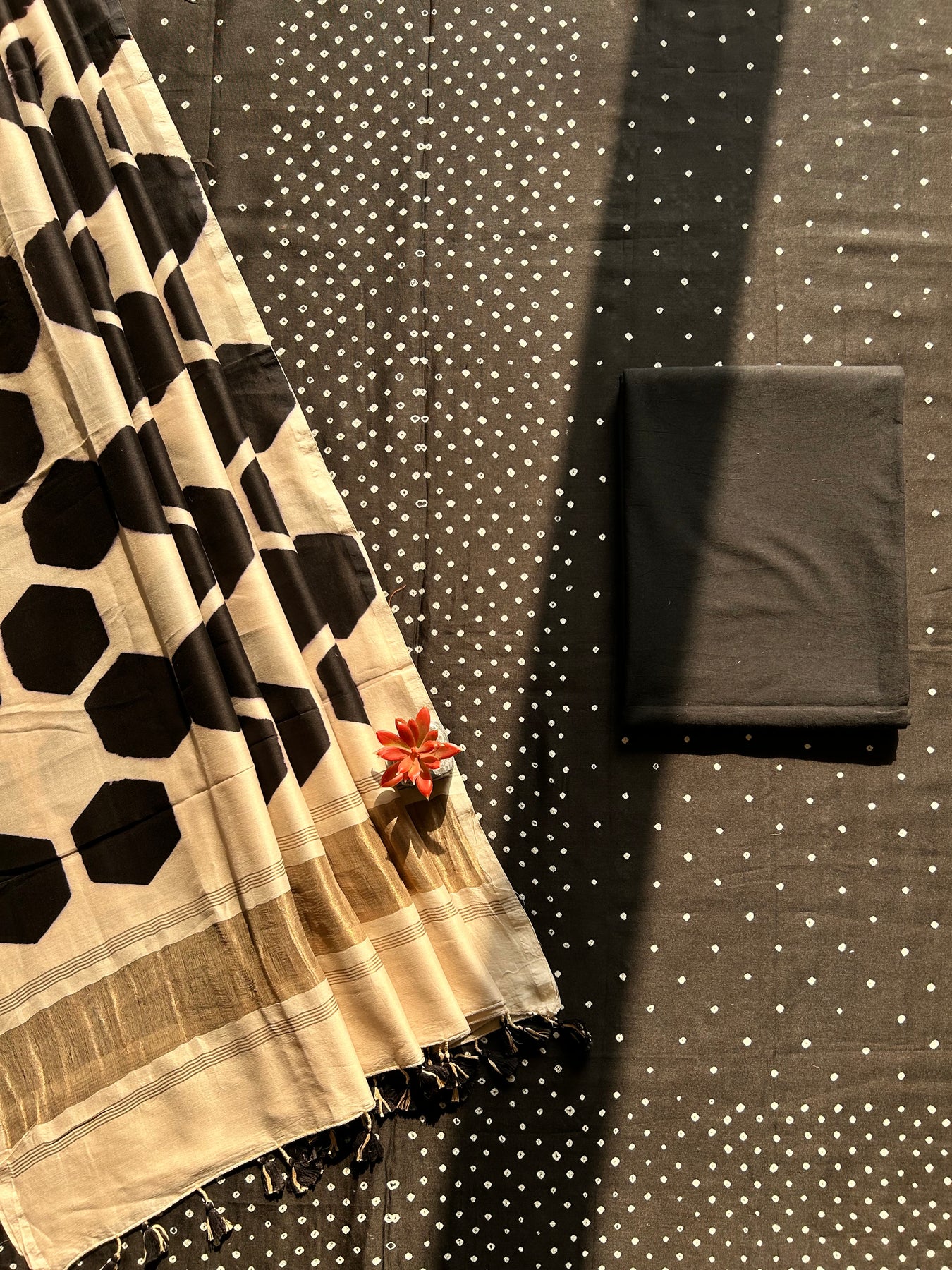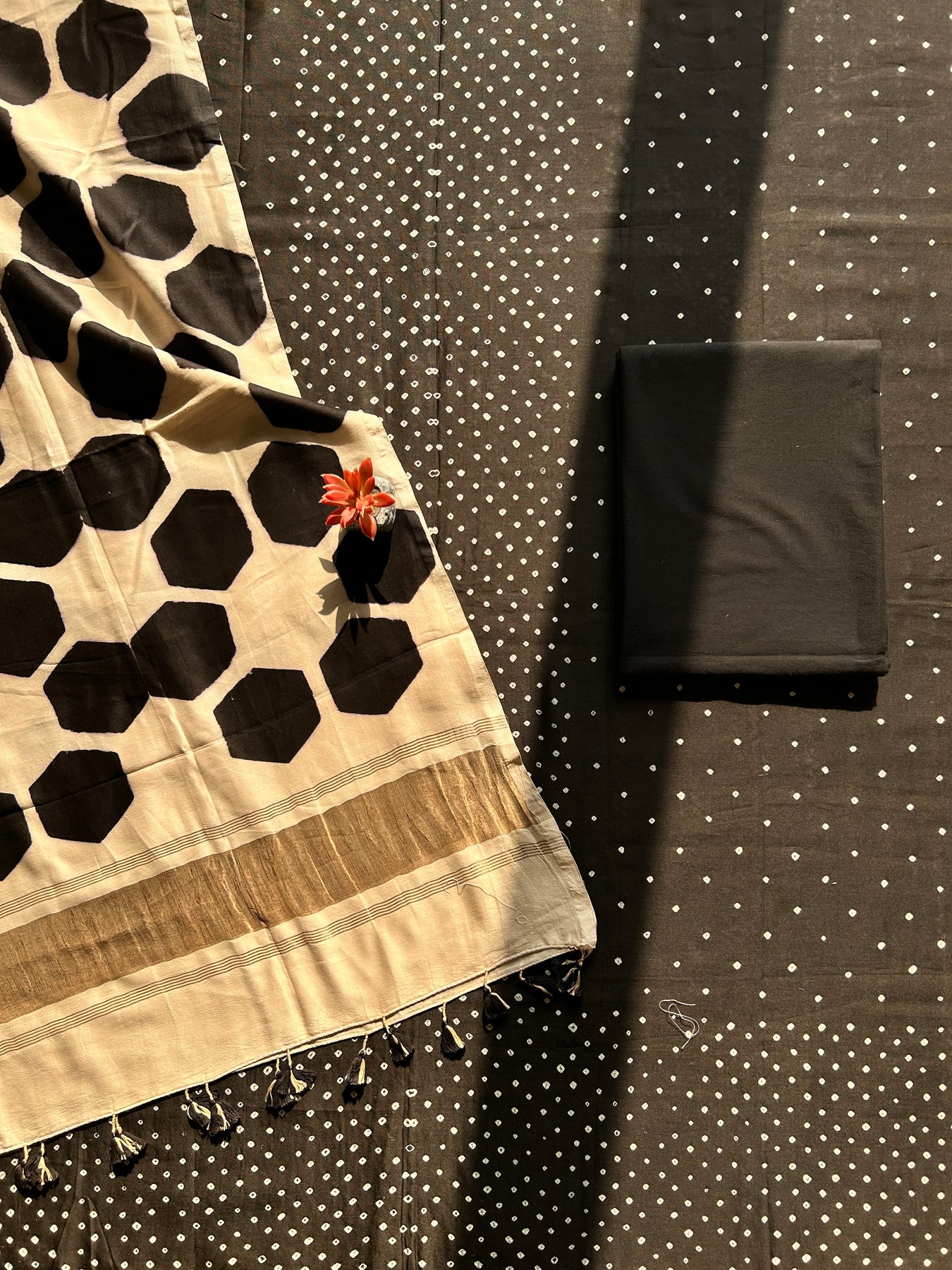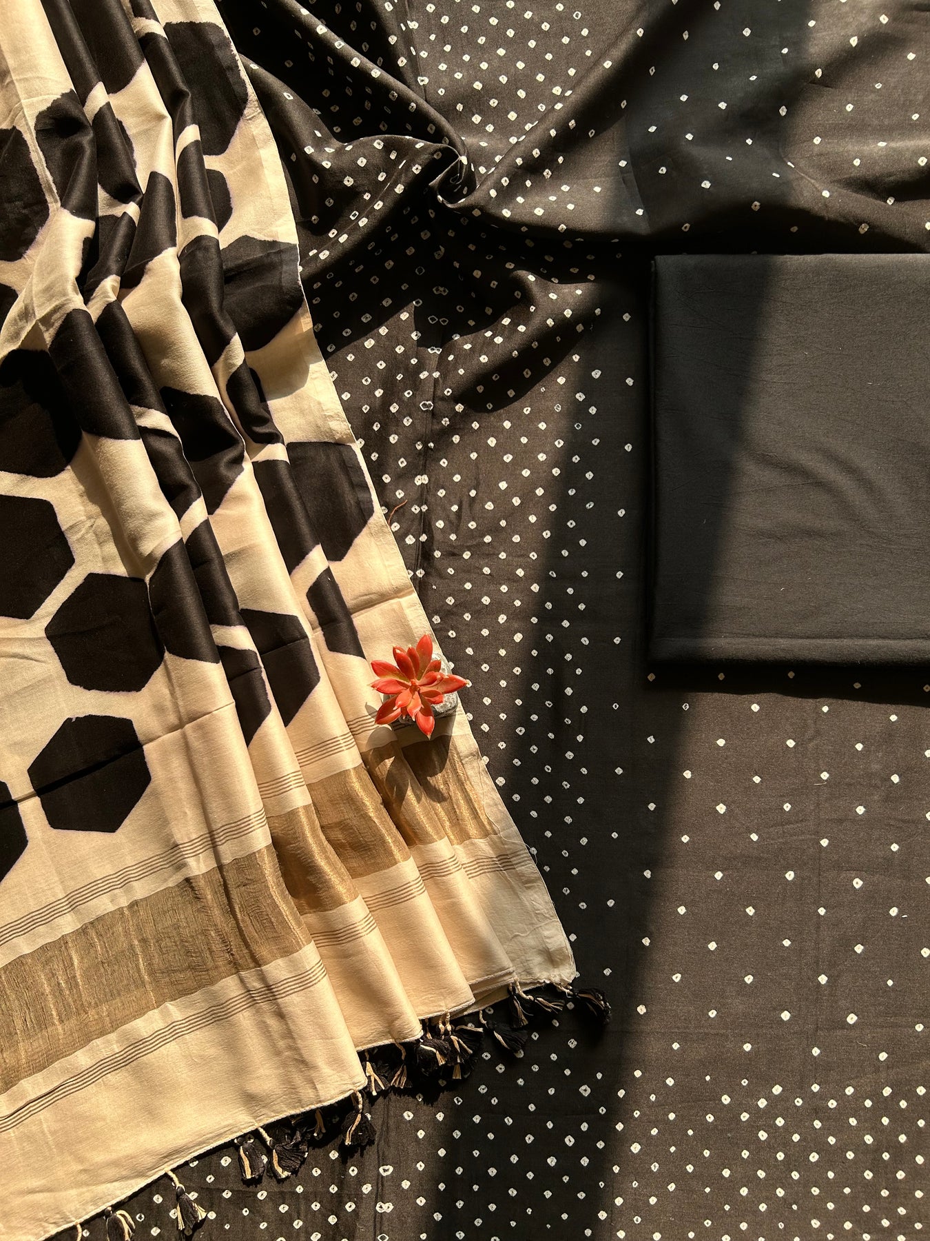 RANGSUTRA:Handmade Designer Bandhnai Chanderi Silk- Cott 3 Piece Suit Set.