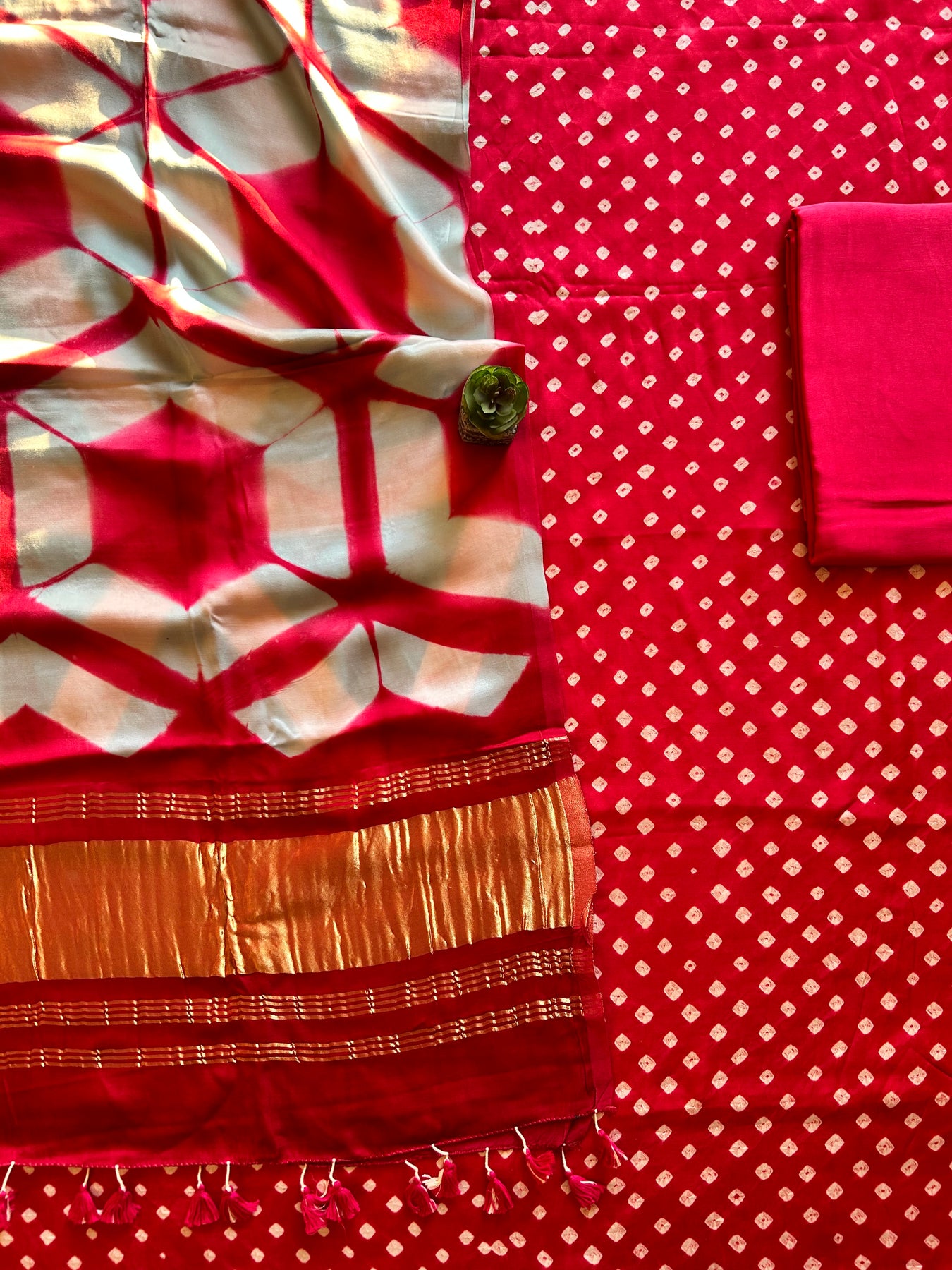 Kasturi:Handmade Designer Bandhnai- Clamp Modal Silk 3 Piece Suit Set.