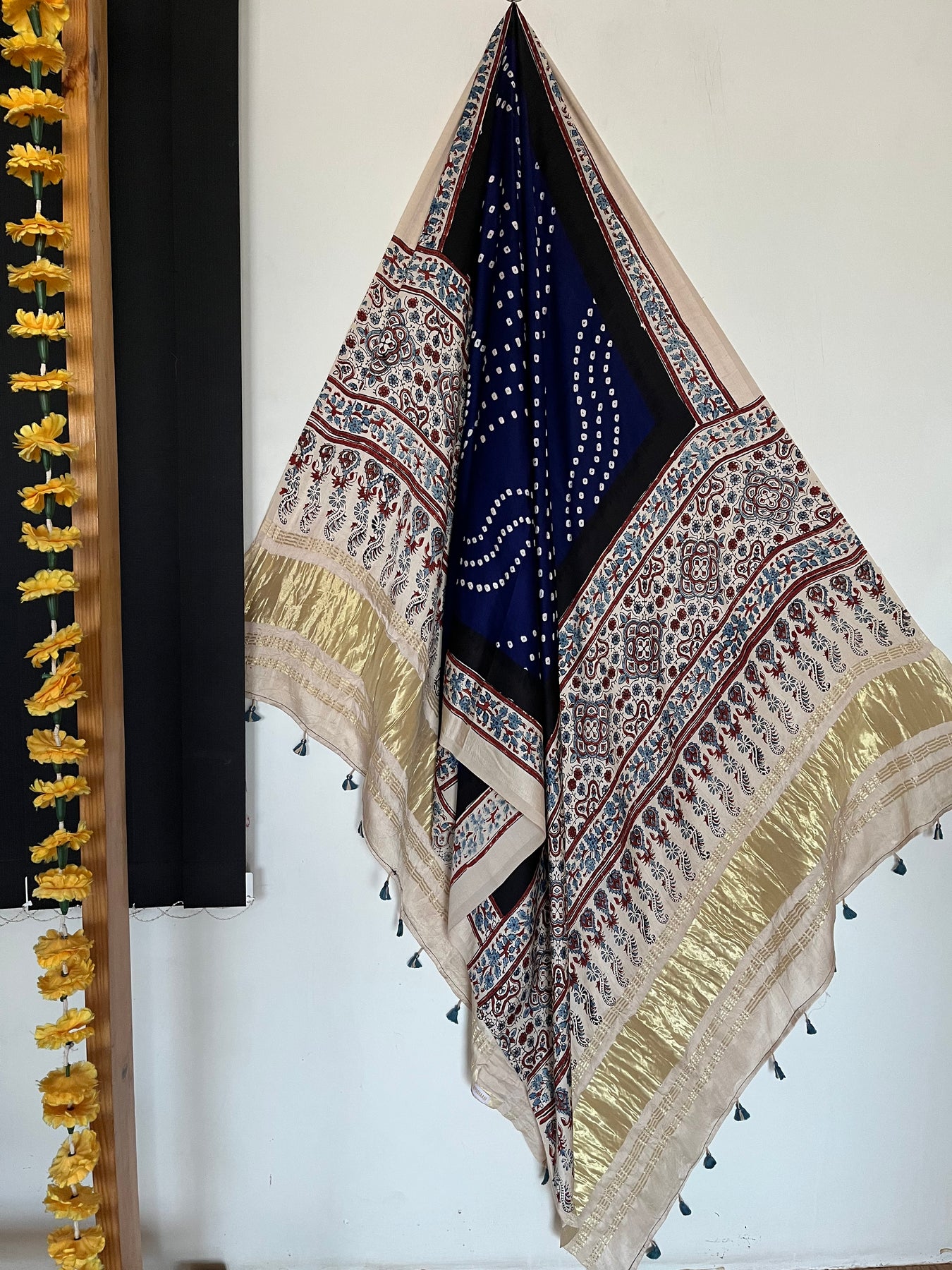 Material: Handblock printed modal silk ajrakh - Bandhej shawl accessorised with tassels.