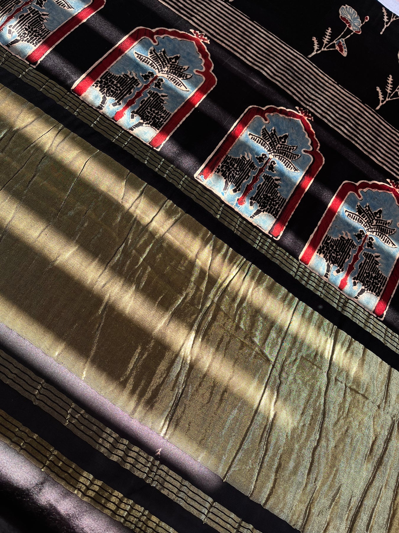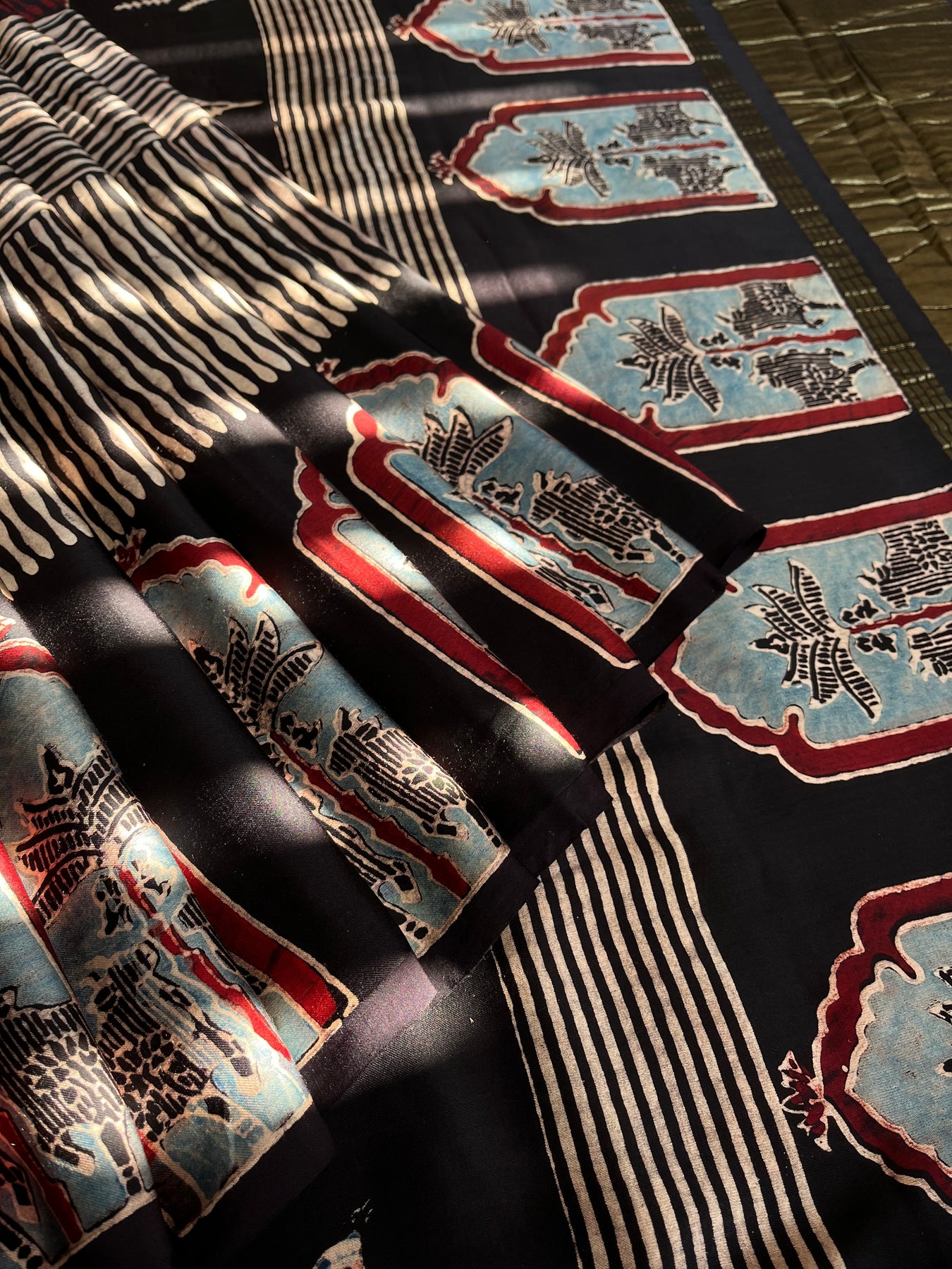 CHANDRIKA: Handblock Ajrakh Modal Silk Tissue Pallu Saree