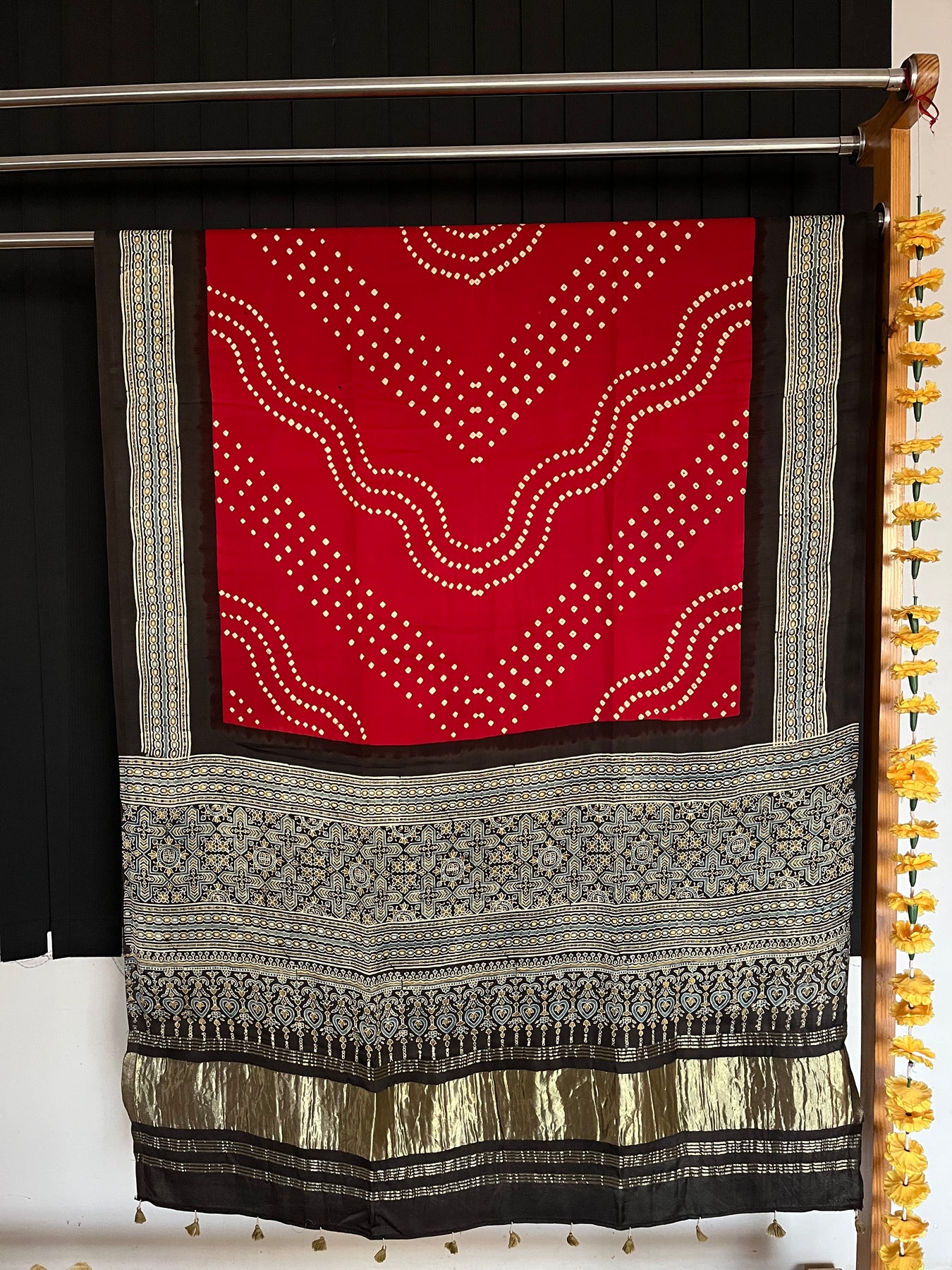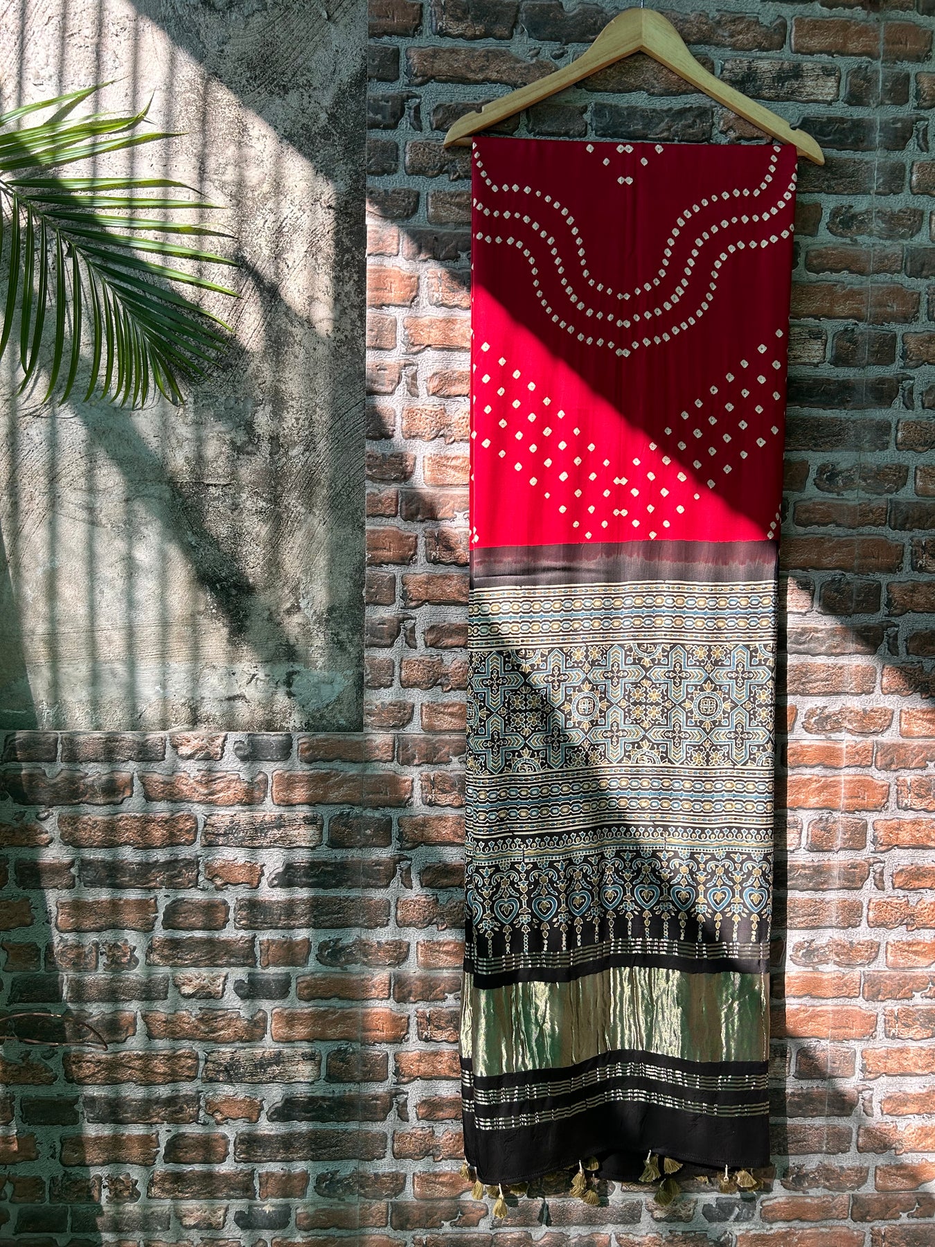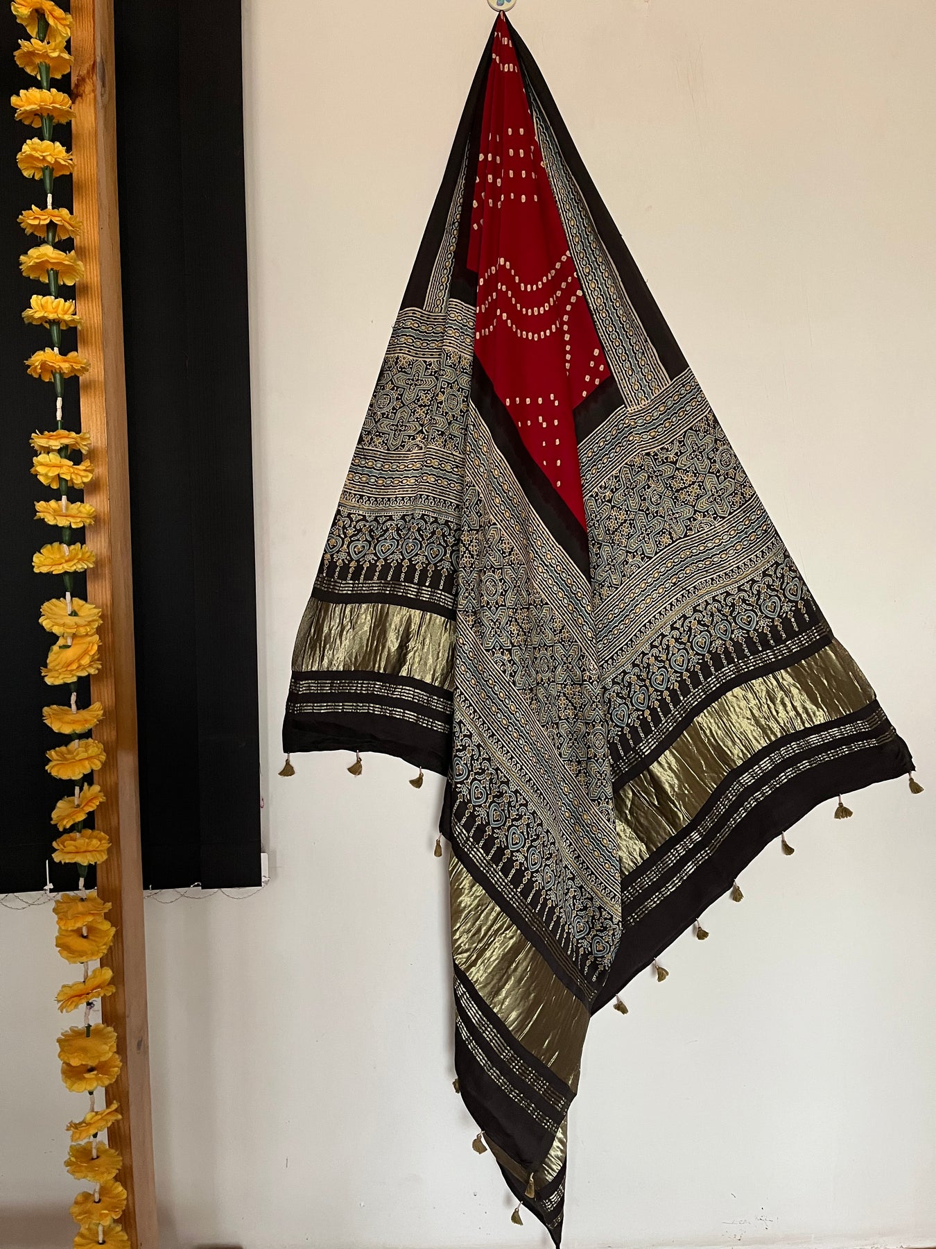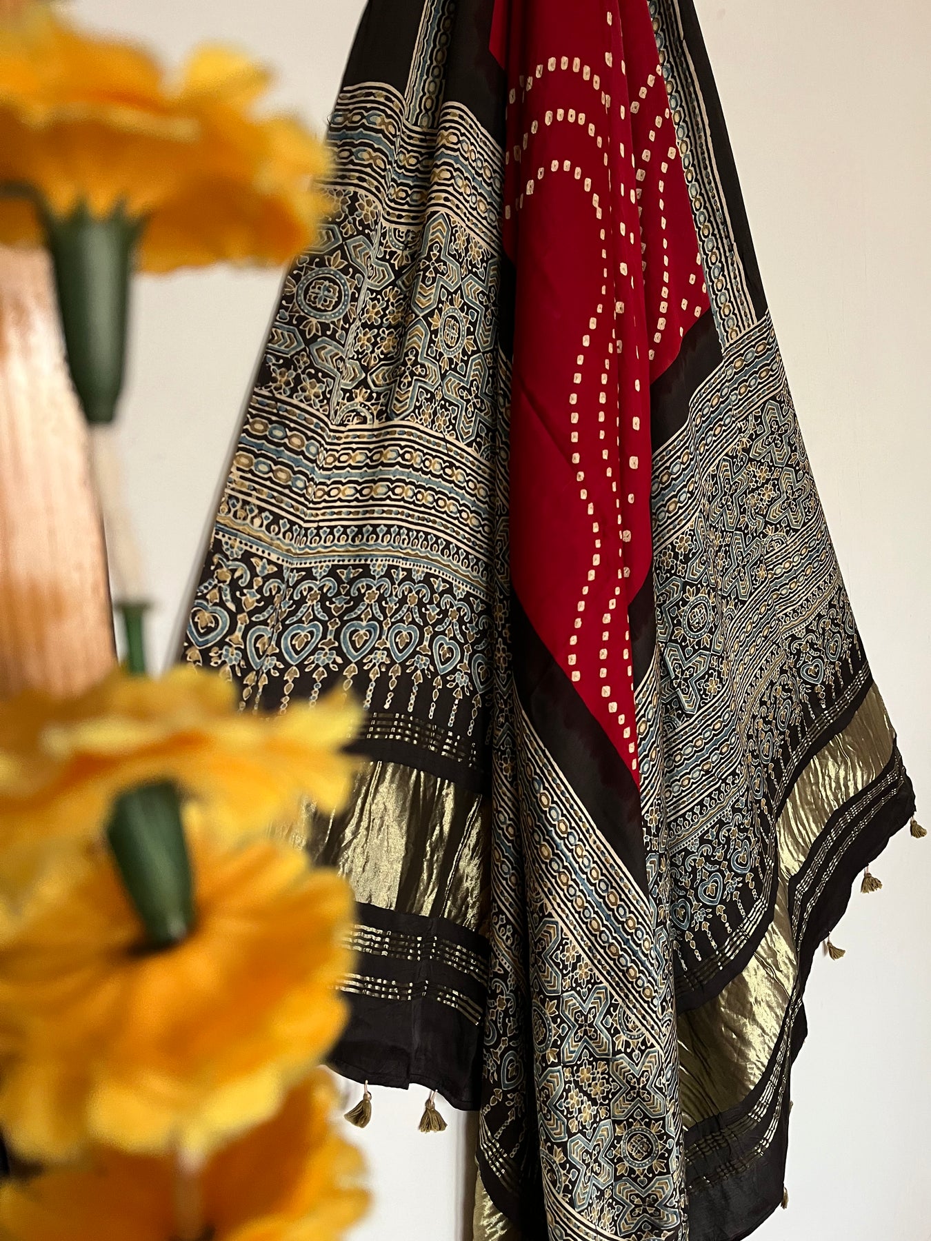 IRA : HANDMADE BANDHANI AJRAKH MODAL SILK DUPATTA WITH TISSUE