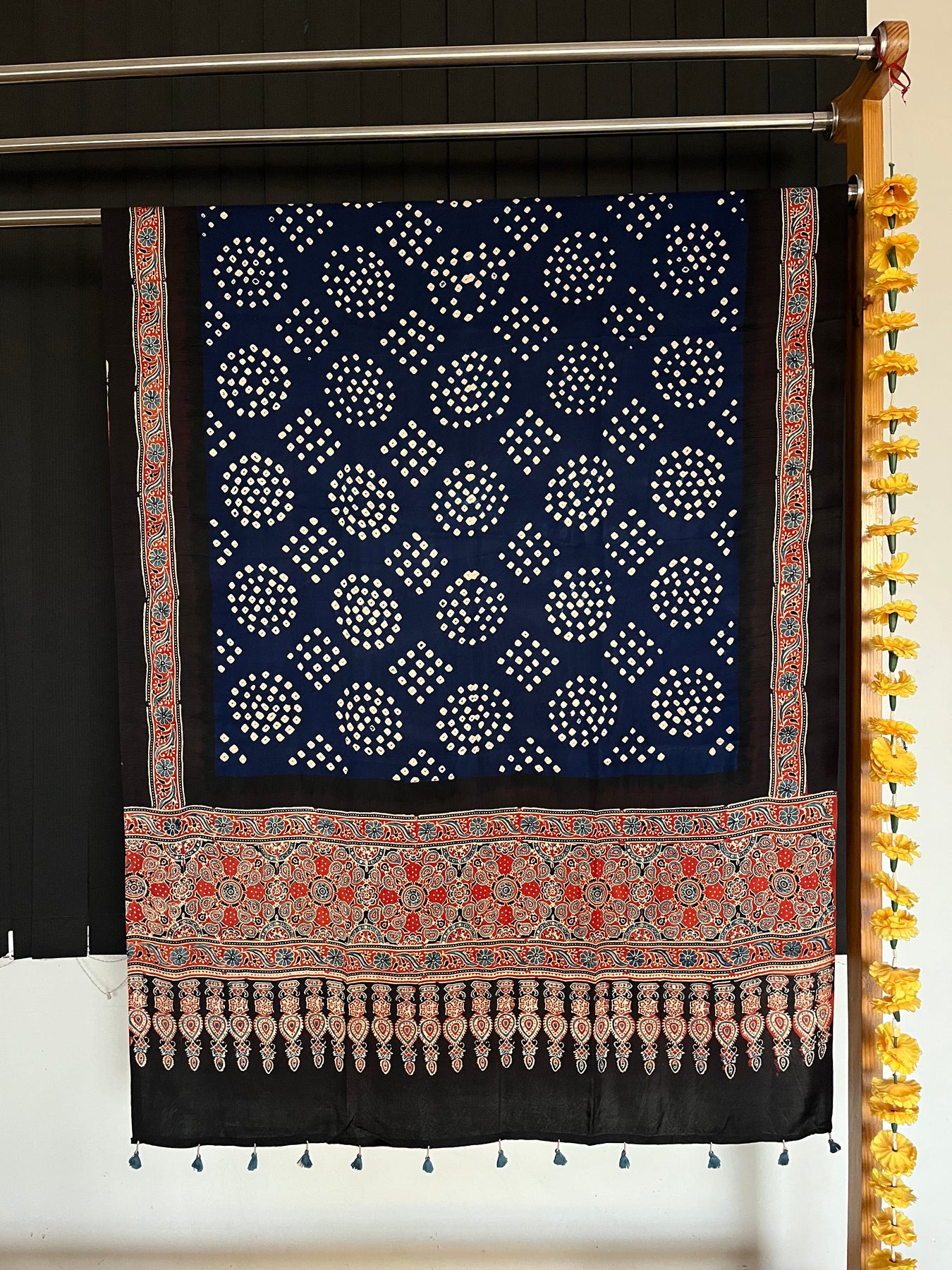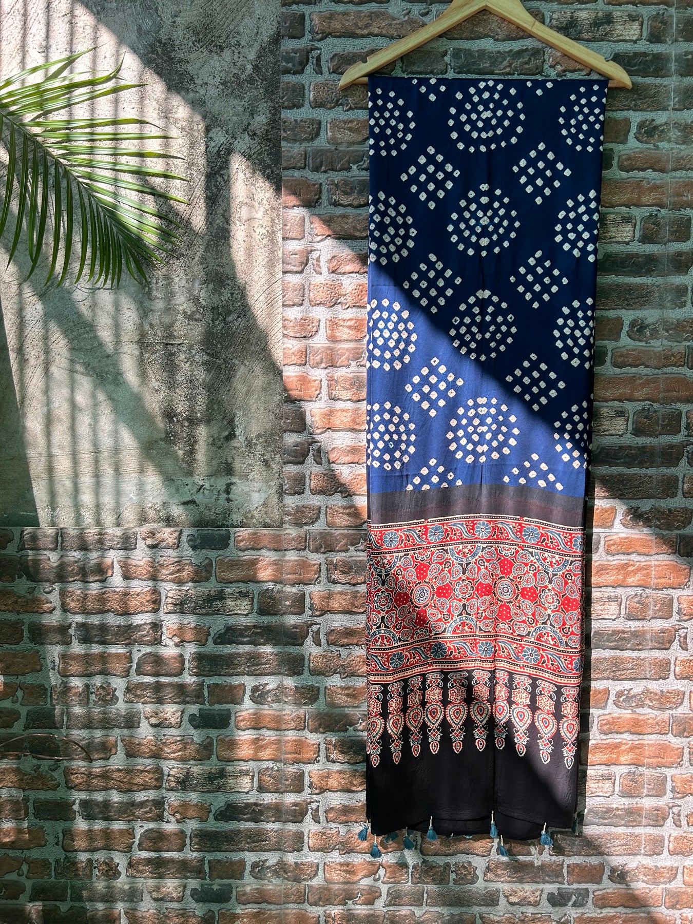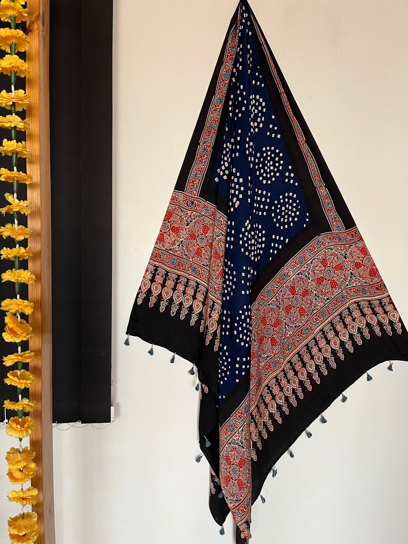 Material: Handblock printed modal silk ajrakh - Bandhej shawl accessorised with tassels.