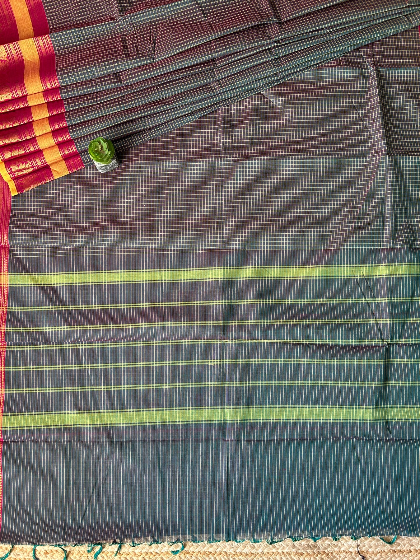KAVERI: KANCHIPURAM PURE COTTON GINGHAM CHECKS SAREE WITH ZARI BORDERS.