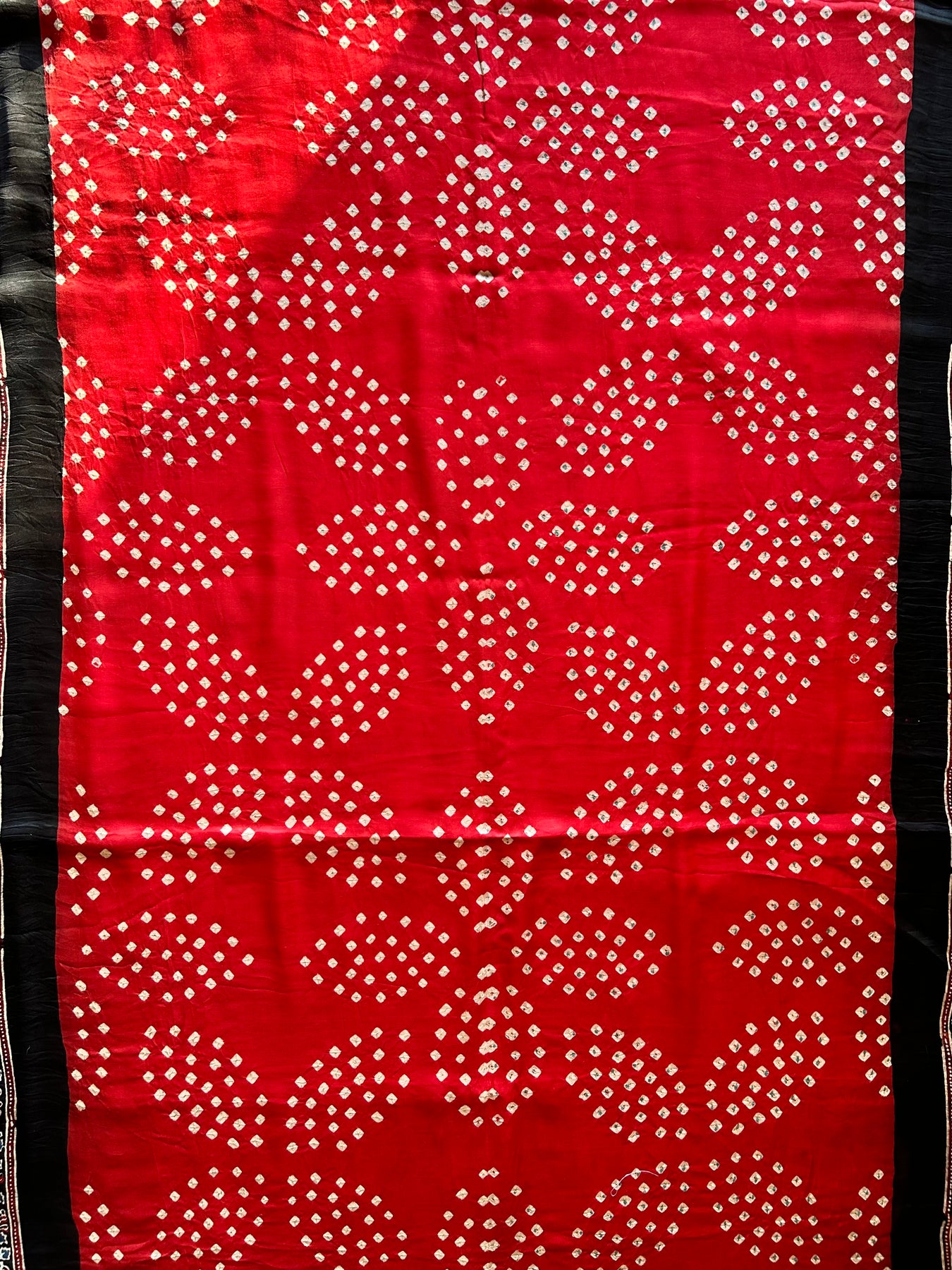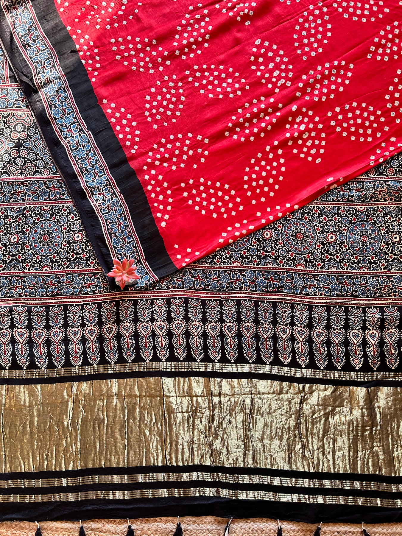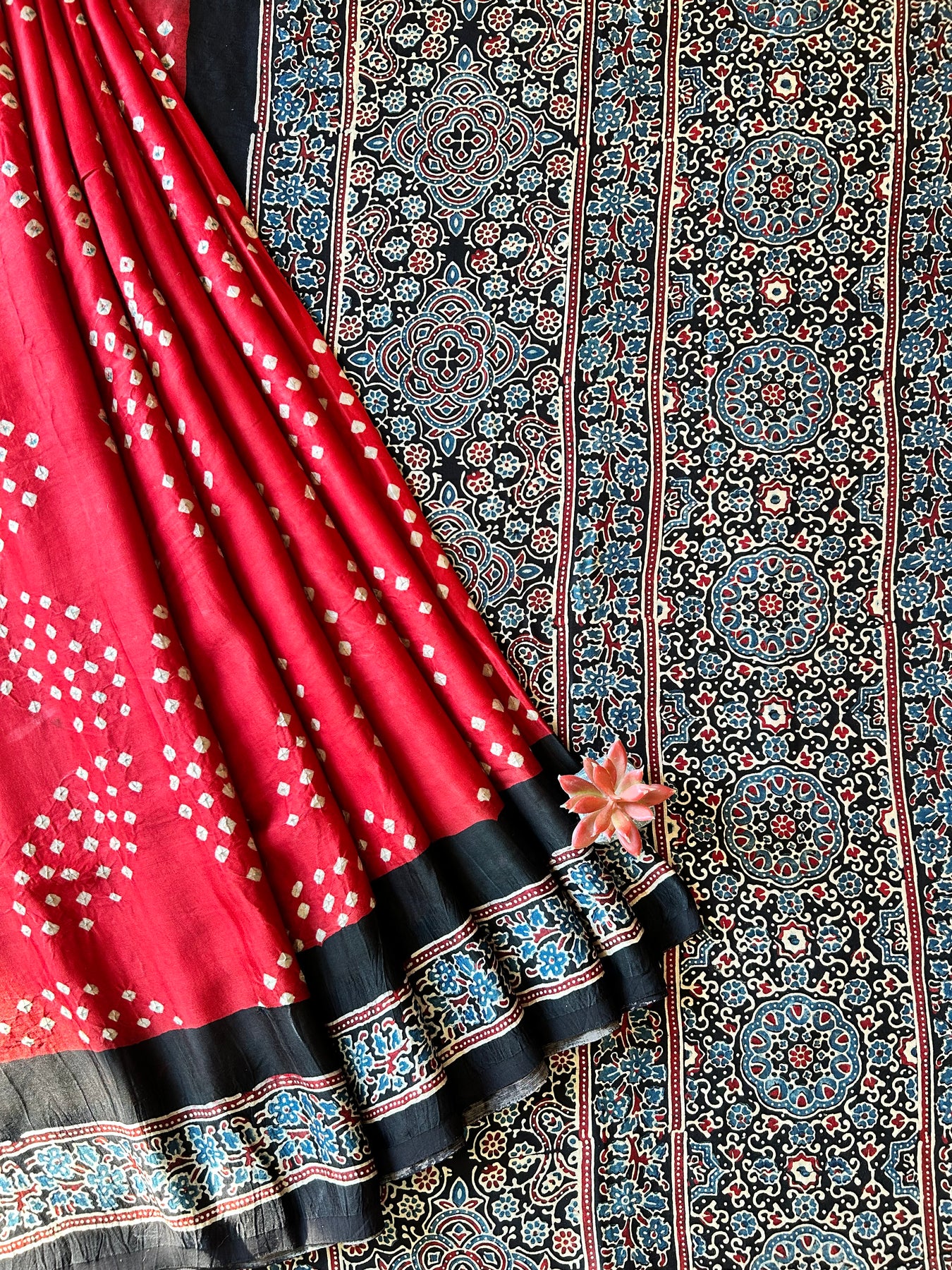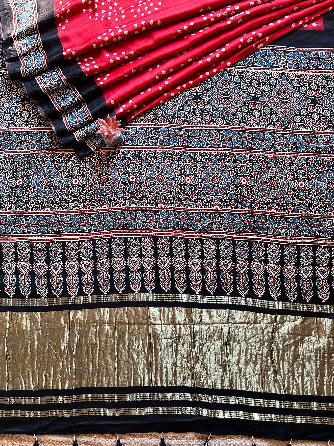 KAVYA: RED,HANDMADE AJRAKH BANDHEJ MODAL SILK SAREE WITH TISSUE PALLU