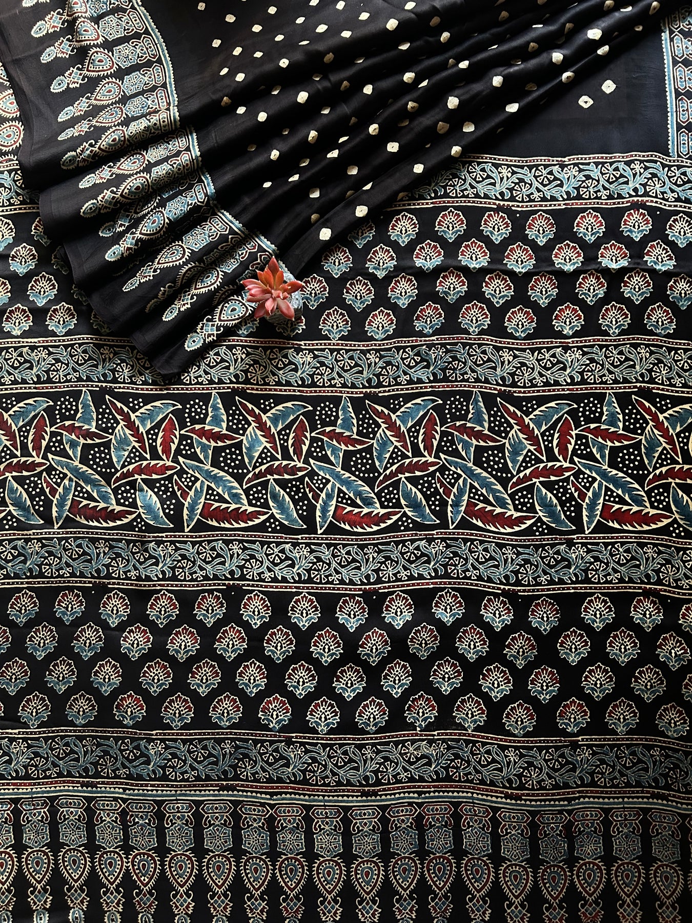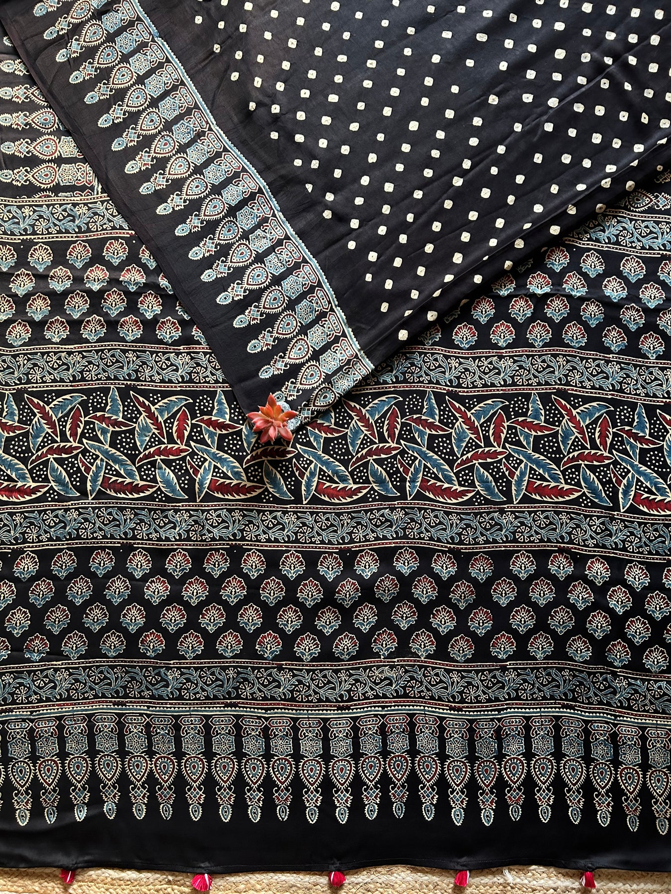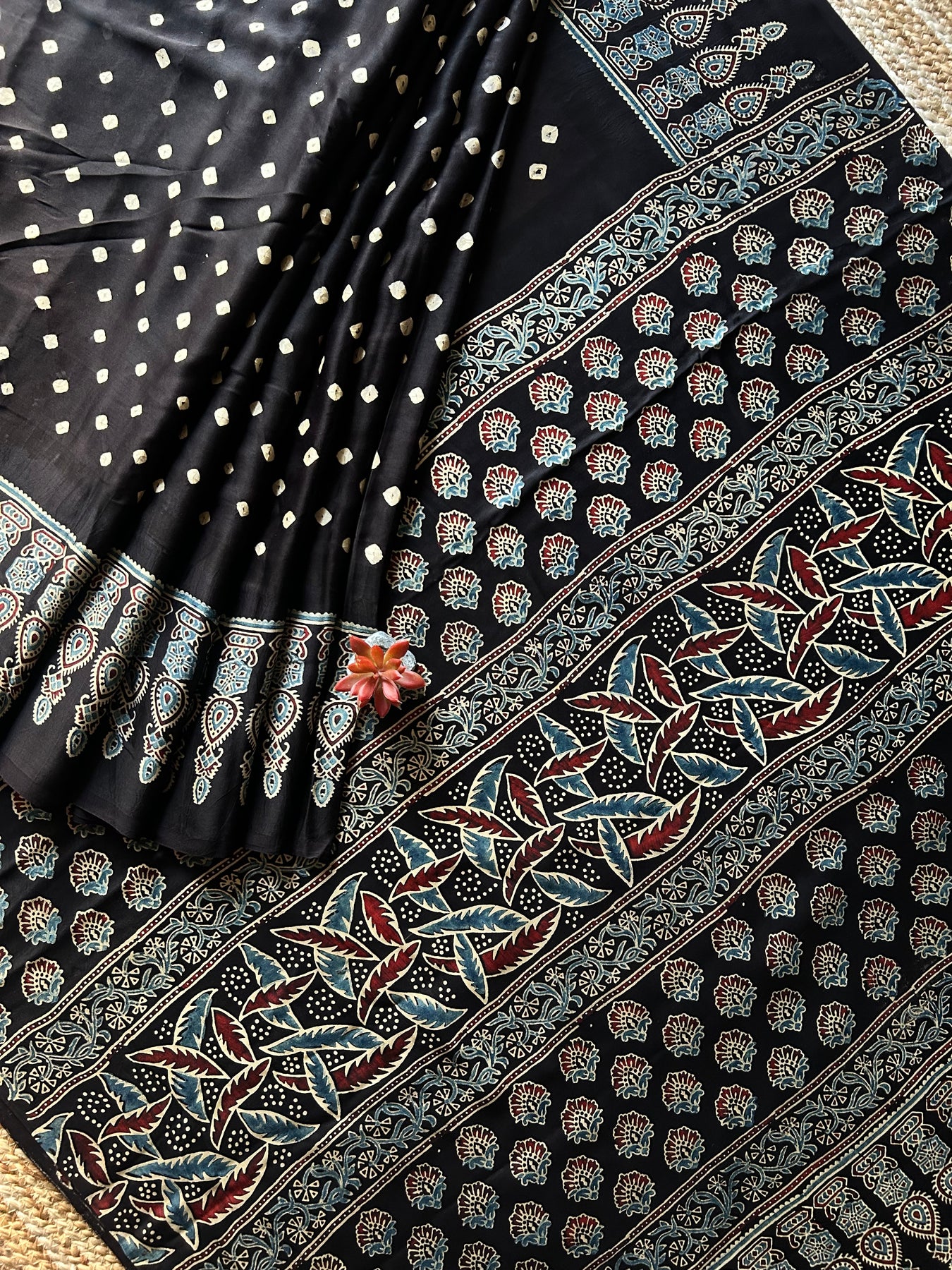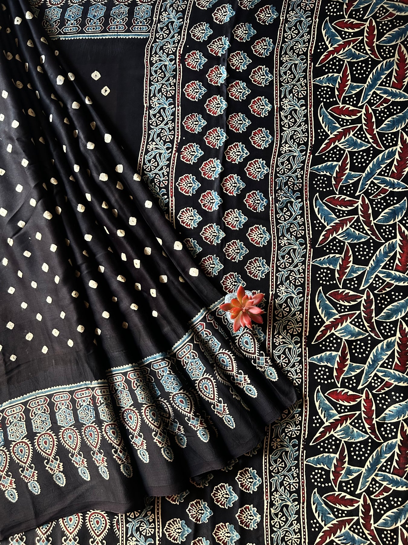 KRISHNA:BLACK,HANDMADE AJRAKH BANDHEJ MODAL SILK SAREE