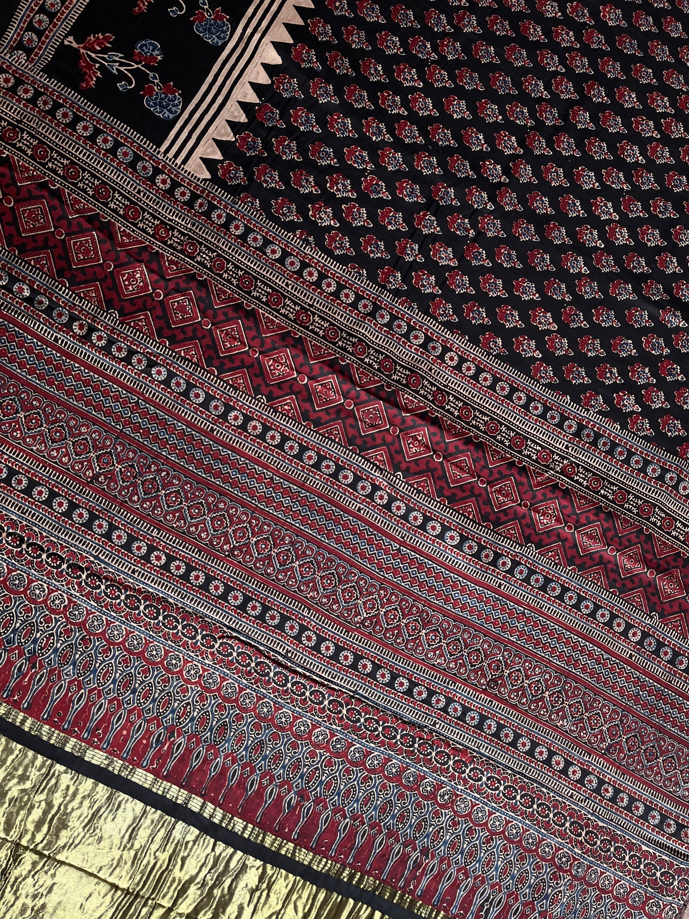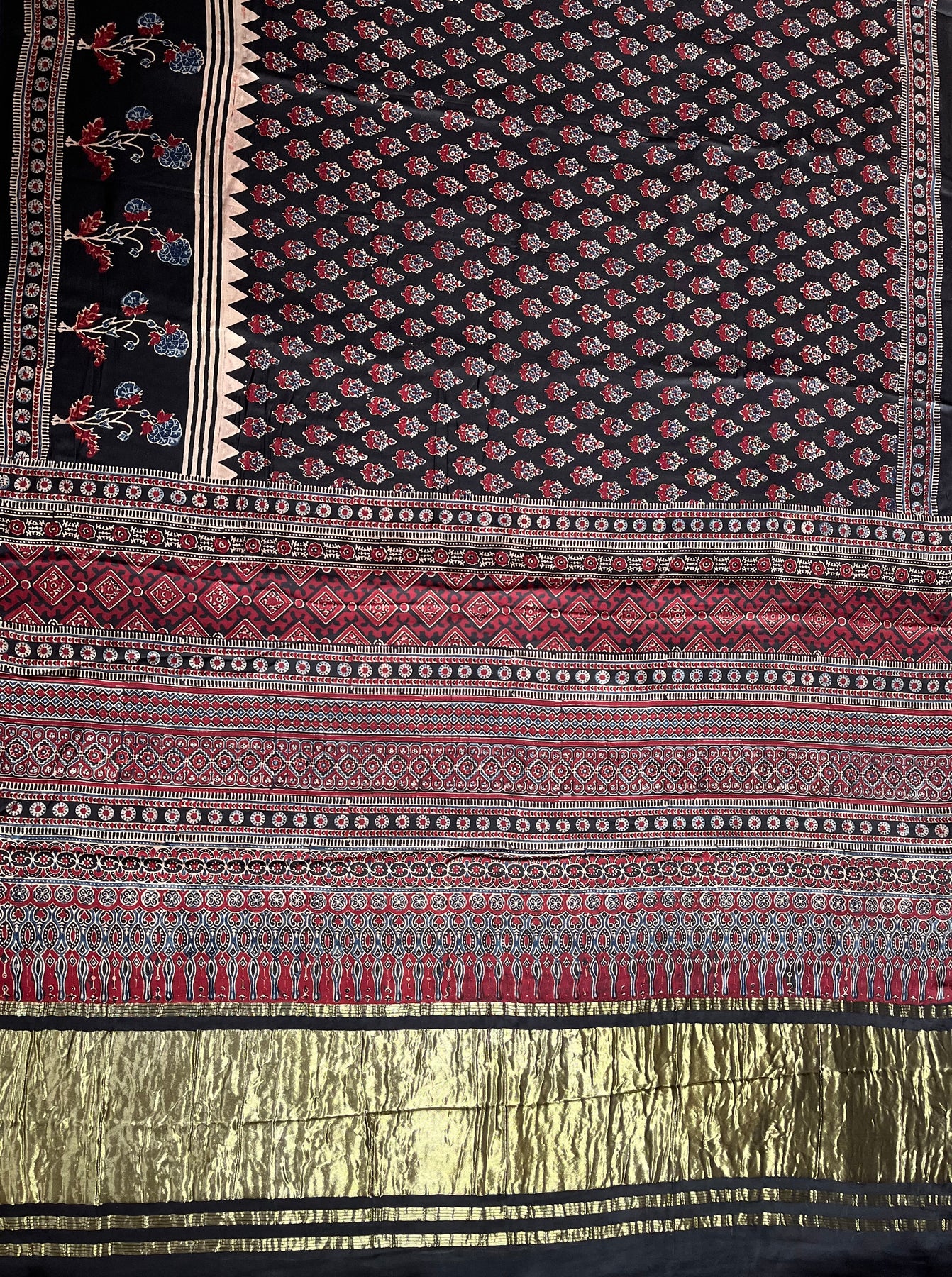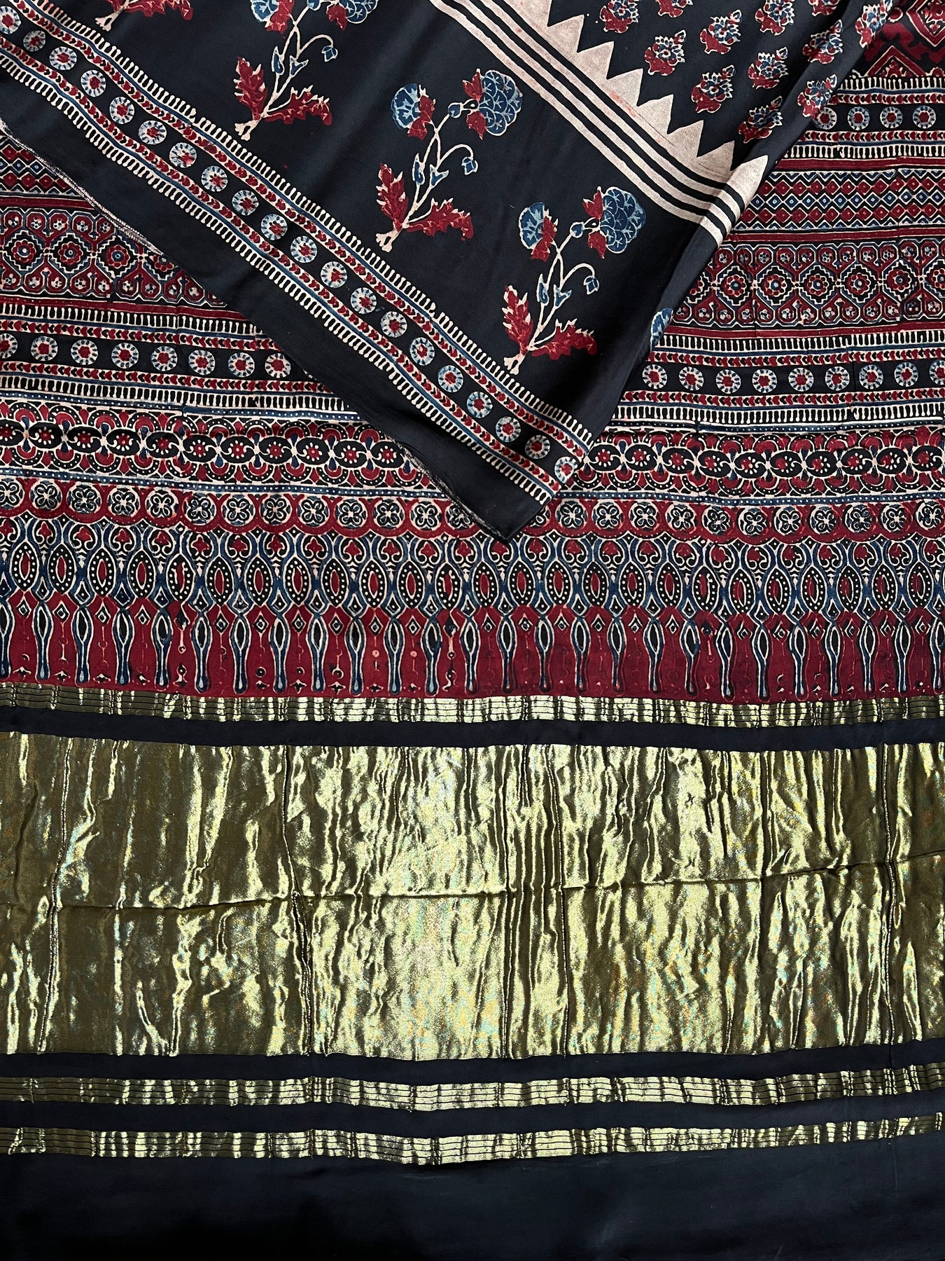 KRISHNA:BLACK,HANDBLOCK AJRAKH MODAL SILK SAREE WITH TISSUE PALLU