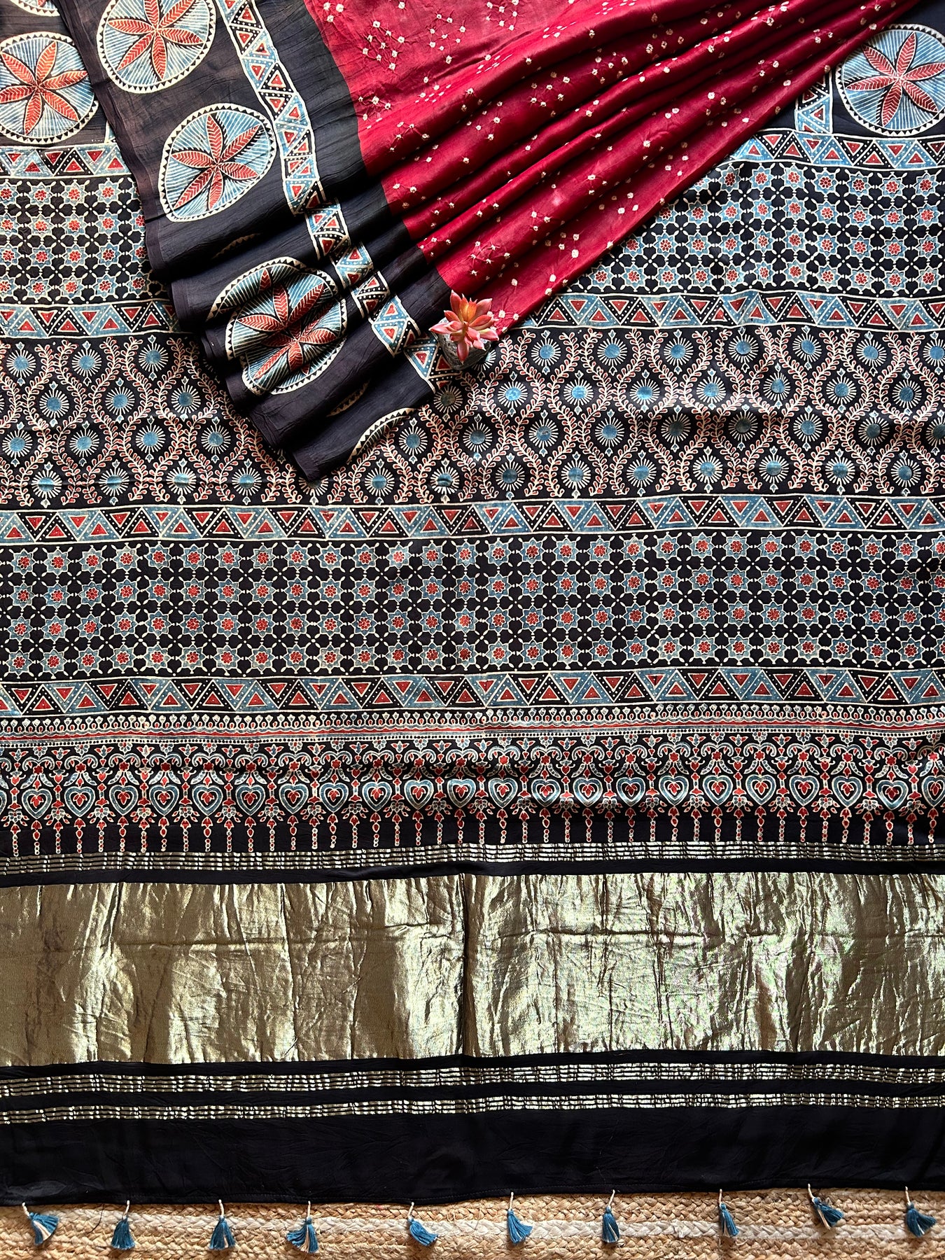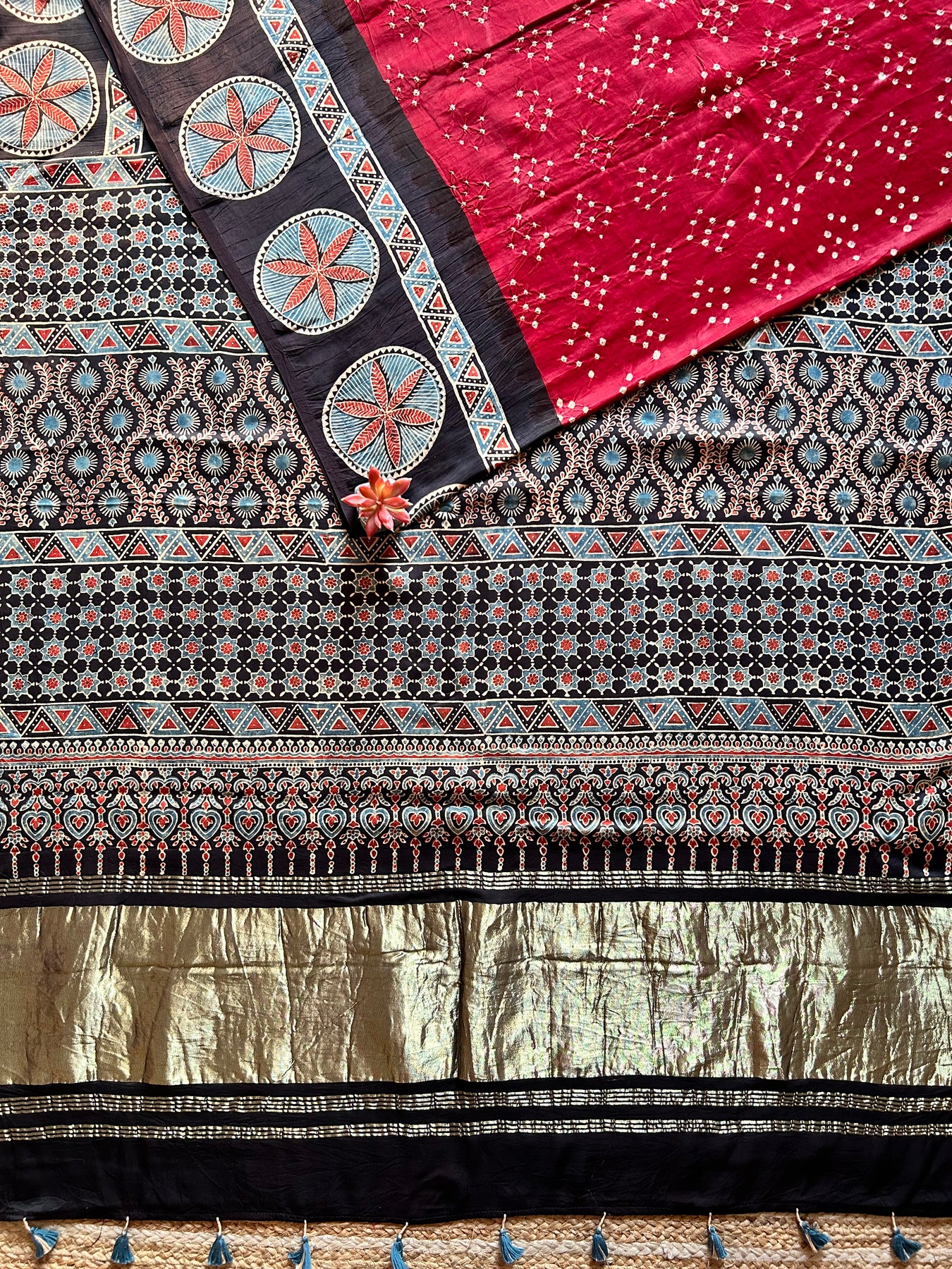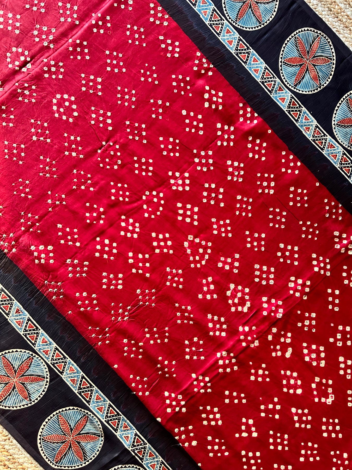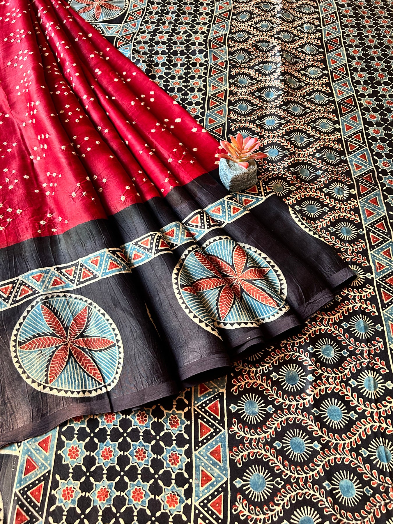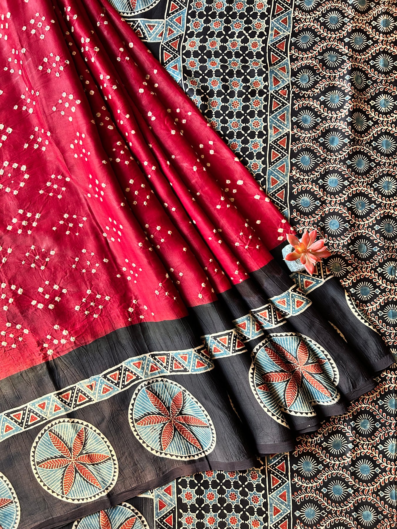 Handblock ajrakh print and designer bandhni craft with natural colors. |